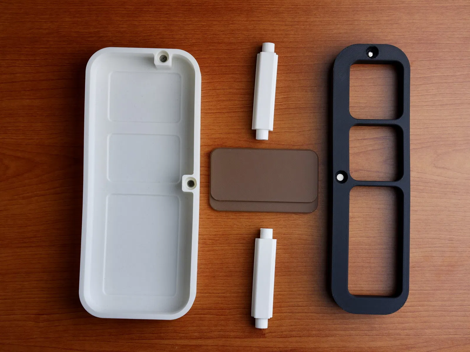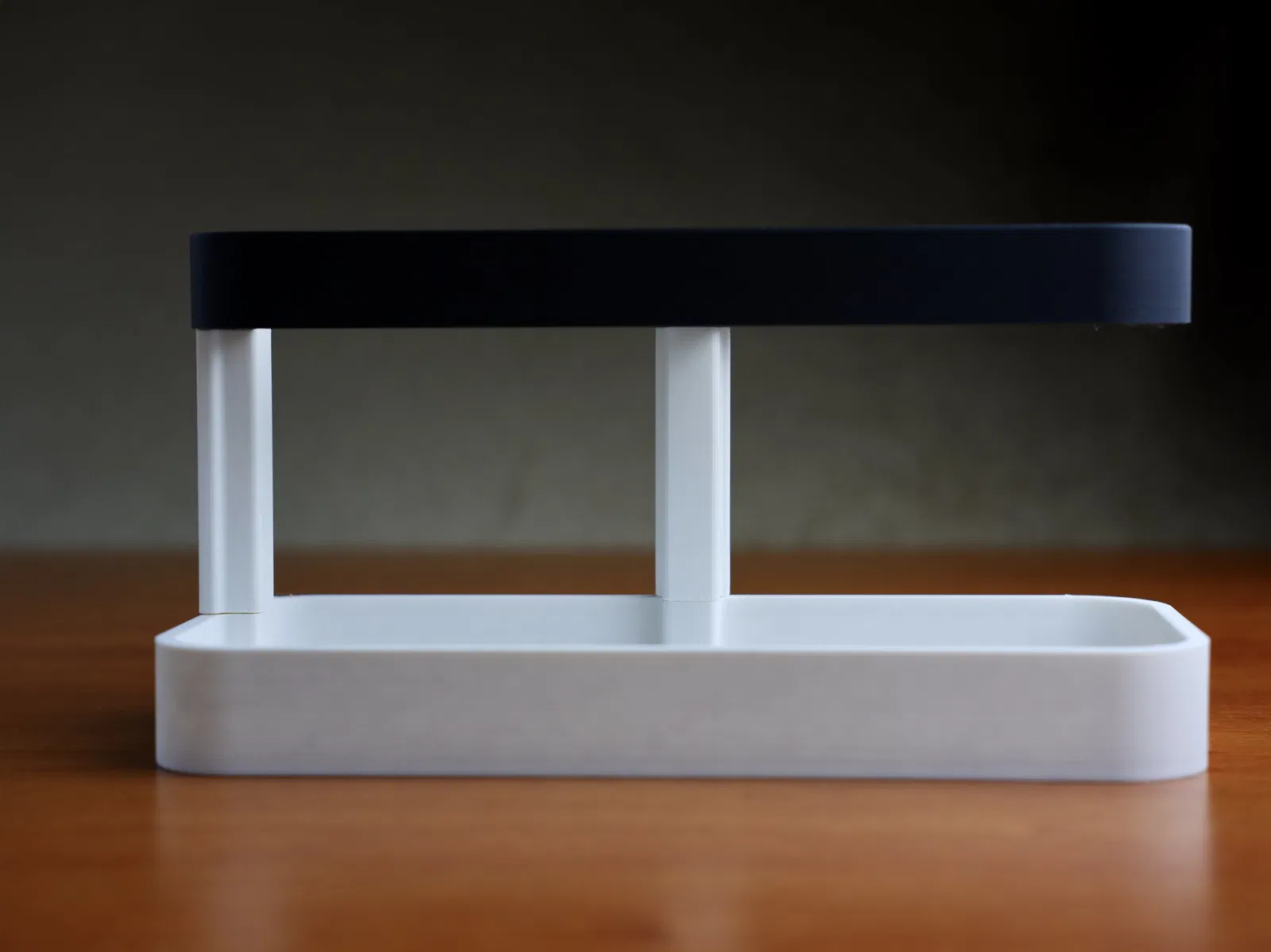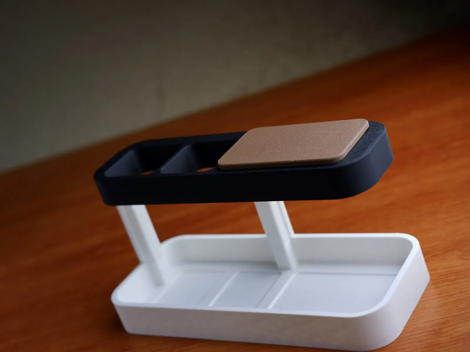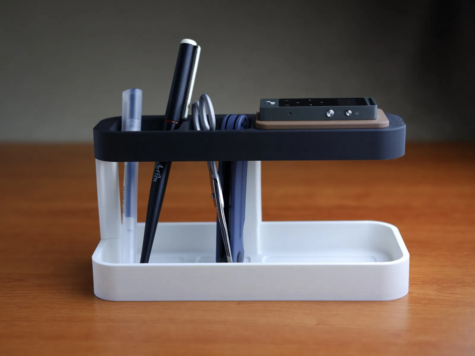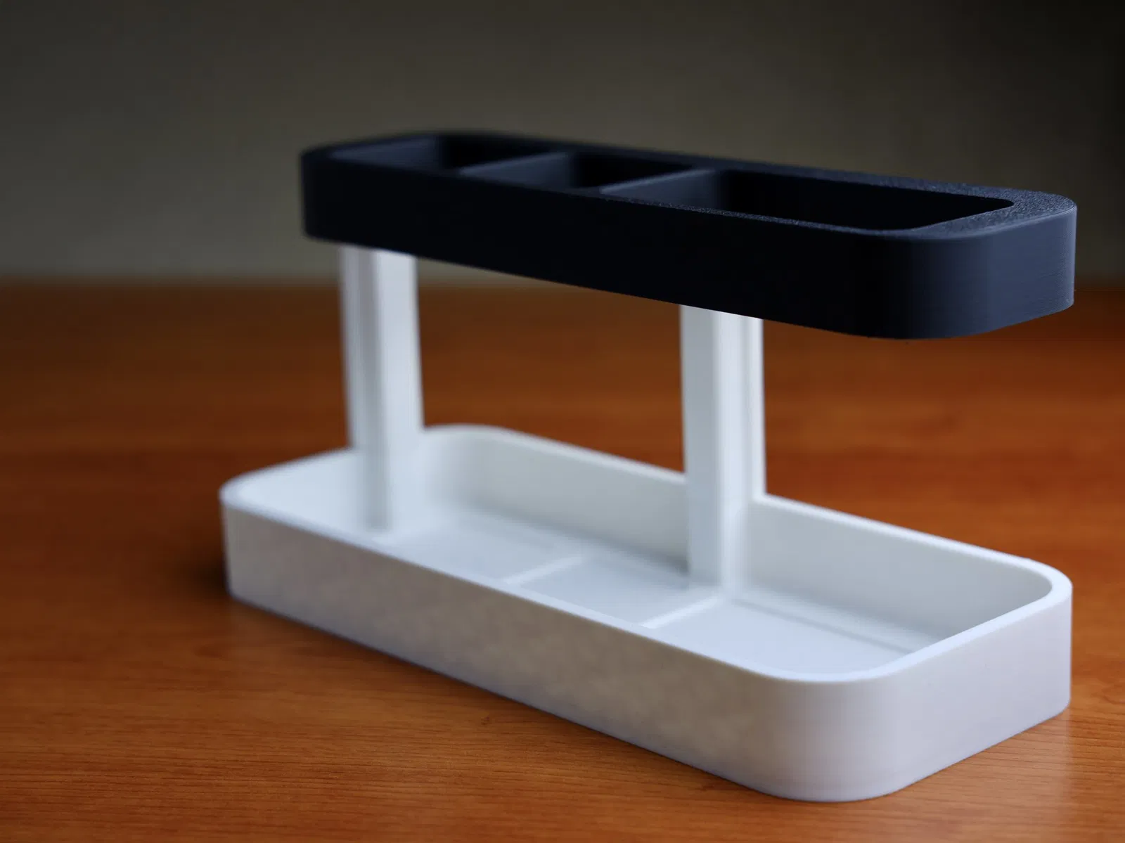 Khay đựng 2 tầng, in dạng module với các bộ phận có nam châm tùy chọn để cố định vị trí. Bao gồm đế, trên cùng, 2 trụ và kệ. Cần 8 viên nam châm 6x3mm và keo siêu dính để lắp ráp. Lưu ý chú ý cực tính nam châm và dung sai khi in.