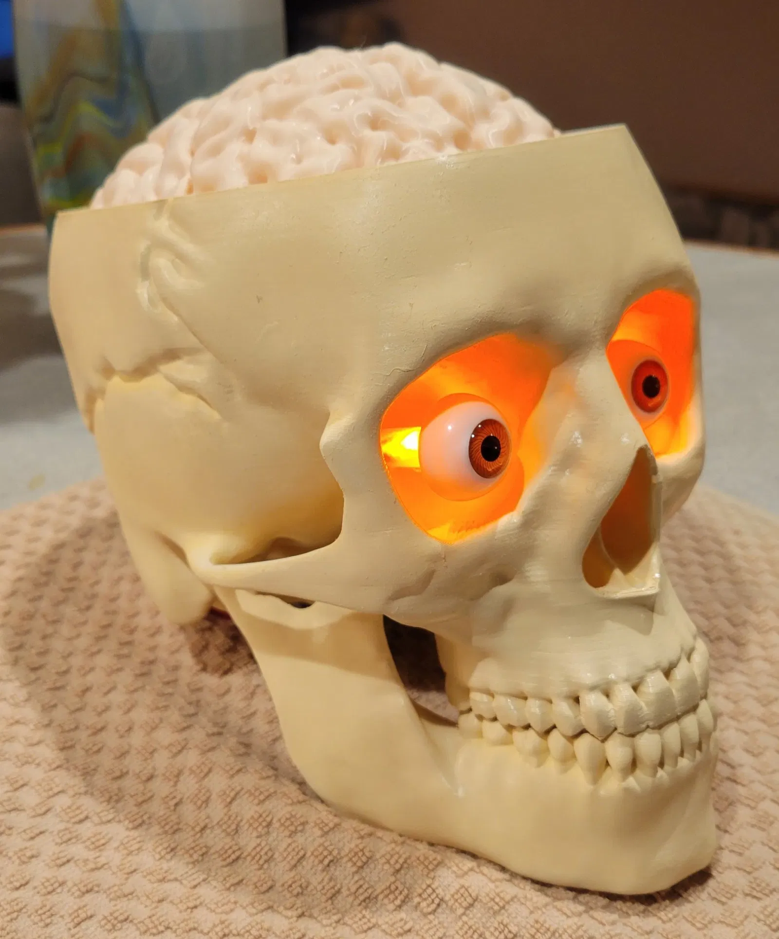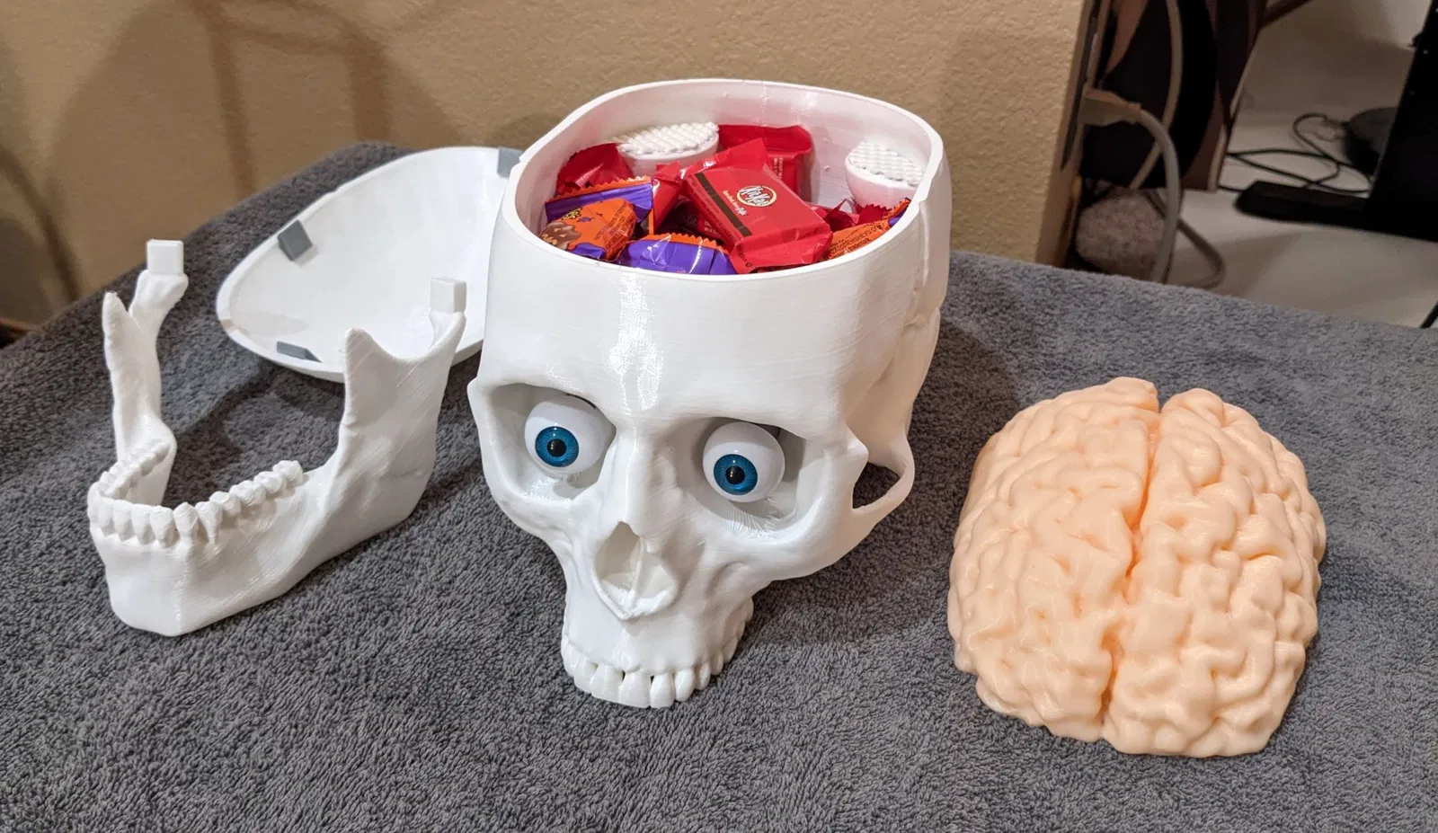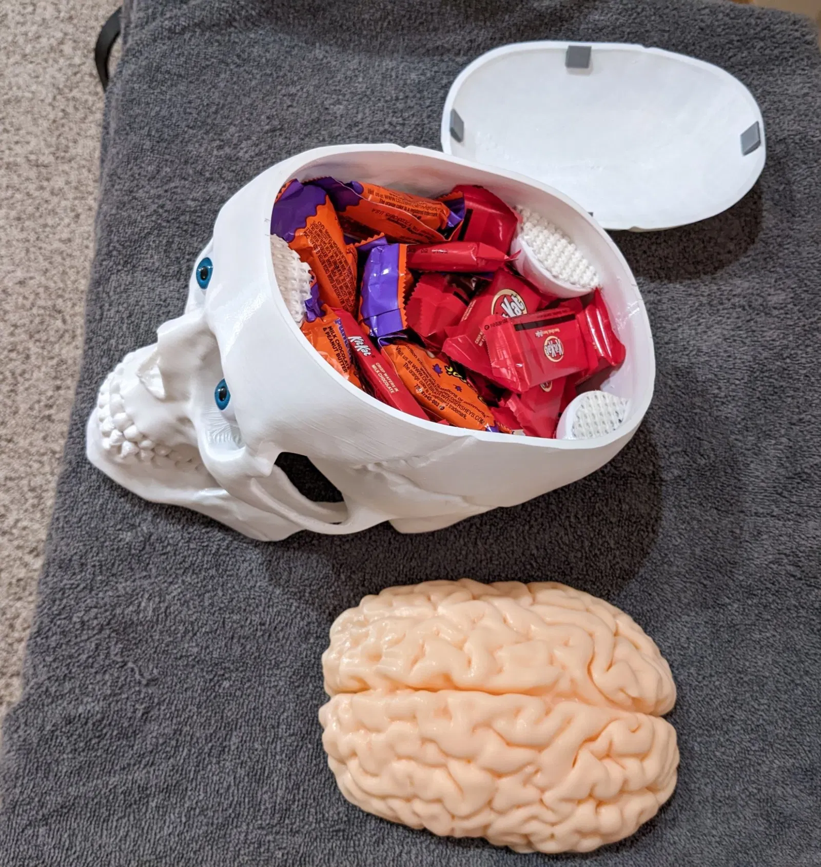 Thùng Đựng Kẹo Sọ Não (Có Thêm Phiên Bản Đèn) giúp bạn phát quà ma quái, trang trí hoặc làm thùng đựng đồ ăn vặt. Mô hình sọ não kích thước thật, dễ in, có tùy chọn thêm đèn LED tạo hiệu ứng rùng rợn. Có thể in thêm mũ sọ, hàm và tùy chỉnh mắt.