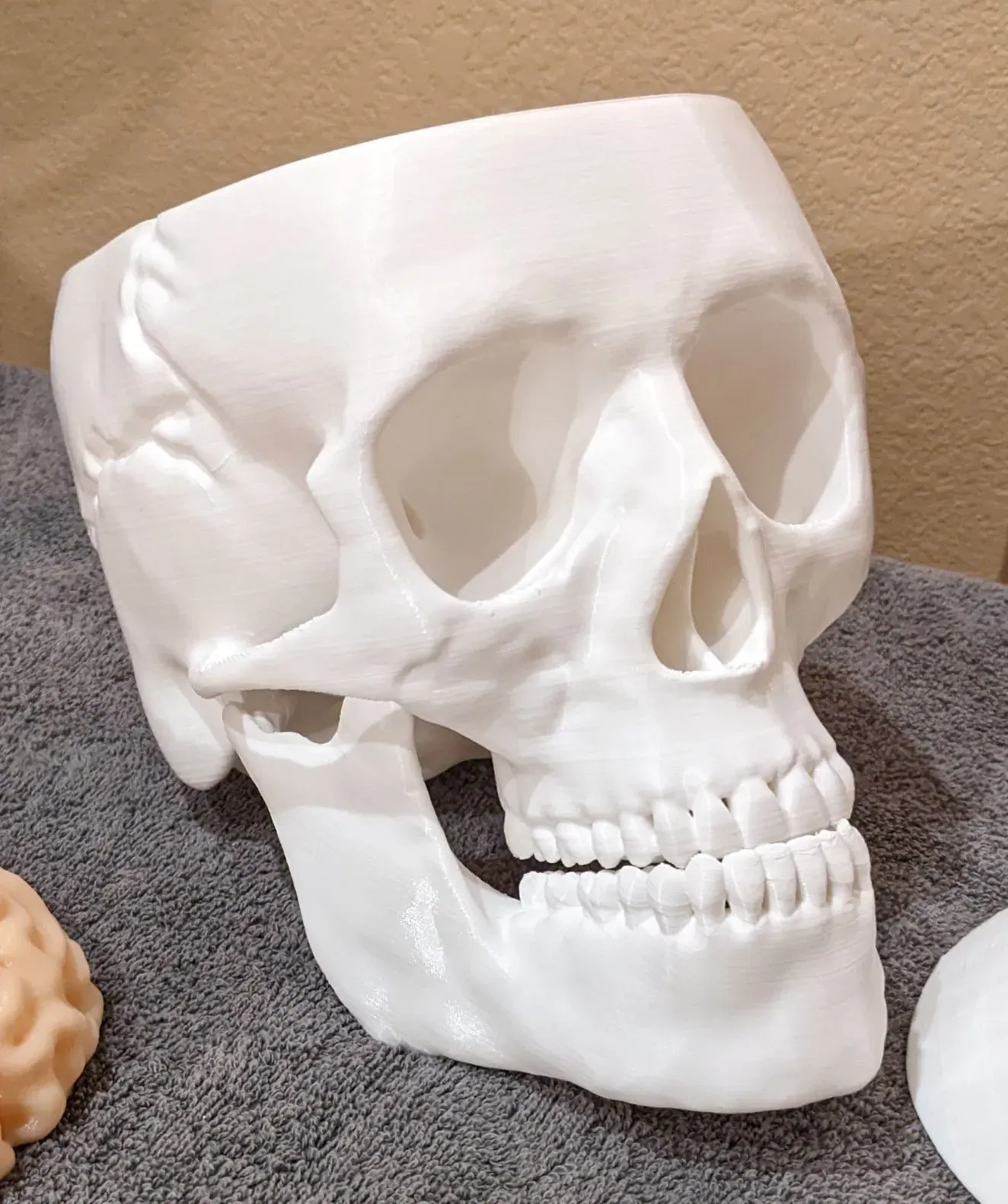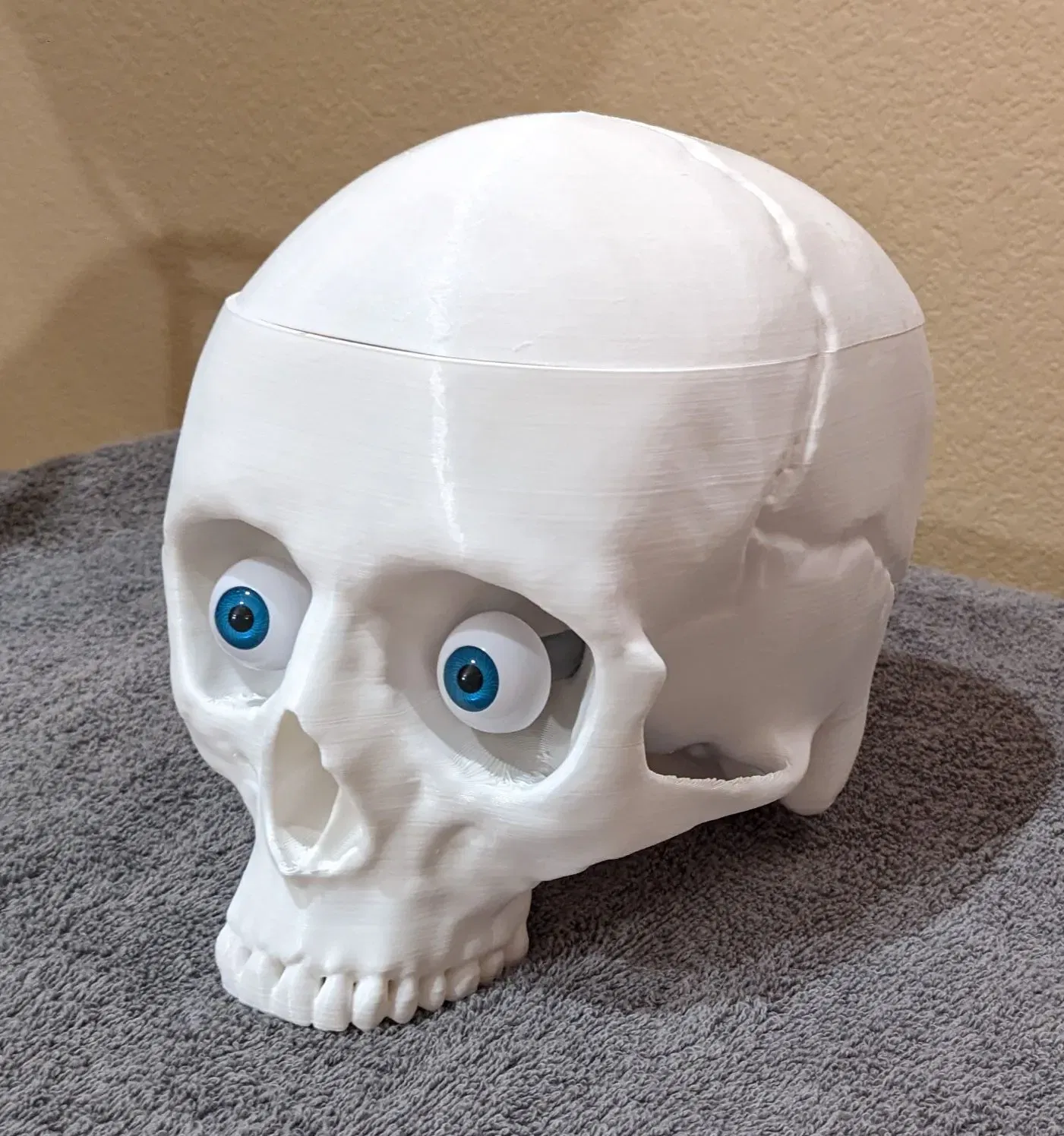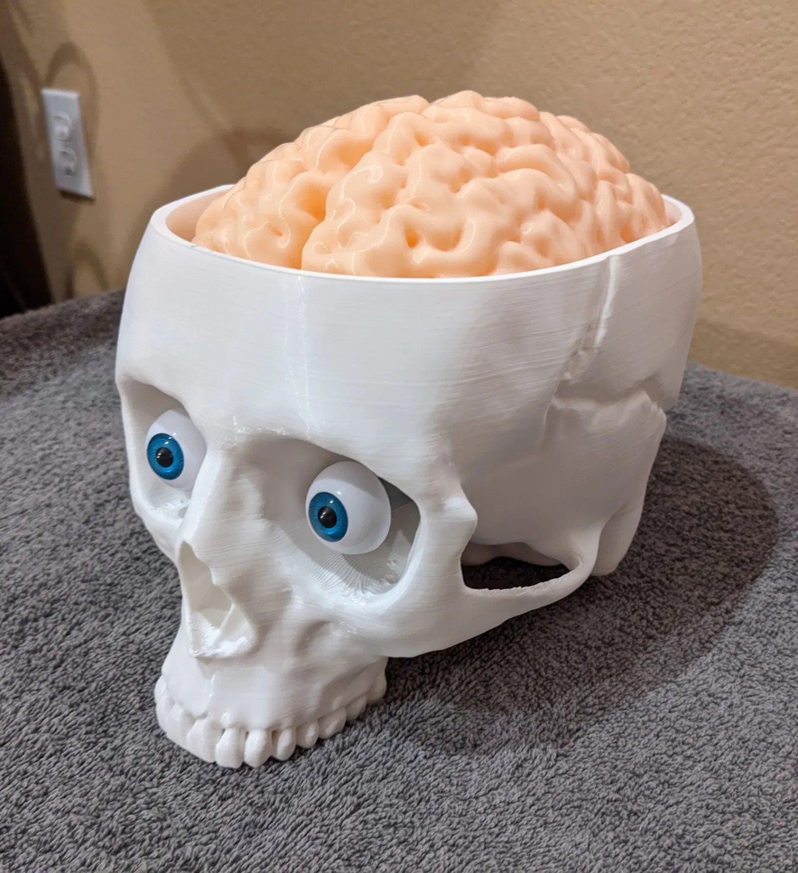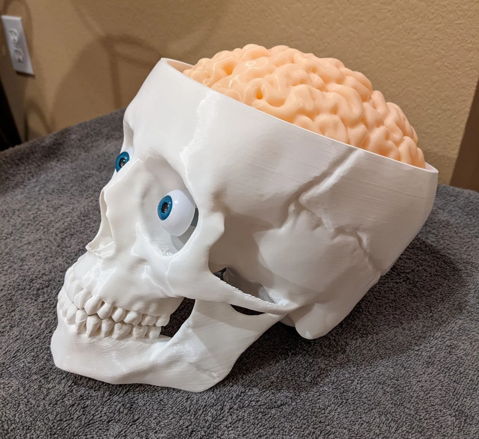 Phát quà với PHONG CÁCH trong Mùa Lễ hội ma quái! Để trưng bày hoặc dùng làm thùng đựng đồ ăn vặt vui nhộn các mùa khác. Bộ sọ và não với kích thước thật này được làm lại và thiết kế để dễ in và dễ cầm khi di chuyển. Thêm đèn vào file mô hình Skull With Lighted Eyes là hoàn toàn tùy chọn. Tuy nhiên, thêm đôi mắt trôi nổi TẠO hiệu ứng rất thú vị và rất được khuyến khích. Nếu bạn bỏ qua hoàn toàn phần mắt, hãy in file skull_no_eyes và bỏ qua việc in các trụ mắt hoặc ống dẫn mắt. Các ống 4mm chạy bên trong từ các lỗ gắn trụ mắt đến phía sau đáy sọ, nơi có một bề mặt phẳng (đủ rộng cho hộp pin 2xAA hoặc giải pháp khác) để dán hoặc dán velcro pin và công tắc. Một bộ pin SẼ lồi ra khỏi hình dạng của sọ, vì tôi không muốn giảm dung tích kẹo để chứa vừa). Đèn LED 5mm vừa vặn qua các trụ mắt. Tôi khuyên bạn nên xoắn dây +/- để tạo độ cứng khi chạy qua, và dùng ống co nhiệt (hoặc giải pháp khác) nối các đầu dây lại với nhau để chúng trượt qua dễ dàng hơn. Tôi thích điều chỉnh LED bên trong phần giữa hoặc phía sau trụ mắt để chiếu sáng hốc mắt cũng như tròng mắt, sau đó dùng keo nến nóng (hoặc khác) dán lỗ thoát dây phía dưới (KHÔNG phải đầu hốc mắt) để cố định khoảng cách đó. Remix từ mẫu sọ có mắt sáng lớn trước đó của tôi https://www.thingiverse.com/thing:5506102 mẫu này là một bản remix khổng lồ từ Human skull của Makerbot https://www.thingiverse.com/thing:622390 Brain được remix nhiều từ Wigglememore Sọ đứng vững và cân bằng ngay cả khi không có hàm nếu bạn muốn bỏ qua việc in hàm. Mũ sọ không cần thiết nếu bạn muốn bộ não lộ ra toàn bộ thời gian. In bộ não bằng sợi màu thịt/da/màu be/xám nhạt sẽ làm nó NỔI BẬT, đặc biệt nếu không sơn sọ. In bằng ABS hoặc ASA cho phép làm mịn bằng axeton để có vẻ ngoài nhờn bóng. Sử dụng PLA và lớp phủ nhựa nhẹ cũng trông rất tuyệt. 3 trong số các hình ảnh là Sọ, mũ sọ với phần hỗ trợ vẫn còn gắn vào để bạn thấy cách chúng hoàn thành. Bộ não: Khuyến nghị 3 lớp tường với đầu phun 0.4mm (hoặc đầu phun 0.6mm và 2 lớp tường). Chiều cao lớp thấp nhất bạn cảm thấy thoải mái, để giảm hiệu ứng đảo. Độ cao 0.16mm hoặc thấp hơn trông đẹp. Không cần hỗ trợ. 15%+ infill để hỗ trợ phần trên. Tôi sử dụng bộ chặn hỗ trợ làm bộ điều chỉnh chồng lên phần ba trên của bộ não, cho ra 15% cho hầu hết mô hình, và 25% cho phần trên. THÔNG TIN THÊM: Nếu bạn đã đặt hàng hoặc sử dụng Hatchbox ABS Beige cho bộ não, nó KHÔNG làm mịn bằng hơi tốt với tôi! (Hatchbox Black cũng vậy). Chải axeton lên bộ não ĐÃ tạo ra bề mặt bóng NHỜN. Vì vậy, tôi đề xuất chải nhẹ bằng axeton để có phương pháp nhanh hơn và dễ dàng hơn để đạt được hiệu ứng đáng sợ, GÌM GÌM :-) HOẶC in bằng PLA màu thịt/be và phủ bằng XTC-3D hoặc nhựa khác. Nó in dễ dàng hơn và trông nhờn bóng TUYỆT VỜI. SỌ: Các phiên bản có mắt (có đèn hay không tùy chọn) VÀ không có hốc mắt (trong trường hợp bạn không muốn làm cho nó đáng sợ với mắt và đồ thủ công). Đã cắt lát với độ dày tường 1.2mm. Vì vậy, 3 lớp tường cho đầu phun 0.4mm, nhưng tôi thích đầu phun 0.6mm cho các bản in lớn và 2 lớp tường (chấp nhận được vì không có chi tiết nhỏ), tiết kiệm rất nhiều thời gian. Mô hình hóa cho độ nghiêng hỗ trợ ở 60 độ. Cài đặt thấp hơn sẽ dẫn đến nhiều vật liệu và thời gian không cần thiết hơn. KHUYÊN DÙNG TREE SUPPORT hơn là loại thông thường. Hãy chắc chắn in ngược và vành sọ được đặt trên mặt bàn làm việc. 4 lớp đáy và 4 lớp trên cùng. Sử dụng Bộ chặn hỗ trợ từ nơi bắt đầu kênh dây ở phía sau hốc mắt đến nơi kênh thoát ra ở phía sau đáy sọ tại chỗ cắt pin. Sử dụng 3 miếng vật liệu chống trượt mỏng dán vào các kệ bộ não sẽ giúp loại bỏ tiếng lạch cạch khi đặt và di chuyển. Mắt sọ: Nếu bạn chọn phiên bản có mắt (có hốc để gắn trụ), bạn có thể sử dụng file Eye Posts để bảo vệ các lỗ này khi sơn. Trụ vòng mắt vừa vặn vào các lỗ này và bạn có thể gắn file Mắt vào đó. Chúng rỗng và vừa cho đèn LED 5mm. Phiên bản trong ảnh sử dụng mắt 26mm từ Amazon. https://a.co/d/8NARPsz và chỉ có bộ màu NÂU hiển thị ánh sáng đồng tử. Những thứ này trông giống hệt với giá rẻ hơn 5 đô la https://a.co/d/ezhA97u và tôi vừa kiểm tra: Nhiều mắt hơn, nhưng không có mắt nào trong số chúng hiển thị ánh sáng đồng tử. Vì vậy, nếu điều đó quan trọng với bạn, hãy chọn bộ đầu tiên. Giá hơi đắt cho đôi mắt màu nâu, nhưng xứng đáng cho nhiều năm đáng sợ. Hoặc, sử dụng file Eye Blanks và dán mắt của bạn vào chúng bằng keo nóng để tạo ra đôi mắt nhìn lệch tâm. Thật vui nếu nó nhìn sang trái, sang phải, lên trên, hoặc thậm chí là mắt lác! Ống mắt được thêm vào trường hợp bạn lắp đèn LED trước khi sơn và muốn bảo vệ trong quá trình sơn, hoặc in trong suốt và s