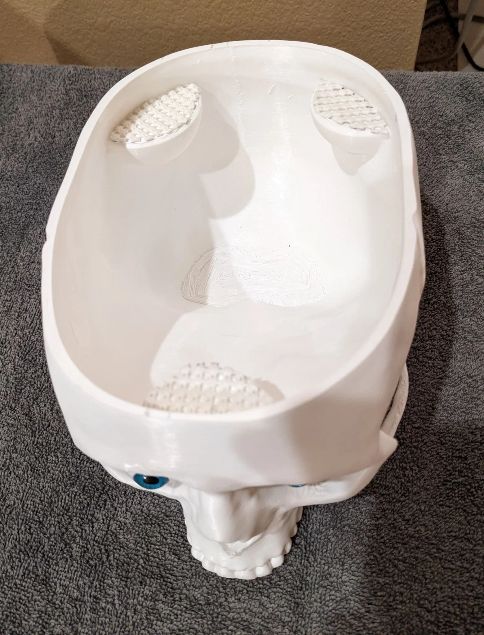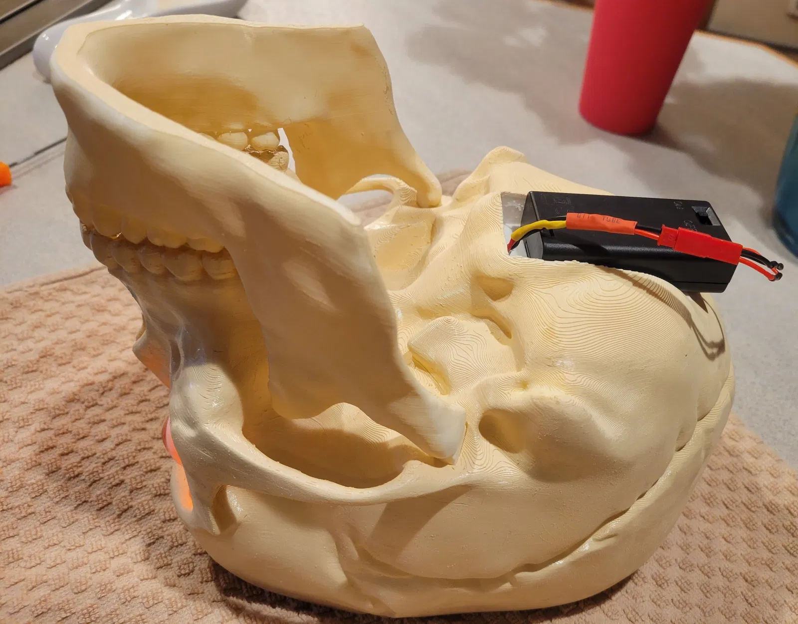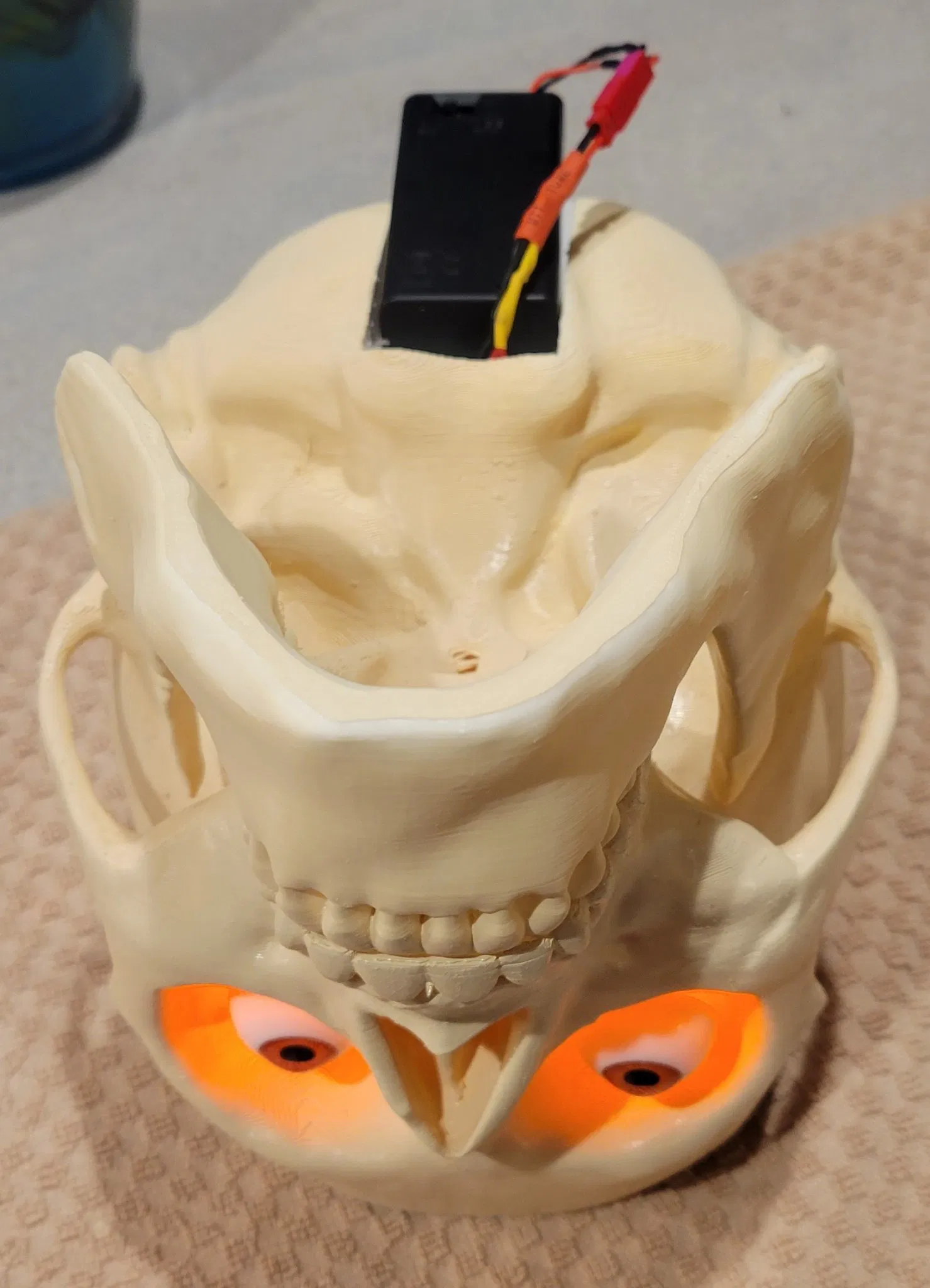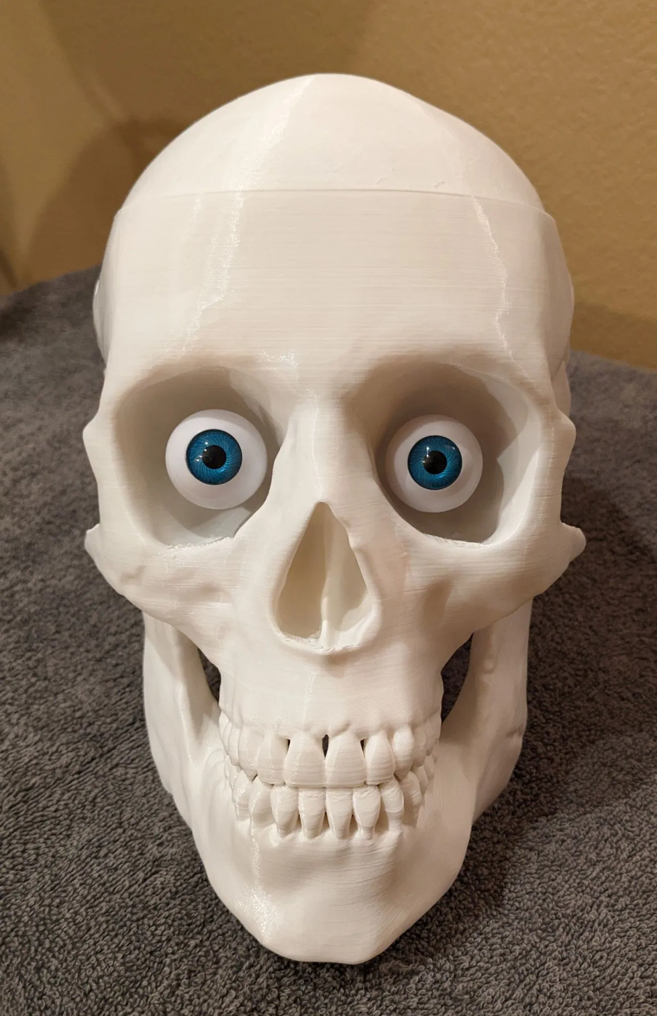 Phát quà với PHONG CÁCH trong Mùa Lễ hội ma quái! Để trưng bày hoặc dùng làm thùng đựng đồ ăn vặt vui nhộn các mùa khác. Bộ sọ và não với kích thước thật này được làm lại và thiết kế để dễ in và dễ cầm khi di chuyển. Thêm đèn vào file mô hình Skull With Lighted Eyes là hoàn toàn tùy chọn. Tuy nhiên, thêm đôi mắt trôi nổi TẠO hiệu ứng rất thú vị và rất được khuyến khích. Nếu bạn bỏ qua hoàn toàn phần mắt, hãy in file skull_no_eyes và bỏ qua việc in các trụ mắt hoặc ống dẫn mắt. Các ống 4mm chạy bên trong từ các lỗ gắn trụ mắt đến phía sau đáy sọ, nơi có một bề mặt phẳng (đủ rộng cho hộp pin 2xAA hoặc giải pháp khác) để dán hoặc dán velcro pin và công tắc. Một bộ pin SẼ lồi ra khỏi hình dạng của sọ, vì tôi không muốn giảm dung tích kẹo để chứa vừa). Đèn LED 5mm vừa vặn qua các trụ mắt. Tôi khuyên bạn nên xoắn dây +/- để tạo độ cứng khi chạy qua, và dùng ống co nhiệt (hoặc giải pháp khác) nối các đầu dây lại với nhau để chúng trượt qua dễ dàng hơn. Tôi thích điều chỉnh LED bên trong phần giữa hoặc phía sau trụ mắt để chiếu sáng hốc mắt cũng như tròng mắt, sau đó dùng keo nến nóng (hoặc khác) dán lỗ thoát dây phía dưới (KHÔNG phải đầu hốc mắt) để cố định khoảng cách đó. Remix từ mẫu sọ có mắt sáng lớn trước đó của tôi https://www.thingiverse.com/thing:5506102 mẫu này là một bản remix khổng lồ từ Human skull của Makerbot https://www.thingiverse.com/thing:622390 Brain được remix nhiều từ Wigglememore Sọ đứng vững và cân bằng ngay cả khi không có hàm nếu bạn muốn bỏ qua việc in hàm. Mũ sọ không cần thiết nếu bạn muốn bộ não lộ ra toàn bộ thời gian. In bộ não bằng sợi màu thịt/da/màu be/xám nhạt sẽ làm nó NỔI BẬT, đặc biệt nếu không sơn sọ. In bằng ABS hoặc ASA cho phép làm mịn bằng axeton để có vẻ ngoài nhờn bóng. Sử dụng PLA và lớp phủ nhựa nhẹ cũng trông rất tuyệt. 3 trong số các hình ảnh là Sọ, mũ sọ với phần hỗ trợ vẫn còn gắn vào để bạn thấy cách chúng hoàn thành. Bộ não: Khuyến nghị 3 lớp tường với đầu phun 0.4mm (hoặc đầu phun 0.6mm và 2 lớp tường). Chiều cao lớp thấp nhất bạn cảm thấy thoải mái, để giảm hiệu ứng đảo. Độ cao 0.16mm hoặc thấp hơn trông đẹp. Không cần hỗ trợ. 15%+ infill để hỗ trợ phần trên. Tôi sử dụng bộ chặn hỗ trợ làm bộ điều chỉnh chồng lên phần ba trên của bộ não, cho ra 15% cho hầu hết mô hình, và 25% cho phần trên. THÔNG TIN THÊM: Nếu bạn đã đặt hàng hoặc sử dụng Hatchbox ABS Beige cho bộ não, nó KHÔNG làm mịn bằng hơi tốt với tôi! (Hatchbox Black cũng vậy). Chải axeton lên bộ não ĐÃ tạo ra bề mặt bóng NHỜN. Vì vậy, tôi đề xuất chải nhẹ bằng axeton để có phương pháp nhanh hơn và dễ dàng hơn để đạt được hiệu ứng đáng sợ, GÌM GÌM :-) HOẶC in bằng PLA màu thịt/be và phủ bằng XTC-3D hoặc nhựa khác. Nó in dễ dàng hơn và trông nhờn bóng TUYỆT VỜI. SỌ: Các phiên bản có mắt (có đèn hay không tùy chọn) VÀ không có hốc mắt (trong trường hợp bạn không muốn làm cho nó đáng sợ với mắt và đồ thủ công). Đã cắt lát với độ dày tường 1.2mm. Vì vậy, 3 lớp tường cho đầu phun 0.4mm, nhưng tôi thích đầu phun 0.6mm cho các bản in lớn và 2 lớp tường (chấp nhận được vì không có chi tiết nhỏ), tiết kiệm rất nhiều thời gian. Mô hình hóa cho độ nghiêng hỗ trợ ở 60 độ. Cài đặt thấp hơn sẽ dẫn đến nhiều vật liệu và thời gian không cần thiết hơn. KHUYÊN DÙNG TREE SUPPORT hơn là loại thông thường. Hãy chắc chắn in ngược và vành sọ được đặt trên mặt bàn làm việc. 4 lớp đáy và 4 lớp trên cùng. Sử dụng Bộ chặn hỗ trợ từ nơi bắt đầu kênh dây ở phía sau hốc mắt đến nơi kênh thoát ra ở phía sau đáy sọ tại chỗ cắt pin. Sử dụng 3 miếng vật liệu chống trượt mỏng dán vào các kệ bộ não sẽ giúp loại bỏ tiếng lạch cạch khi đặt và di chuyển. Mắt sọ: Nếu bạn chọn phiên bản có mắt (có hốc để gắn trụ), bạn có thể sử dụng file Eye Posts để bảo vệ các lỗ này khi sơn. Trụ vòng mắt vừa vặn vào các lỗ này và bạn có thể gắn file Mắt vào đó. Chúng rỗng và vừa cho đèn LED 5mm. Phiên bản trong ảnh sử dụng mắt 26mm từ Amazon. https://a.co/d/8NARPsz và chỉ có bộ màu NÂU hiển thị ánh sáng đồng tử. Những thứ này trông giống hệt với giá rẻ hơn 5 đô la https://a.co/d/ezhA97u và tôi vừa kiểm tra: Nhiều mắt hơn, nhưng không có mắt nào trong số chúng hiển thị ánh sáng đồng tử. Vì vậy, nếu điều đó quan trọng với bạn, hãy chọn bộ đầu tiên. Giá hơi đắt cho đôi mắt màu nâu, nhưng xứng đáng cho nhiều năm đáng sợ. Hoặc, sử dụng file Eye Blanks và dán mắt của bạn vào chúng bằng keo nóng để tạo ra đôi mắt nhìn lệch tâm. Thật vui nếu nó nhìn sang trái, sang phải, lên trên, hoặc thậm chí là mắt lác! Ống mắt được thêm vào trường hợp bạn lắp đèn LED trước khi sơn và muốn bảo vệ trong quá trình sơn, hoặc in trong suốt và s