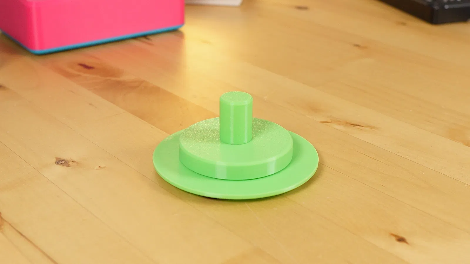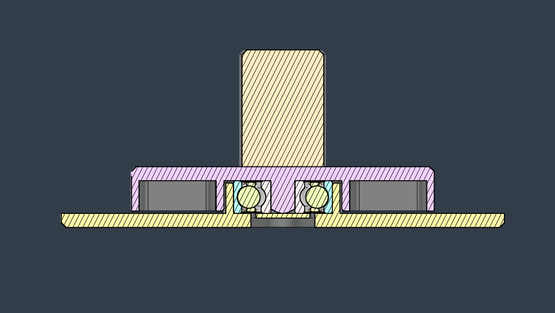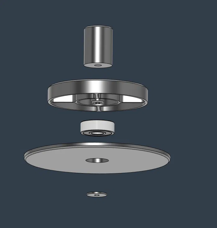 Để lắp ráp, bạn cần một vòng bi 8x22x7 mm (vòng bi bánh xe trượt ván tiêu chuẩn) và một vít máy m3 x 16mm. Gắn vòng bi vào phần dưới và sau đó gắn phần trên xuống. Nó sẽ vừa khít, nhưng không quá chặt. Sau đó, sử dụng vòng đệm và vít m3 luồn từ dưới lên vào chốt trung tâm phía trên. Tôi khuyên bạn nên thêm một vài chân cao su vào đáy để tăng độ bám cho mặt bàn của bạn.