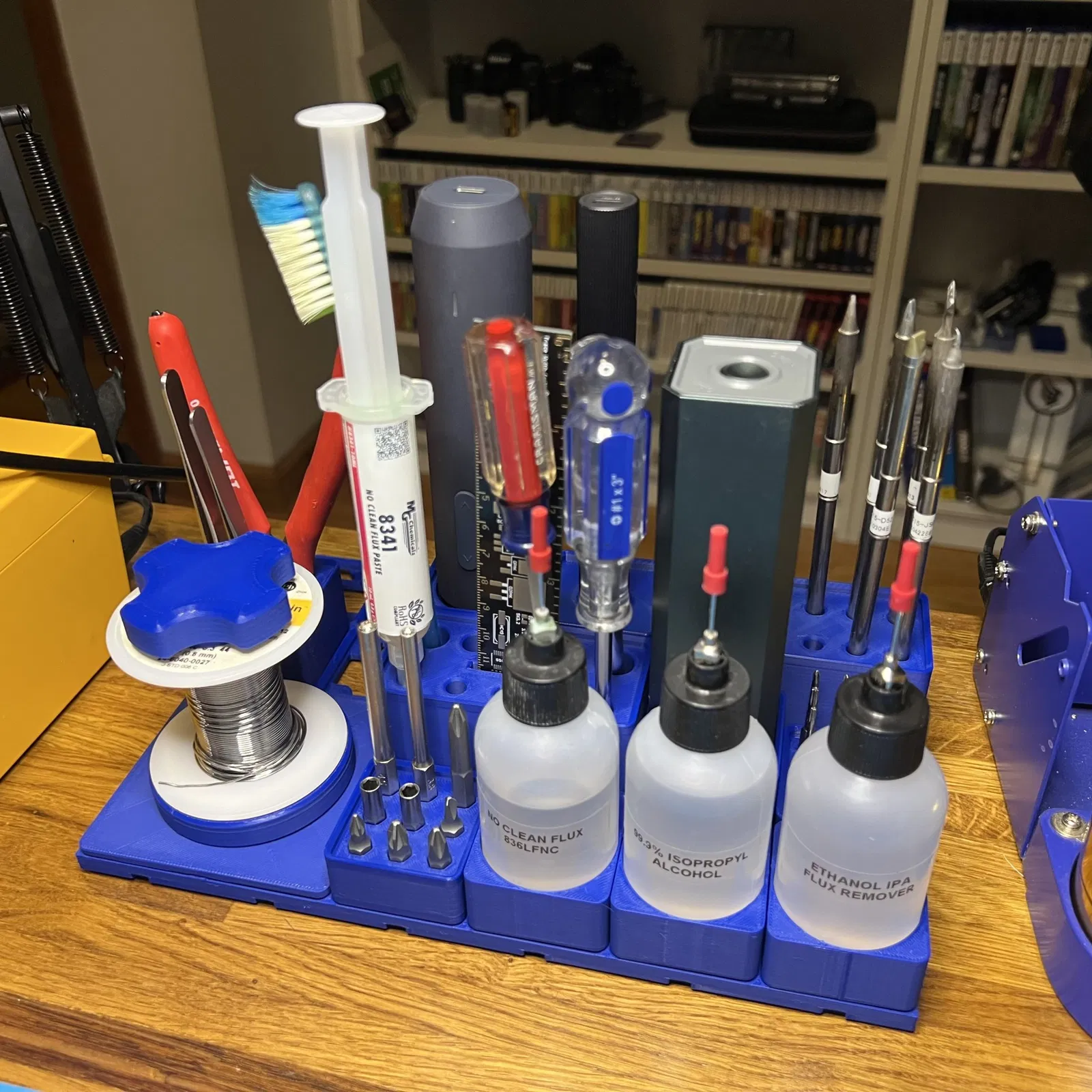 Bộ tổ chức trạm hàn Gridfinity này được thiết kế để chứa các dụng cụ hàn phổ biến. Bao gồm giá đỡ cuộn thiếc hàn, giá đỡ dung dịch, giá đỡ mũi vít, kìm, nhíp và nhiều hơn nữa. Tương thích với các tấm đế Gridfinity tiêu chuẩn.