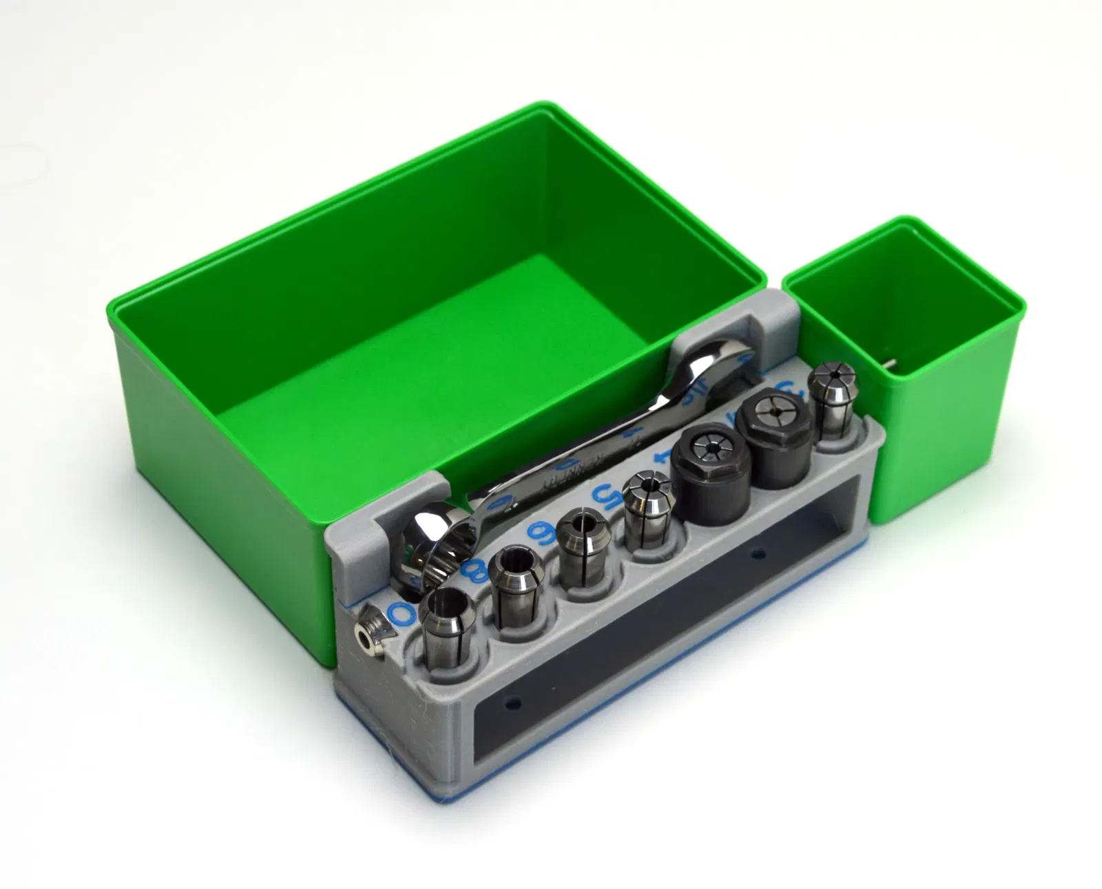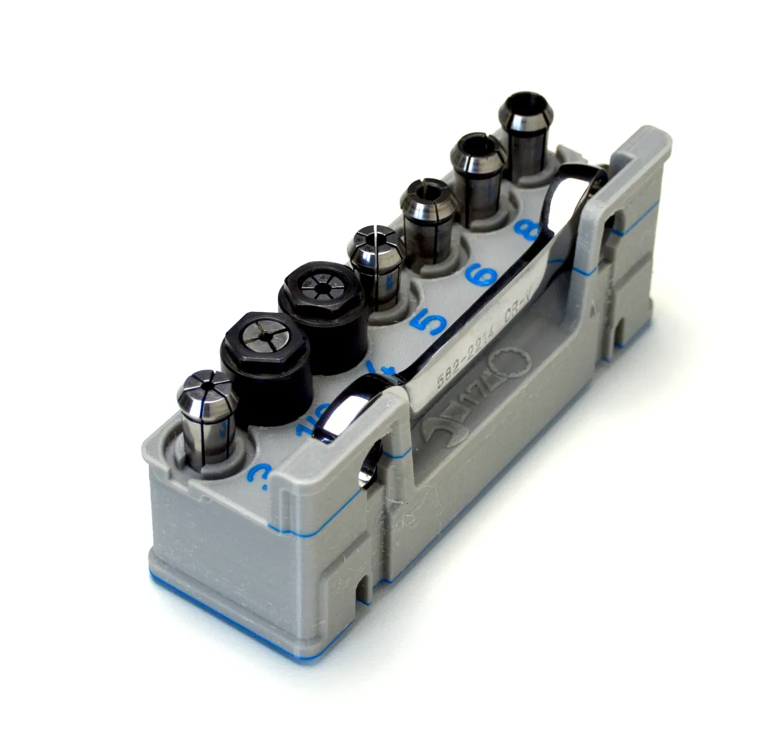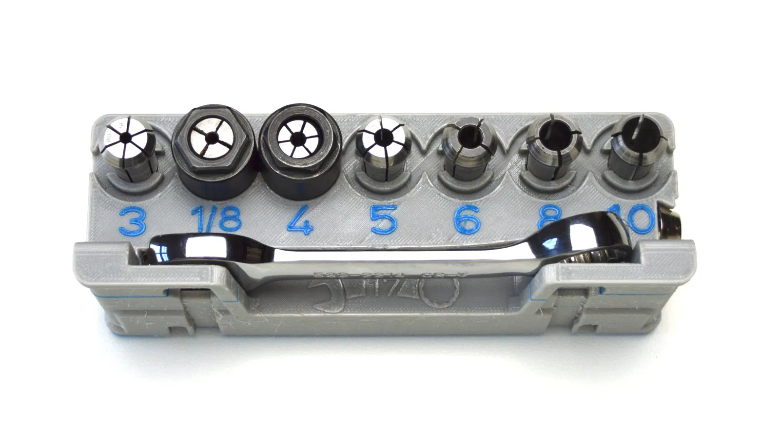 Tổ chức giữ collet đa năng cho các trục Kress, AMB, Isel, Mafell, Stepcraft. Bao gồm thông tin về các loại collet tương thích, các tùy chọn lắp đặt và vật liệu in ấn. Hỗ trợ in hai màu để hiển thị kích thước collet rõ ràng.
