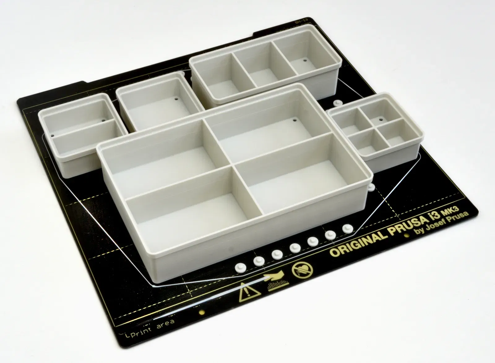 Trang này bao gồm 1. tổng quan về tất cả hộp chèn có thể xếp chồng - Tổng quan hộp chèn 2. tất cả các phụ kiện liên quan - Phụ kiện 3. mô tả về chân hộp chèn, phù hợp với mọi phiên bản - Chân hộp chèn 4. mô tả về hệ thống - Giới thiệu #### Tổng quan hộp chèn (những cái không có liên kết sẽ được tải lên) khuôn bằng chân chiều cao các biến thể vách ngăn (223) 1x1 52x52mm (~2"x2") chiều cao thứ ba 1x1 1x2 2x2 2x3 chiều cao bằng một nửa 1x1 1x2 2x2 2x2e 2x3 3x3 chiều cao đầy đủ 1x1 1x2 2x2 2x3 1x2   52x104mm (~2"x4") chiều cao thứ ba 1x1 1x2 1x3 1x4 2x1 2x2 2x3 2x4 chiều cao bằng một nửa 1x1 1x2 1x3 1x4 2x1 2x2 2x3 chiều cao đầy đủ 1x1 1x2 1x3 2x1 2x2 1x3   52x156mm (~2"x6") chiều cao thứ ba 1x1 1x2 1x3 1x4 2x1 2x2 2x3 chiều cao bằng một nửa 1x1 1x2 1x3 1x4 1x5 2x1 2x2 2x3 chiều cao đầy đủ 1x1 1x2 1x3 2x1 1x4 52x208mm (~2"x8") chiều cao thứ ba 1x1 1x3 2x1 2x2 chiều cao bằng một nửa 1x1 1x2 1x3 1x4 1x5 1x6 2x1 2x2 2x4 chiều cao đầy đủ 1x1 1x2 1x3 2x1 2x2   104x104mm (~4"x4") chiều cao thứ ba 1x1 1x2 1x3 1x4 1x5 2x2 2x3 2x4 chiều cao bằng một nửa 1x1 1x2 1x3 1x4 2x2 2x3 3x3 2x3e 3x3e chiều cao đầy đủ 1x1 1x2 2x2 2x3 2x3   104x156mm (~4"x6") chiều cao thứ ba 1x1 1x2 1x3 1x4 2x1 2x2 2x3 2x4 2x5 3x2 4x2 5x2 chiều cao bằng một nửa 1x1 1x2 1x3 2x1 2x2 2x3 2x4 2x5 3x1 3x2 4x2 5x2 2x3e 2x4e 2x5e 3x2e 4x2e 4x4e 5x2e chiều cao đầy đủ 1x1 2x1 1x3 1x4 1x2 2x2 2x3 1x3 2x4 104x208mm (~4"x~8") chiều cao thứ ba 1x1 1x2 2x1 2x2 chiều cao bằng một nửa 1x1 1x2 1x3 1x4 2x1 2x2 2x4 2x6 3x1 3x3 3x5 3x7 2x4e 3x5e chiều cao đầy đủ 1x1 2x1 2x2 2x3 2x4 2x4e 2x5 3x1 3x3   156x156mm (~6"x6") chiều cao thứ ba 1x1 1x2 2x2 3x3 3x4 4x4 4x5 5x6 chiều cao bằng một nửa 1x1 1x2 2x2 2x4 3x2 3x3 4x4 4x6 chiều cao đầy đủ 1x1 1x2 2x2 2x3 2x3e 3x3e 3x4 208x156mm (~8"x6") chiều cao thứ ba 1x1 2x1 1x2 2x2 3x4 4x4 4x8 4x6 chiều cao bằng một nửa 1x1 2x1 6x1 1x2 2x2 2x3 3x4 4x3 7x3 4x1 4x4 4x8 5x6 chiều cao đầy đủ 1x1 1x2 2x1 3x3 3x4 4x1 4x4 208x208mm (~8"x~8") chiều cao thứ ba 1x1 1x2 1x4 2x2 2x4 2x6 3x3 3x6 3x8 4x4 6x6 8x8 chiều cao bằng một nửa 1x1 1x2 2x2 2x4 2x6 3x3 3x5 4x4 4x6 5x5 6x8 8x10 chiều cao đầy đủ 1x1 1x2 2x2 3x3 3x4 3x4e 4x4 4x4e các phiên bản có sẵn trên thị trường dưới dạng bộ phận ép phun, và có lẽ dễ mua hơn in _các phiên bản e có chỗ cho nhãn giấy trong mỗi ngăn Chiều cao Tổng cộng có chân Có thể xếp chồng chiều cao thứ ba 24.8mm (~1") 18.8mm (~0.7") chiều cao bằng một nửa 34.2mm (~1.35") 28.2mm (~1.13") chiều cao đầy đủ 62.4mm (~2.46") 56.4mm (~2.22") Hộp chèn mục đích tùy chỉnh (4) custom x3 chiều cao đầy đủ chiều cao bằng một nửa Hộp chèn có thể xếp chồng vừa với Sortimo L-BOXX 2x2 chiều cao đầy đủ Hộp chèn vừa vặn cho hộp đựng đầu dây điện 2x2 2x3 chiều cao bằng một nửa Hộp đựng phụ kiện cho Khóa dây Paracord & Dụng cụ 1x3 chiều cao đầy đủ Giá đỡ collet cho Kress, AMB, Isel, Mafell, Stepcraft Một tổng quan với hình ảnh xem trước các bản hiển thị của tất cả các phiên bản cũng có thể có với công cụ tìm kiếm printables: https://www.printables.com/search/models?q=Stackable+Insertbox #### Phụ kiện Lưới vô hạn cho Hộp chèn có thể xếp chồng Bộ hoàn chỉnh để đổ đầy Hộp công cụ Auer với 33 hộp chèn Hộp khay mô-đun Bentō 弁当 Lưới/Tấm đế L-BOXX cho 42 hộp chèn ### Chân hộp chèn #### Nhật ký thay đổi 19-06-2022 v2.0 phát hành công khai ban đầu #### Sản xuất Đã kiểm tra với vòi phun 0.25, 0.40mm, vật liệu ABS và PETG; in không cần hỗ trợ #### Lắp ráp Chỉ cần kẹp các chân đơn vào các lỗ ở đáy hộp. Thông thường, cần bốn chân cho mỗi hộp. Để có độ cứng thêm, hãy cố định chúng bằng một giọt keo hoặc dung môi phù hợp từ phía trên. ### Giới thiệu Thùng màu xanh là loại cao 1x1 cao cấp được sản xuất công nghiệp để so sánh Kích thước tiêu chuẩn cho hộp được đưa ra theo đơn vị cho khuôn bằng chân: * một đơn vị là 52mm (~2")