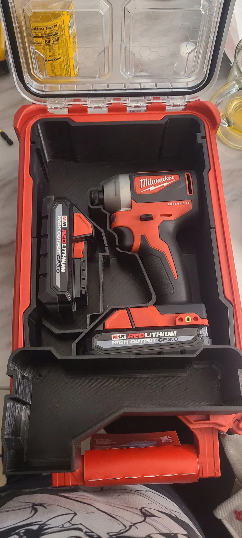 Khay đựng cho máy siết bu lông Milwaukee 2850-20 và thêm 1 pin dự phòng. Được thiết kế cho thợ điện, in bằng PETG với thời gian 17 tiếng ở tốc độ 500mm/s.