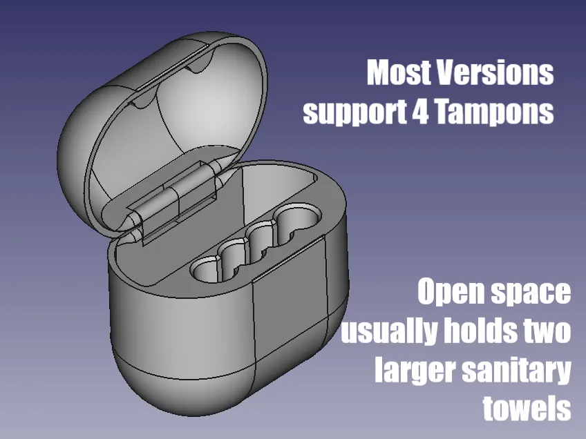 Bốn kích cỡ khác nhau được cung cấp có thể chứa 3-4 băng vệ sinh dạng ống và thường ít nhất hai băng vệ sinh/miếng lót, nghĩa là bất cứ thứ gì mà phụ nữ có thể cần trong một ngày trong kỳ kinh nguyệt. Hộp đựng này mang đến một cách tiện dụng, nhỏ gọn và khá thời trang để mang theo các sản phẩm vệ sinh này một cách kín đáo. Điều này làm cho hộp đựng này trở nên hoàn hảo để mang trong ví hoặc cất trong xe phòng trường hợp khẩn cấp. Do đó, nó cũng phù hợp như một món quà chu đáo và hữu ích cho bất kỳ phụ nữ trẻ nào.