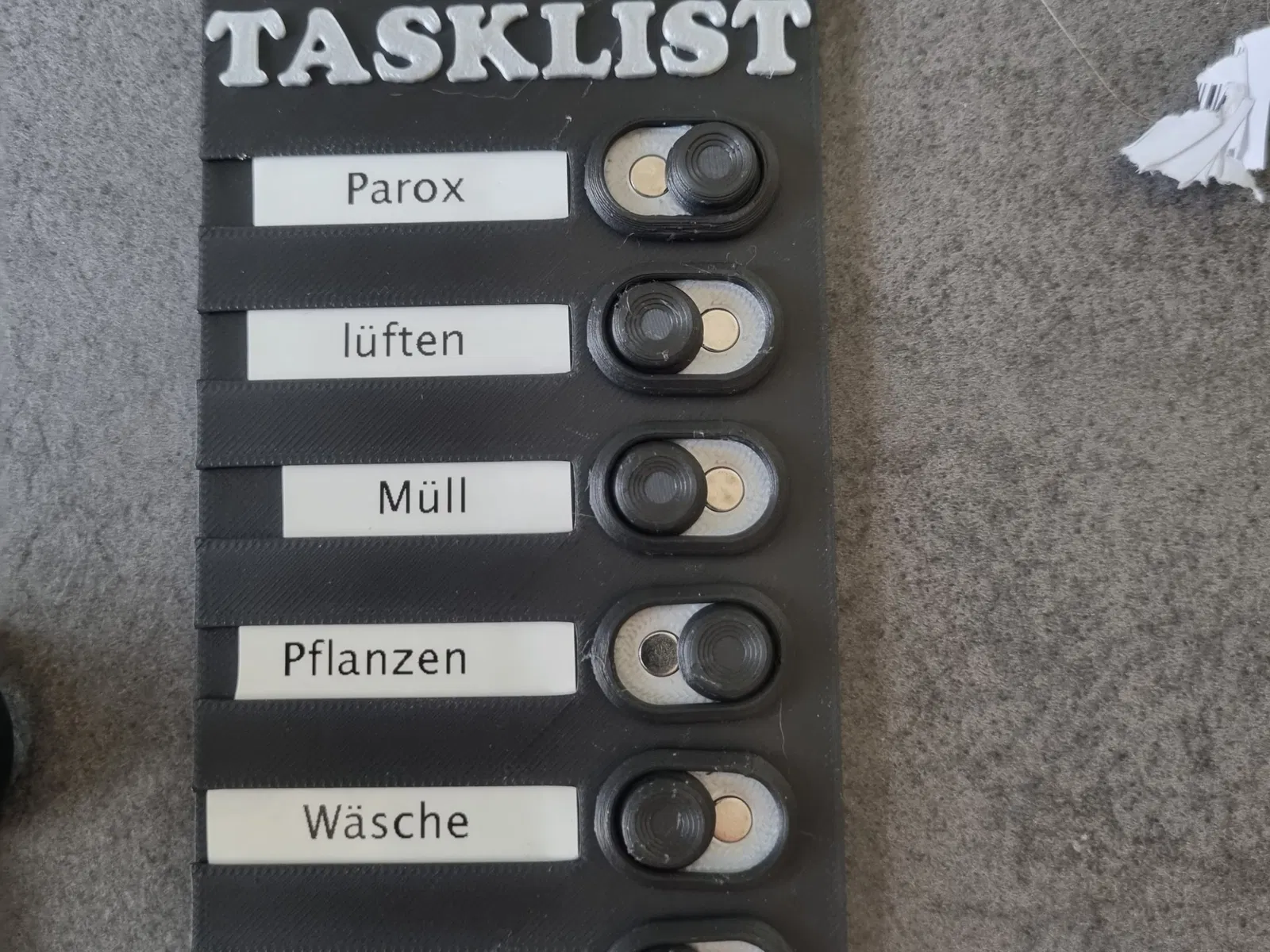 remix đầu tiên của tôi hơi lớn và các nút nổi bật khá xa. Vì vậy, tôi đã thu nhỏ toàn bộ danh sách và trực tiếp chèn phần dưới của các nút nhấn vào đế. Vì phần nút bây giờ có kích thước 70%, kích thước nam châm cũng đã được điều chỉnh một chút để phù hợp. Các lỗ sẽ phù hợp với nam châm tròn 5x2 như những cái này: https://www.amazon.de/NeoMagNova-Magnete-Magnettafel-Whiteboard-K%C3%BChlschrank/dp/B0837YQ1WX/ref=sr_1_5?__mk_de_DE=%C3%85M%C3%85%C5%BD%C3%95%C3%91&crid=AUA75LGFUREZ&keywords=magnet+5x2&qid=1655136130&sprefix=magnet+5x2%2Caps%2C80&sr=8-5 nếu cần kích thước nam châm khác, tôi có thể tạo một biến thể tất nhiên. #### Hướng dẫn in không cần hỗ trợ. Chỉ cần in đế và 7x nắp và nút và chèn nam châm như được trình bày trong video gốc từ o.g. clicky fidget: https://www.f3d.vn/3d-model/157773-itty-bitty-fidget-mau-in-3d-sieu-nho Các chèn nhãn cần các dải rộng 9mm. Sử dụng máy tạo nhãn hoặc chỉ giấy in đơn giản theo ý bạn Cập nhật 14 tháng 8 năm 2023: một đế không có tiêu đề “Danh sách công việc” hiện cũng có sẵn