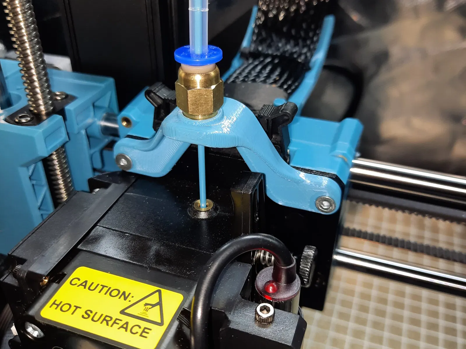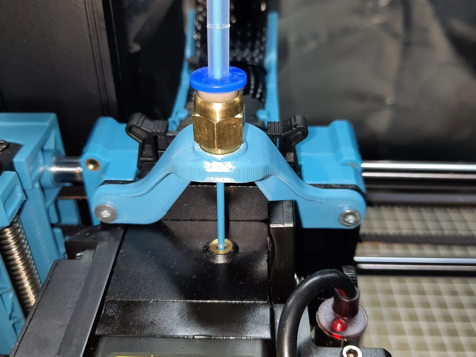 Tui dùng cái đế này kết hợp với hướng dẫn xoắn ống PTFE dạng kẹp, để dẫn ống PTFE Reverse Bowden từ hộp đựng khô hoặc hộp lưu trữ của tui, qua Khung ống PTFE thẳng lên trên bộ đùn và đi vào đế gắn bộ đùn.