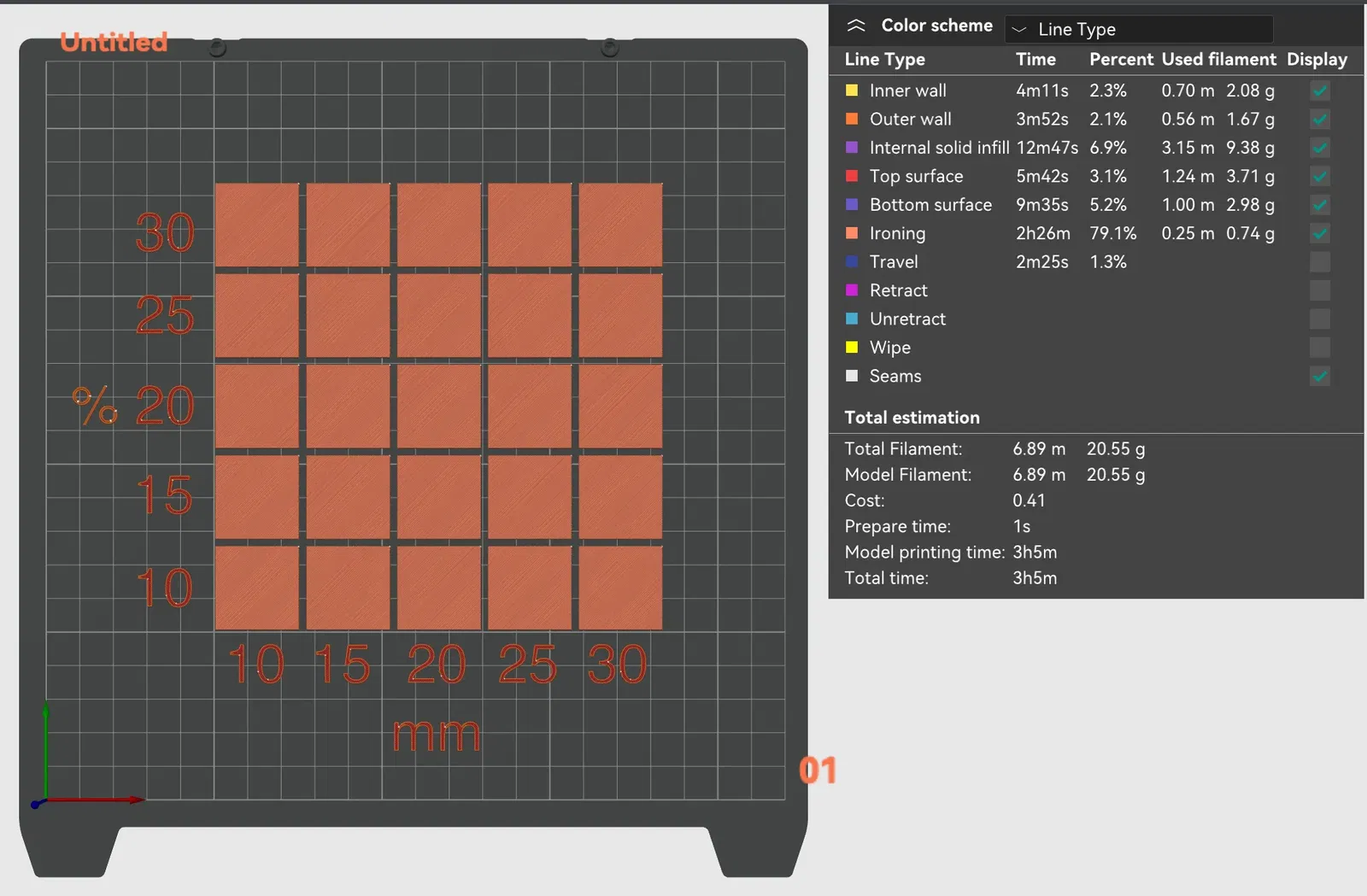Mình đã tạo một bài test ironing trong Orca Slicer. Thấy nhiều bài test trên mạng không hoạt động tốt với profile K1 và phải chỉnh sửa thủ công cài đặt ironing cho từng ô vuông, nên mình tự làm một cái, sử dụng các công cụ Primitive và hình khối của Orca Slicer.