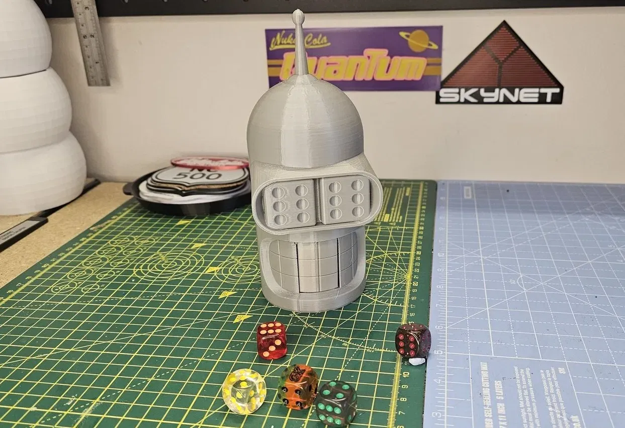 Mang Bender, tay chơi bài số 1 New New York, làm bạn đồng hành game của bạn. Tháp đổ xúc xắc Bender Bot này giúp bạn tung điểm cao. Có 2 phiên bản mắt. Remix từ mẫu Bender cũ của ozfunghi, đã sửa đổi để làm tháp. Răng phía trước mở ra cho xúc xắc ra ngoài. In 2 phần, hỗ trợ tùy chọn.