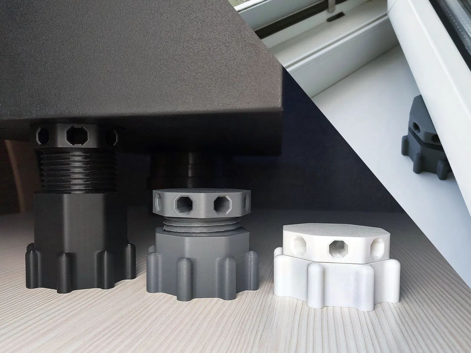 Cơ chế hỗ trợ dạng cột đơn giản với chiều cao có thể điều chỉnh từ 32 mm đến 172 mm. Có thể thay thế chân đồ nội thất, chặn cửa/cửa sổ hoặc hỗ trợ tạm thời. Hoạt động tốt với PLA, yêu cầu in với ít nhất bốn lớp vỏ và không cần vật liệu hỗ trợ.