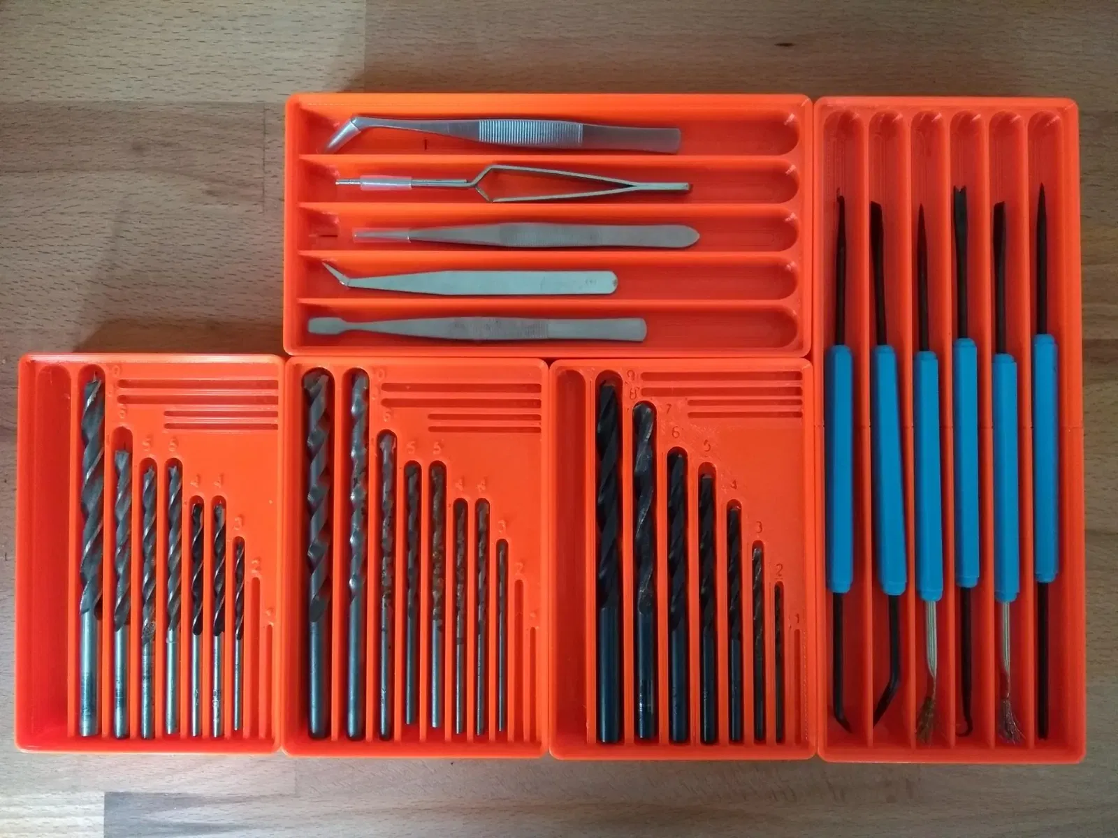 Thiết kế gốc được lấy từ Miguel Camba, người đã được truyền cảm hứng từ khay mũi khoan của Alexandre Chappel. Tôi đã chỉnh sửa tệp Fusion360 để có khả năng điều chỉnh tốt hơn. Nó vẫn chưa hoàn hảo, nhưng khoảng cách, độ rộng và chiều dài giờ đây đã hoàn toàn có thể điều chỉnh. Đế của mũi khoan có một vùng lõm cho phép bạn nâng đầu mũi khoan lên để dễ dàng cầm nắm. Tôi đã tải lên một phiên bản có số (thêm số và số lùi) và phiên bản không có số. Và thêm các lỗ dự phòng cho các mũi nhỏ, vì chúng thường đi kèm theo số lượng. Chiều dài khoan tối đa là 120 mm (160 mm) cho 3 (4) đơn vị gridfinity. Giá đỡ mũi khoan 4x2 có 4x lỗ 11mm, 1x lỗ 12mm và 1x lỗ 13mm. Giá đỡ 5x2 dành cho các công cụ dài và cũng có 4x lỗ 11mm, 1x lỗ 12mm và 1x lỗ 13mm. Ngoài ra, một giá đỡ nhíp 4x2 cũng được bao gồm trong bộ (1x lỗ 15mm, 4x lỗ 14mm).