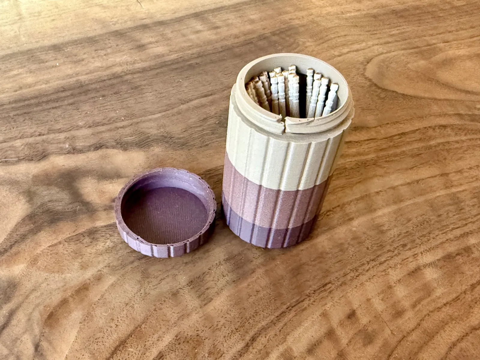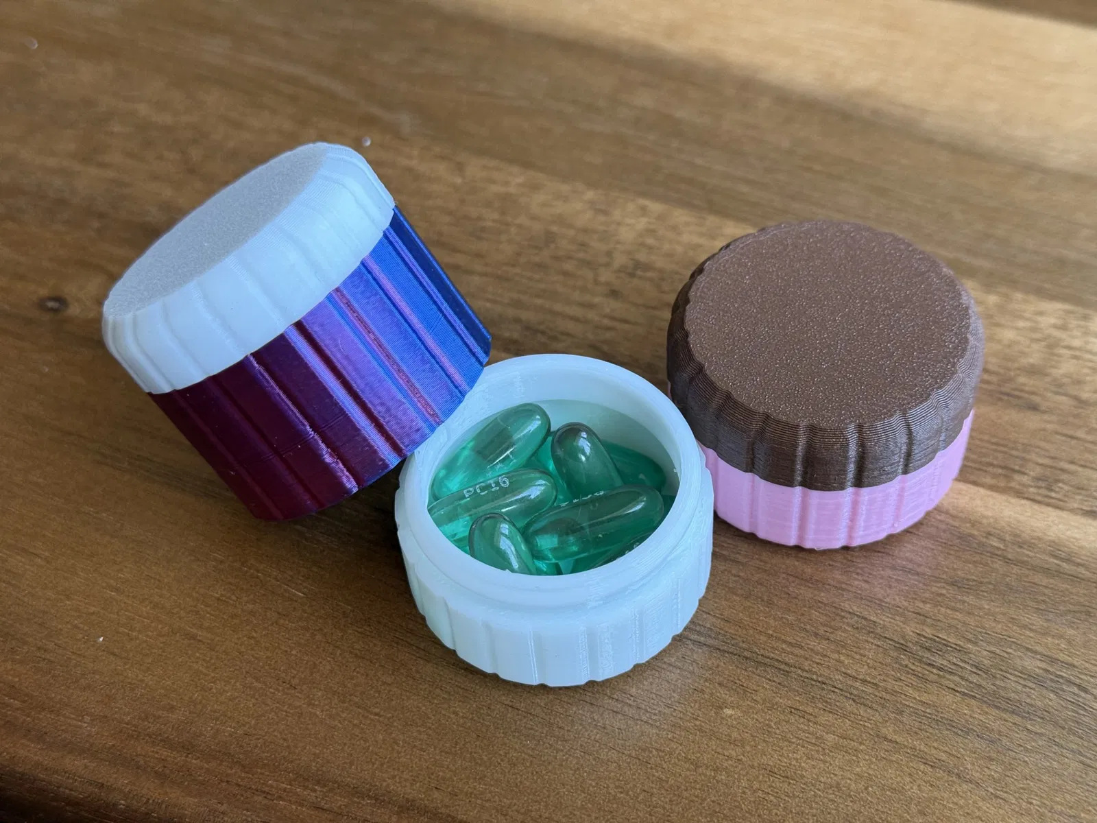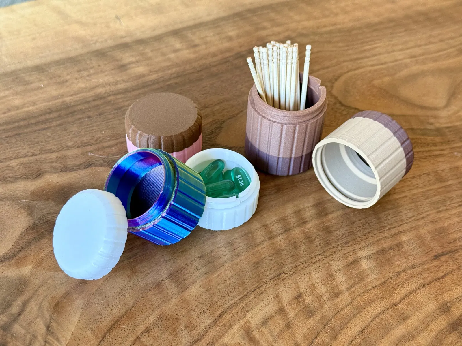 Một phiên bản remix của các hộp đựng thuốc du lịch dạng chồng lên nhau phổ biến với nắp gài khớp luôn căn chỉnh.