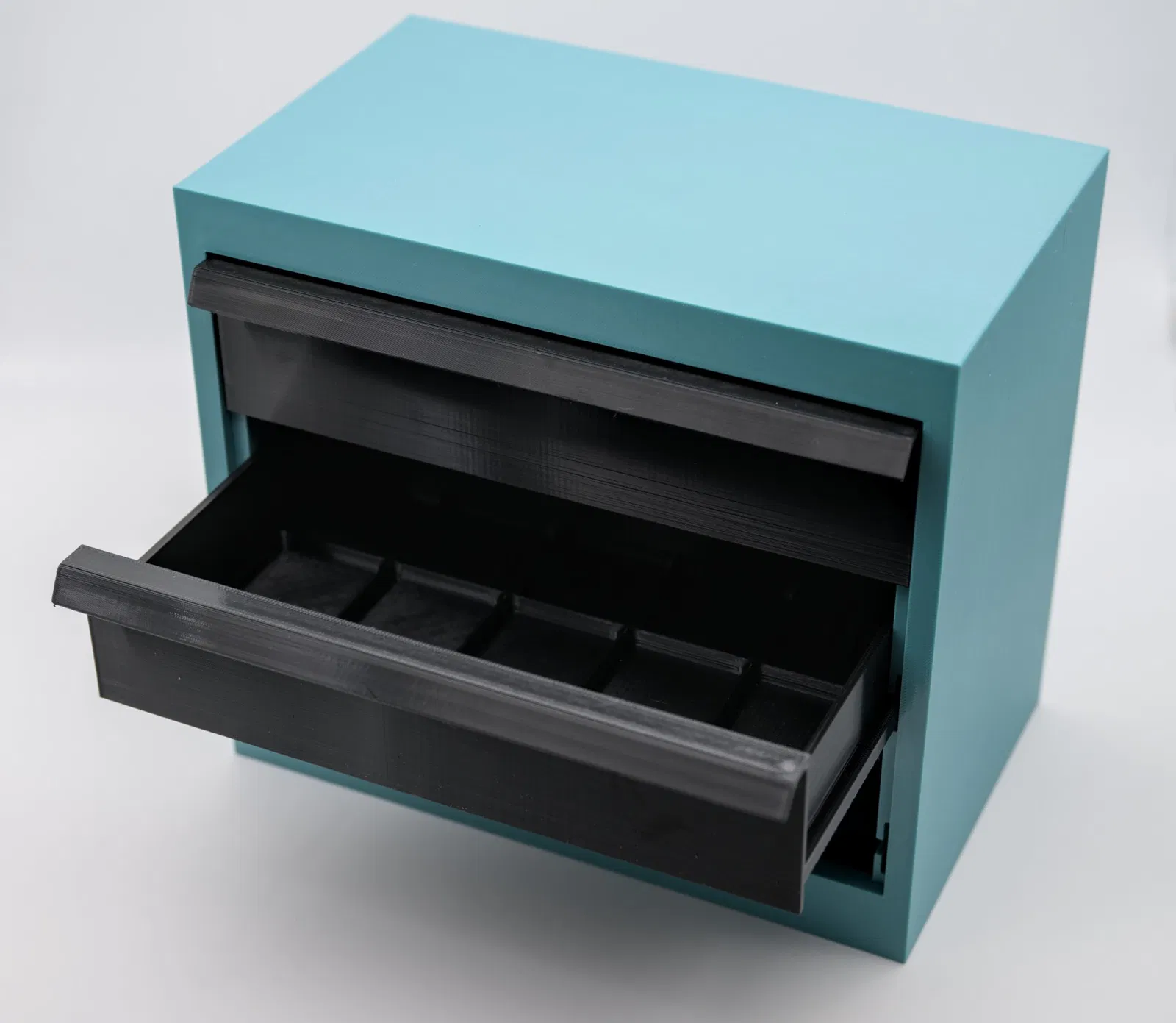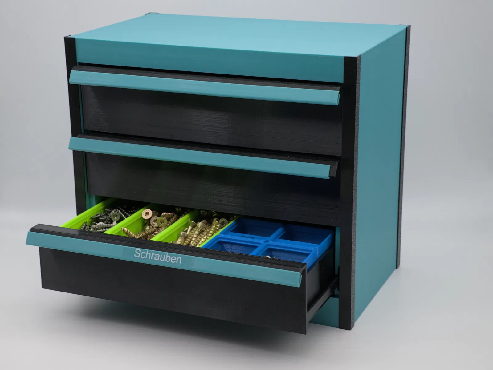 Tôi đã thay thế 3 ngăn kéo nhỏ bằng 2 ngăn lớn bổ sung. Chúng cũng có một khung gridfinity 3*5 bên trong - nó sẽ phù hợp với các thùng gridfinity lên đến 6u, chẳng hạn. Sử dụng các nắp phẳng của PteroDancer và làm cho chúng dài hơn một chút để phù hợp. Cũng đã tăng chiều dài cho các góc.