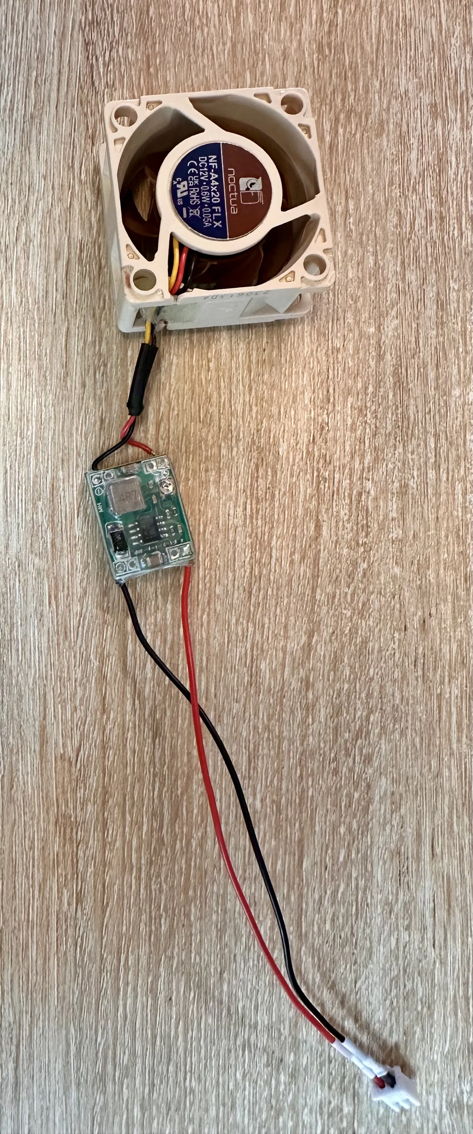 CẨN THẬN: Quạt A4x20 là quạt 12v, và bo mạch đầu công cụ chỉ cung cấp hai cổng 24v. Bạn sẽ cần bộ chuyển đổi điện áp. Tôi đã sử dụng bộ này (đủ nhỏ gọn). Hoặc người dùng Rhiz0me đã chỉ ra rằng quạt sunon SUNON MF40202V2-1000U-A99 hoạt động trực tiếp ở 24v.