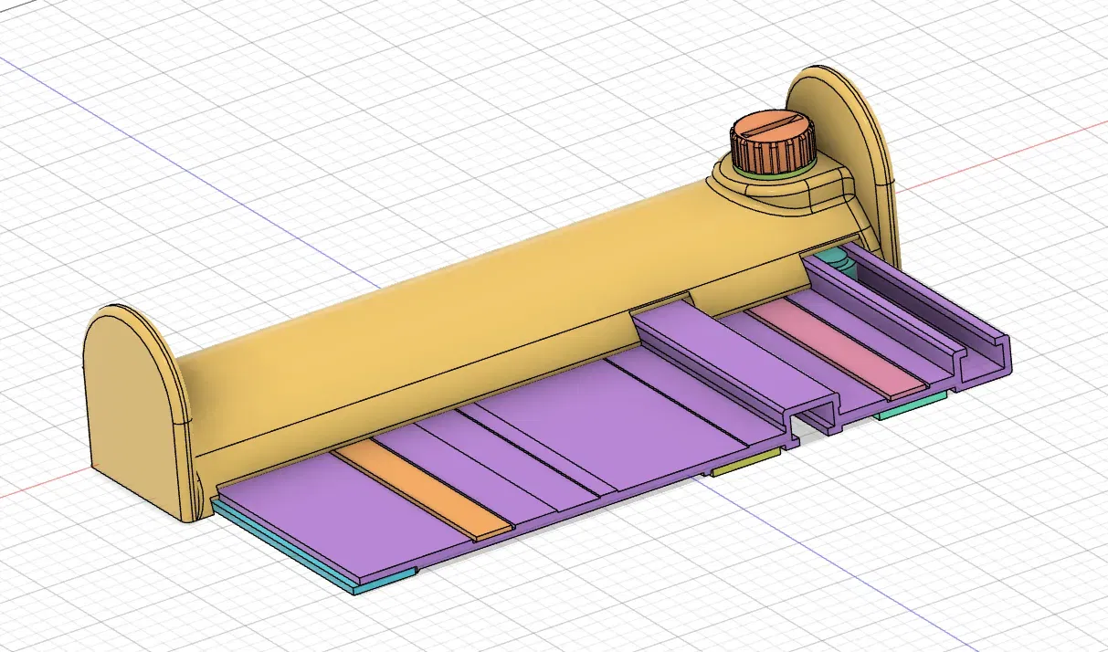 Tôi cũng muốn giữ ý tưởng từ Yurshevich để lắp kẹp trên thanh ray mà không cần tháo tấm chắn, điều này không thể thực hiện với mô hình gốc và cũng tái sử dụng hệ thống để cố định tấm chắn vào thanh ray (ốc vít, đai ốc và ống lót). Vì vậy, tôi đã thiết kế trong Fusion 360 một mô hình mới giữa hai mô hình đó.