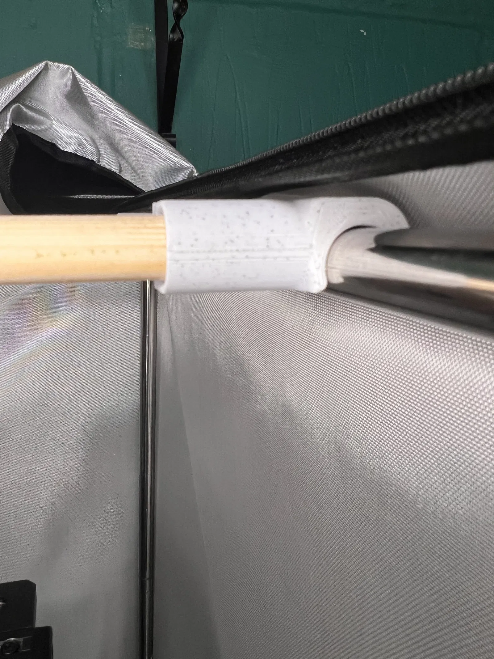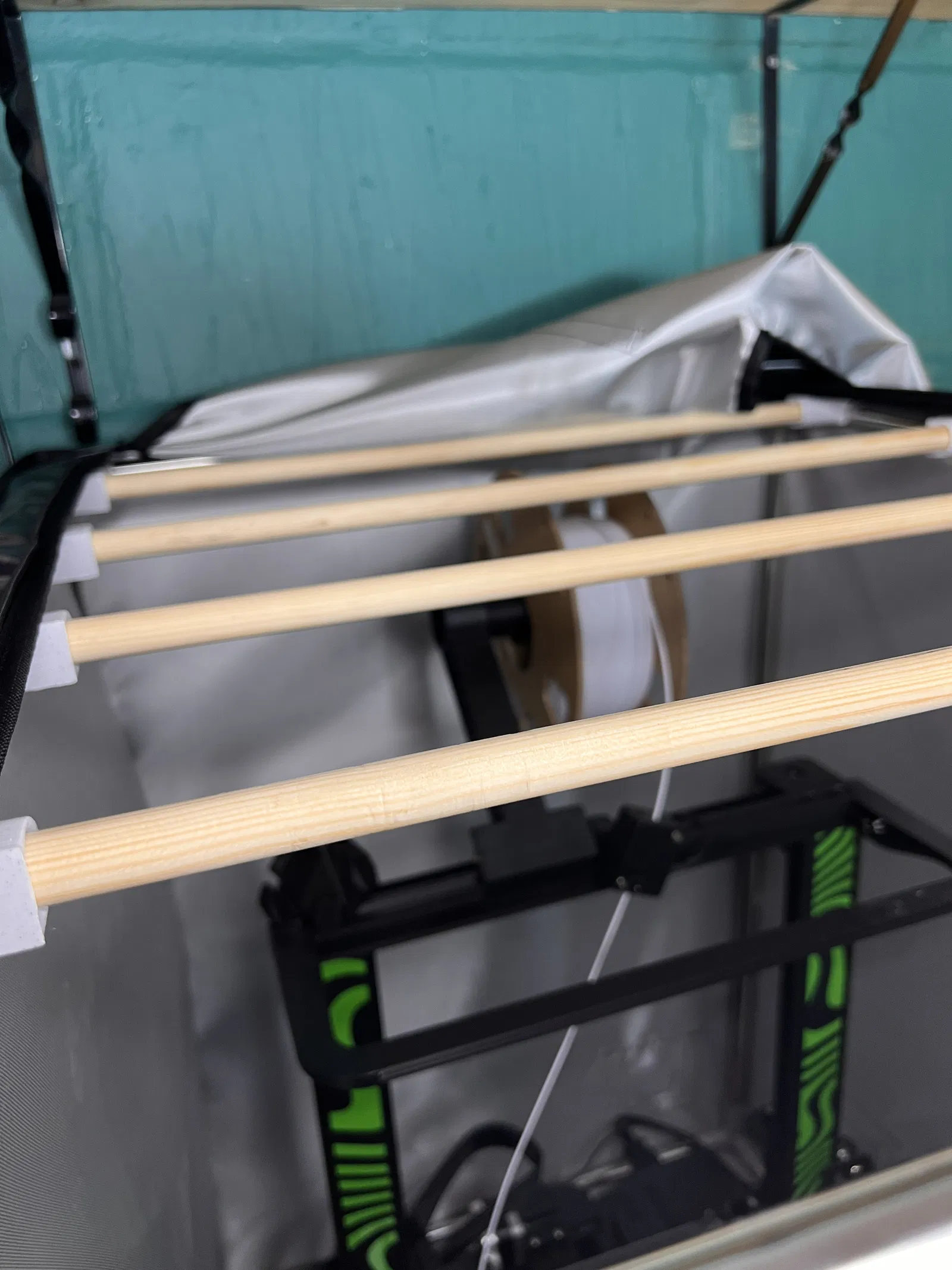 Cái lều máy in của tôi là Comgrow tent. Nó có mấy thanh nhôm đường kính 17mm bao quanh bên ngoài và tôi xài thanh gỗ tròn đường kính 14mm cắt dài 490mm để làm thanh ray.