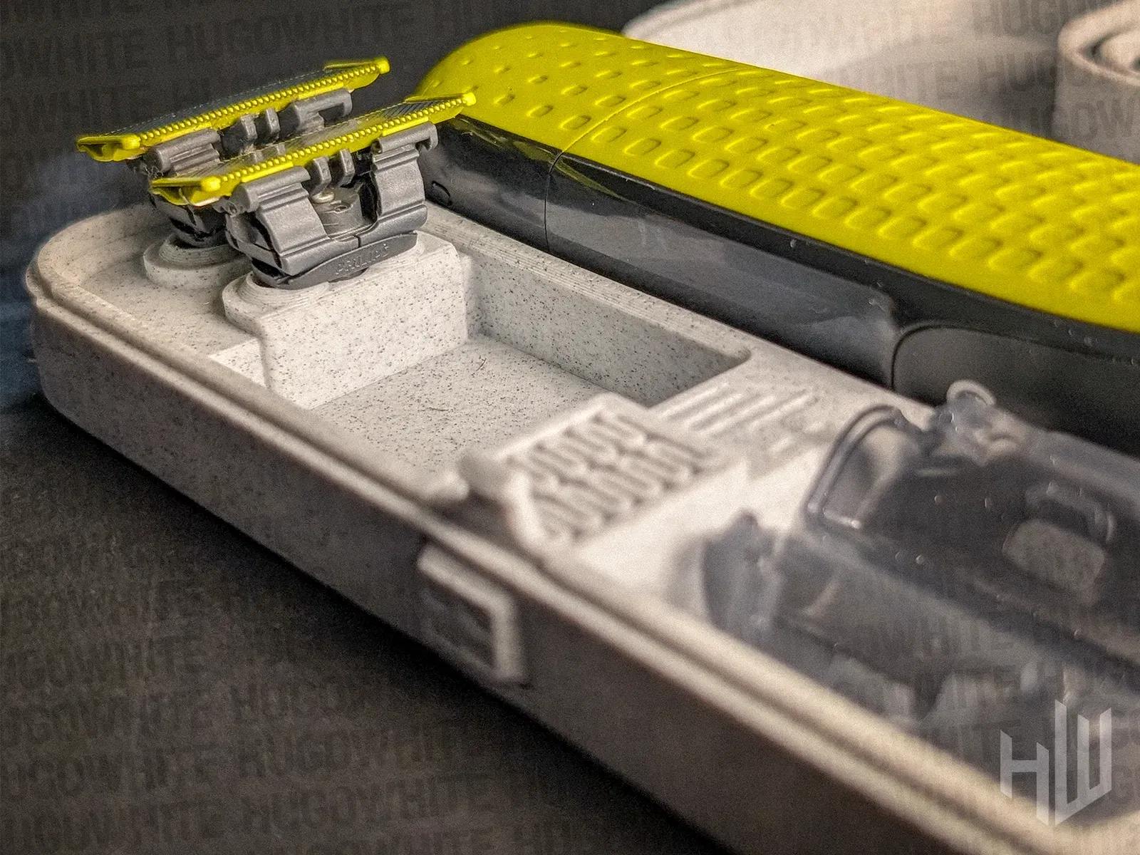 Trường hợp này theo cùng một suy nghĩ như các sản phẩm cổ điển Braun và Philips. Nếu nó không làm cho sản phẩm hoạt động tốt hơn, thì nó không thuộc về đây. Logo Philips không chỉ là trang trí, nó ẩn giấu các lỗ thông hơi. Các bề mặt mịn không chỉ đẹp, chúng còn dễ dàng để làm sạch và đóng gói. Bên trong, mỗi bộ phận của OneBlade của bạn đều có chỗ riêng. Không có không gian lãng phí, không có sự nhầm lẫn về nơi để mọi thứ. Cơ chế lò xo được giấu kín nhưng hoạt động hoàn hảo - đó là triết lý "ít hơn, nhưng tốt hơn" của Dieter Rams đang được thực hiện. Thiết kế tốt là vô hình. Nó chỉ hoạt động. Khóa Lò Xo