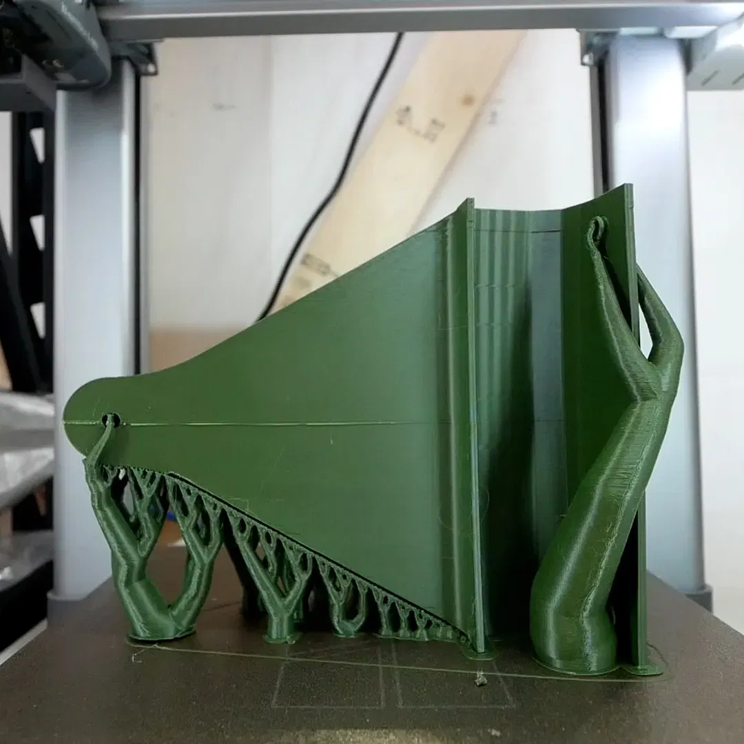 In bằng PETG với 4 lớp viền, 20% độ đặc và vật liệu hỗ trợ được bật trên bệ in, được định hướng như trong các bức ảnh.
