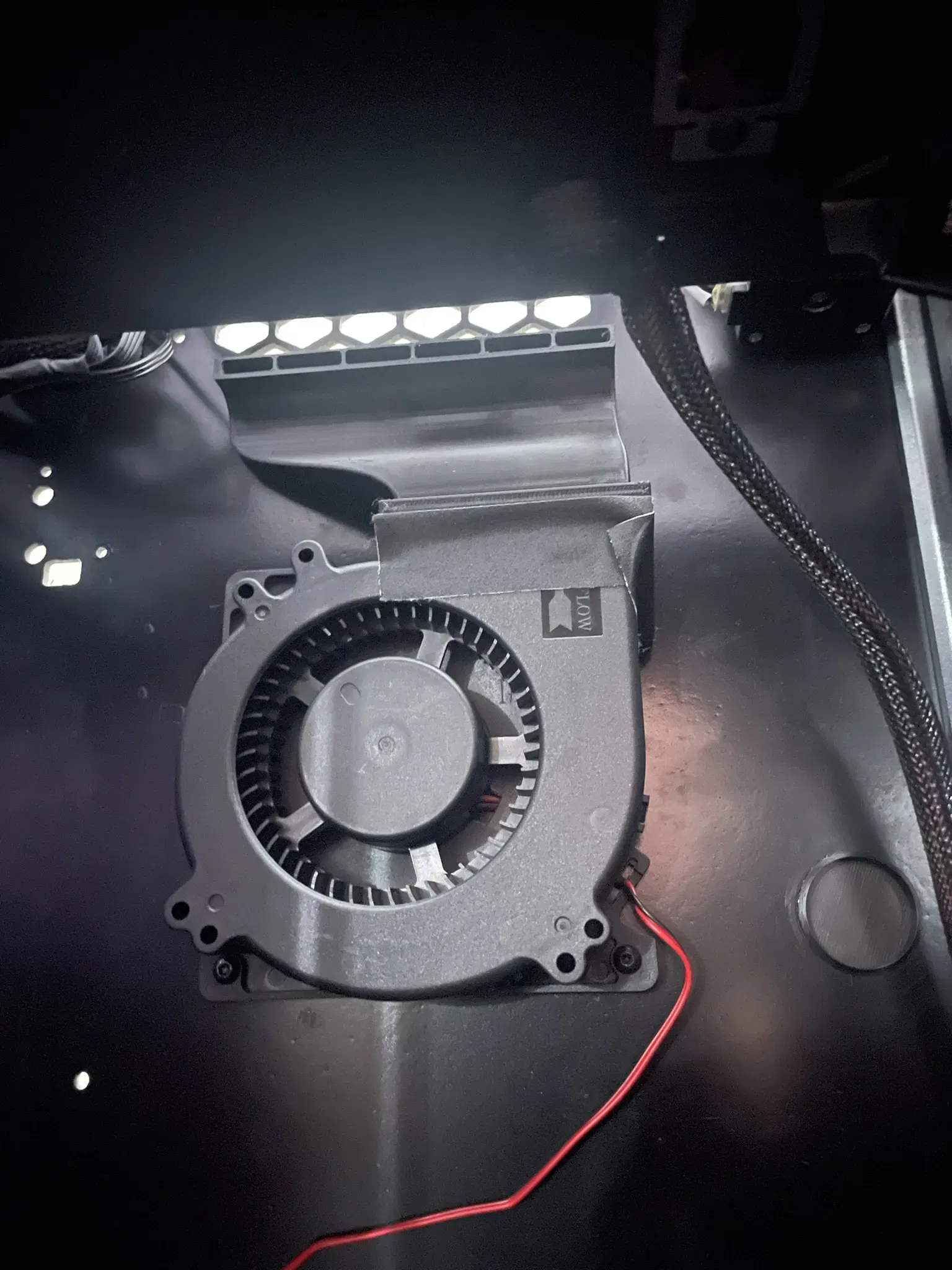 Vì việc lấy các bộ phận từ Infimech có vẻ khó khăn, và họ không còn liệt kê quạt phụ nữa, tôi đã tự mình xử lý. Sẽ cần hỗ trợ cây cho phần quạt thổi với độ thò ra 50 độ. Tôi đã sử dụng một chút băng dính gaffer để niêm phong giữa quạt và đế. Cắm vào bên trái của nắp điện tử tại cổng đã ghi chú.