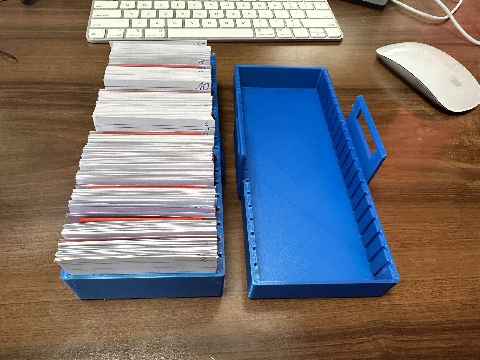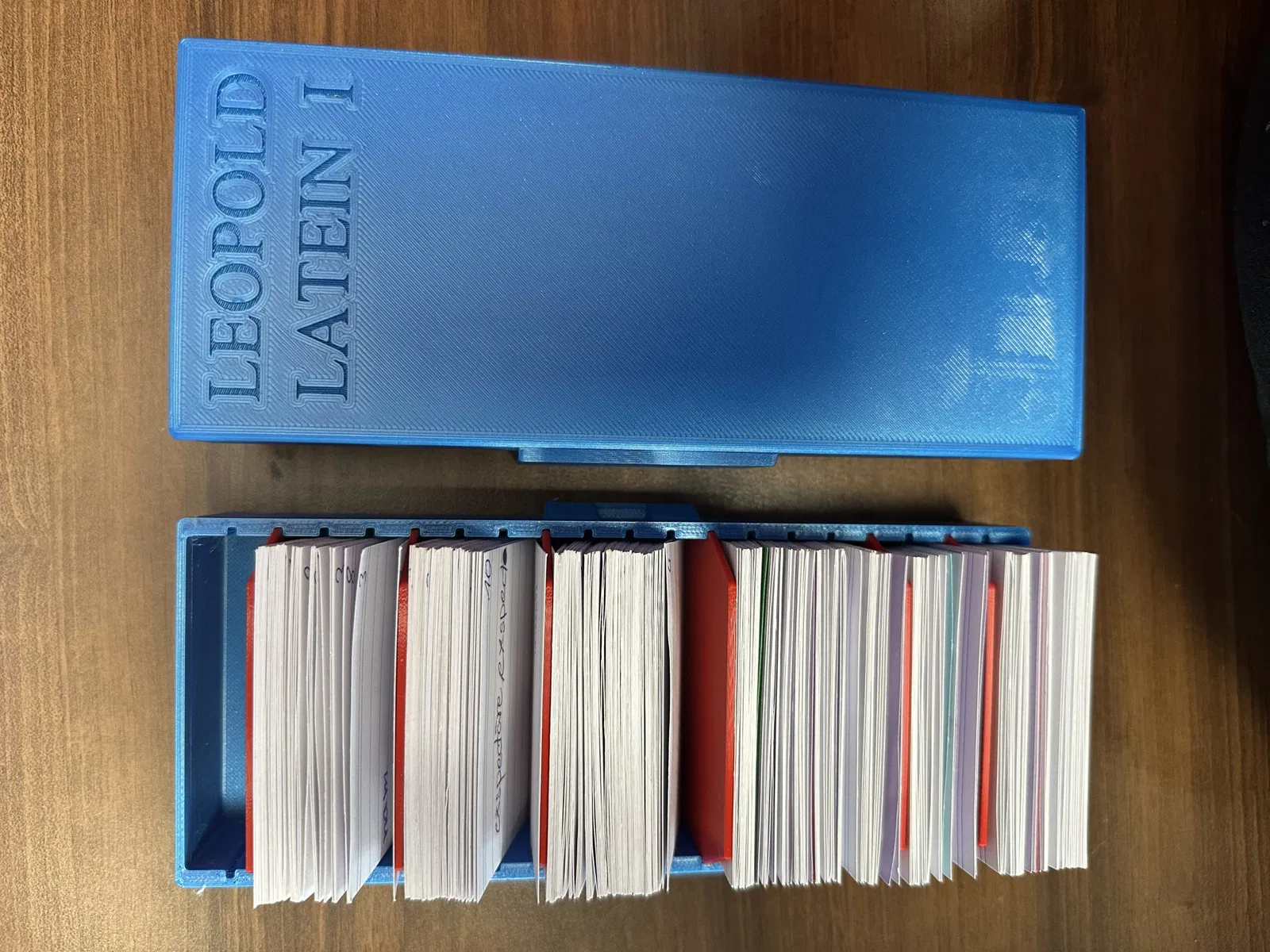 Đây là Phiên bản 2, một bản cập nhật cho bổ sung một nắp bấm để bảo vệ các thẻ trong quá trình vận chuyển. Để dễ dàng đóng nắp hơn, các ngăn lớn giờ đây đã có các góc cắt. Kể từ khi con trai tôi bắt đầu học tiếng Latinh gần đây, việc học từ vựng bằng thẻ giấy vẫn dường như là một trợ giúp hữu ích, ngay cả trong thời đại kỹ thuật số. DIN A8 có vẻ là kích thước phù hợp cho điều này. Có ba kích thước ngăn có sẵn: 30mm là chiều cao đầy đủ của hộp, 10mm chỉ nằm trên mặt đất để ngăn chặn các thẻ trượt trong một ngăn và 20mm là ở giữa. Nó in mà không cần hỗ trợ, tuy nhiên việc sử dụng hỗ trợ hữu cơ của PrusaSliceer ở trên và dưới sẽ chỉ làm tăng thời gian in nhưng tăng độ chính xác của cơ chế bấm. Tôi đã sử dụng tính năng dập nổi văn bản của eSlicer để in văn bản trên nắp trên.