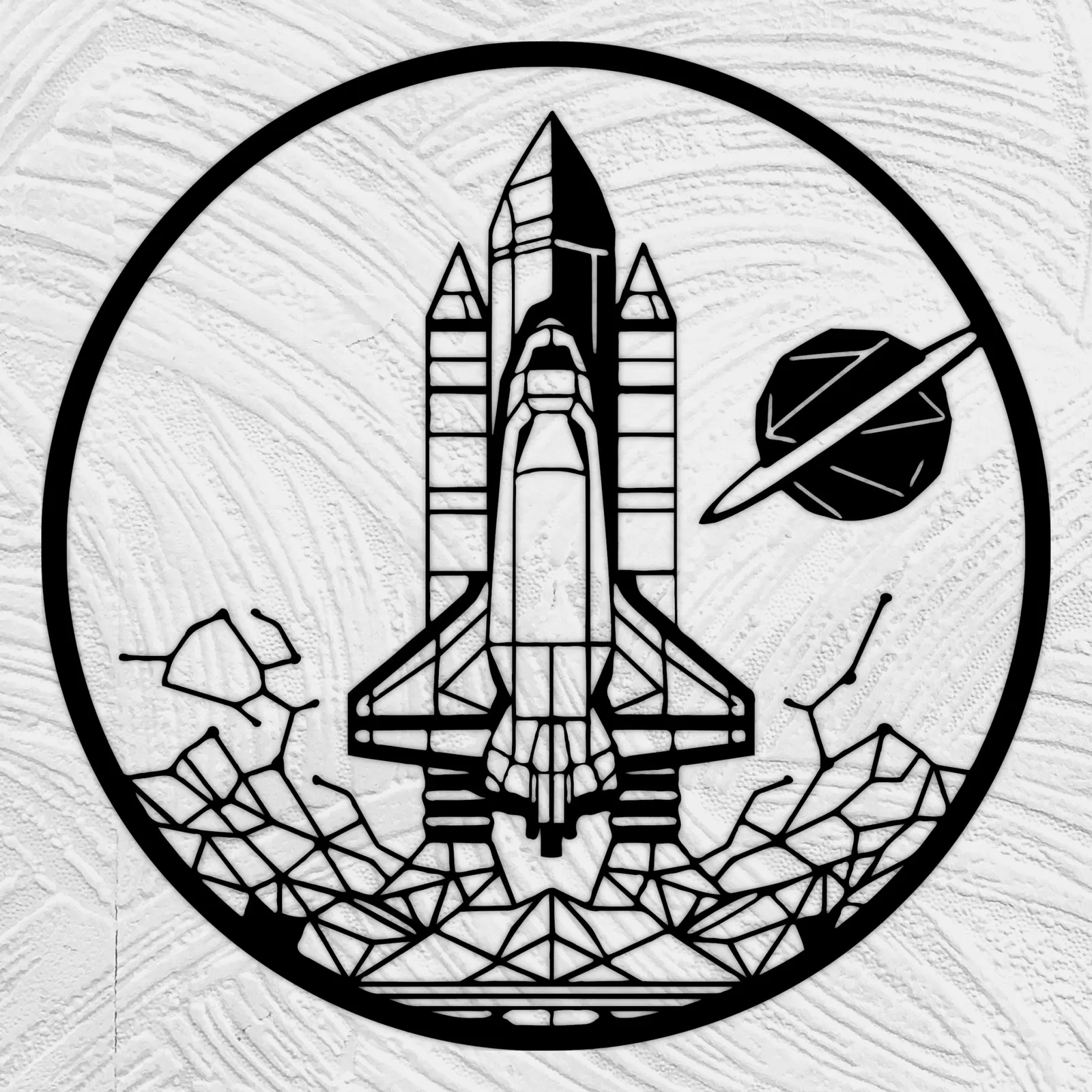 Mô hình tàu vũ trụ nghệ thuật đường nét hình học, dày 2mm, phù hợp để treo hoặc đặt trên giá. Kích thước tối thiểu 20cm để đảm bảo chi tiết.