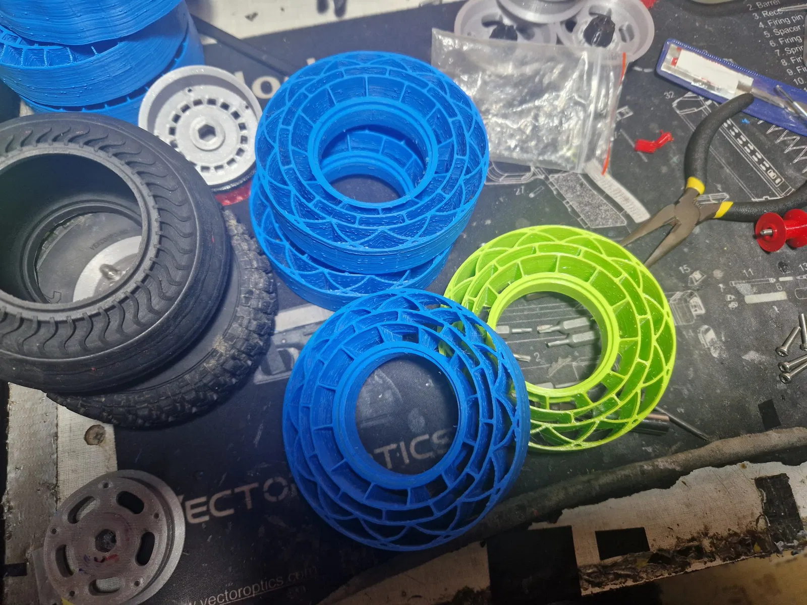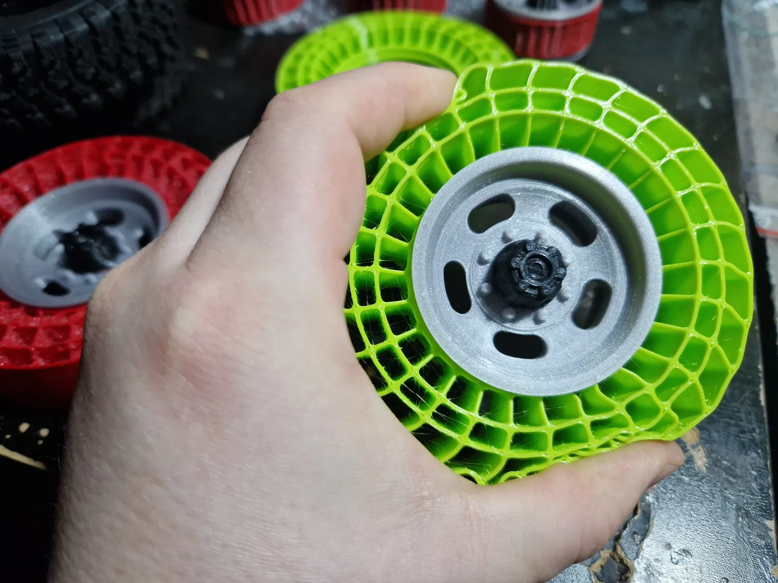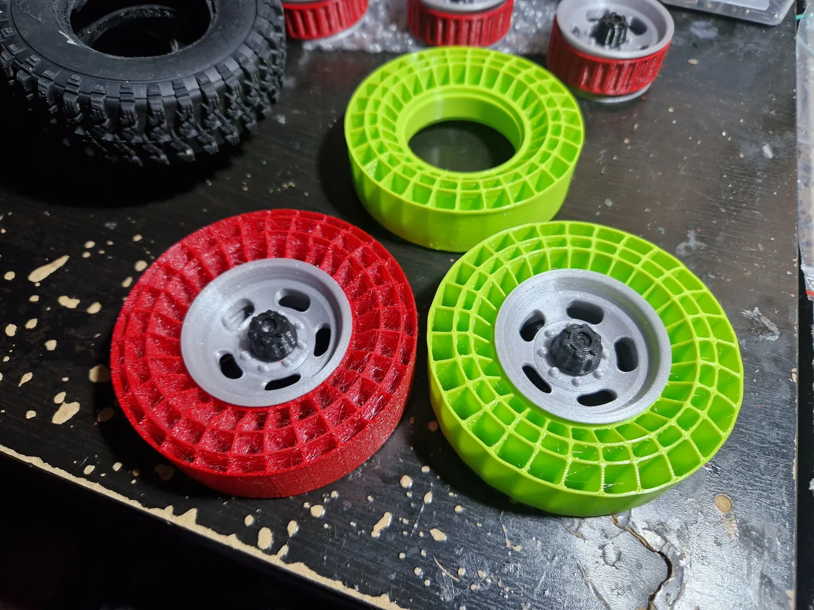 Lần thử nghiệm #printedtrophy đầu tiên của tôi cho thấy, rằng mút nguyên bản trong lốp 1:10 quá mềm cho một chiếc xe tải đầy phụ tùng và pin. Vì vậy, tôi đã bắt đầu thử nghiệm.