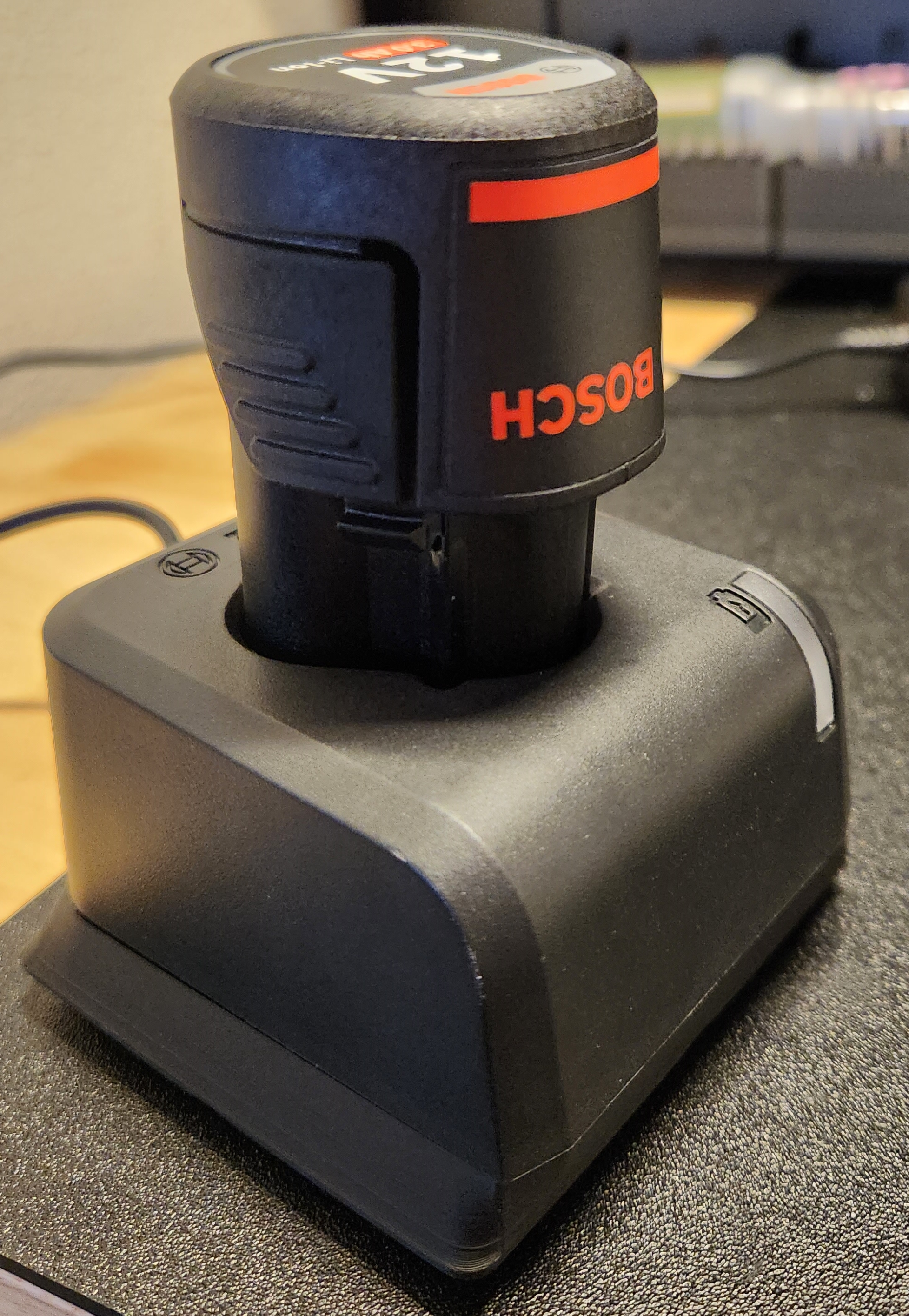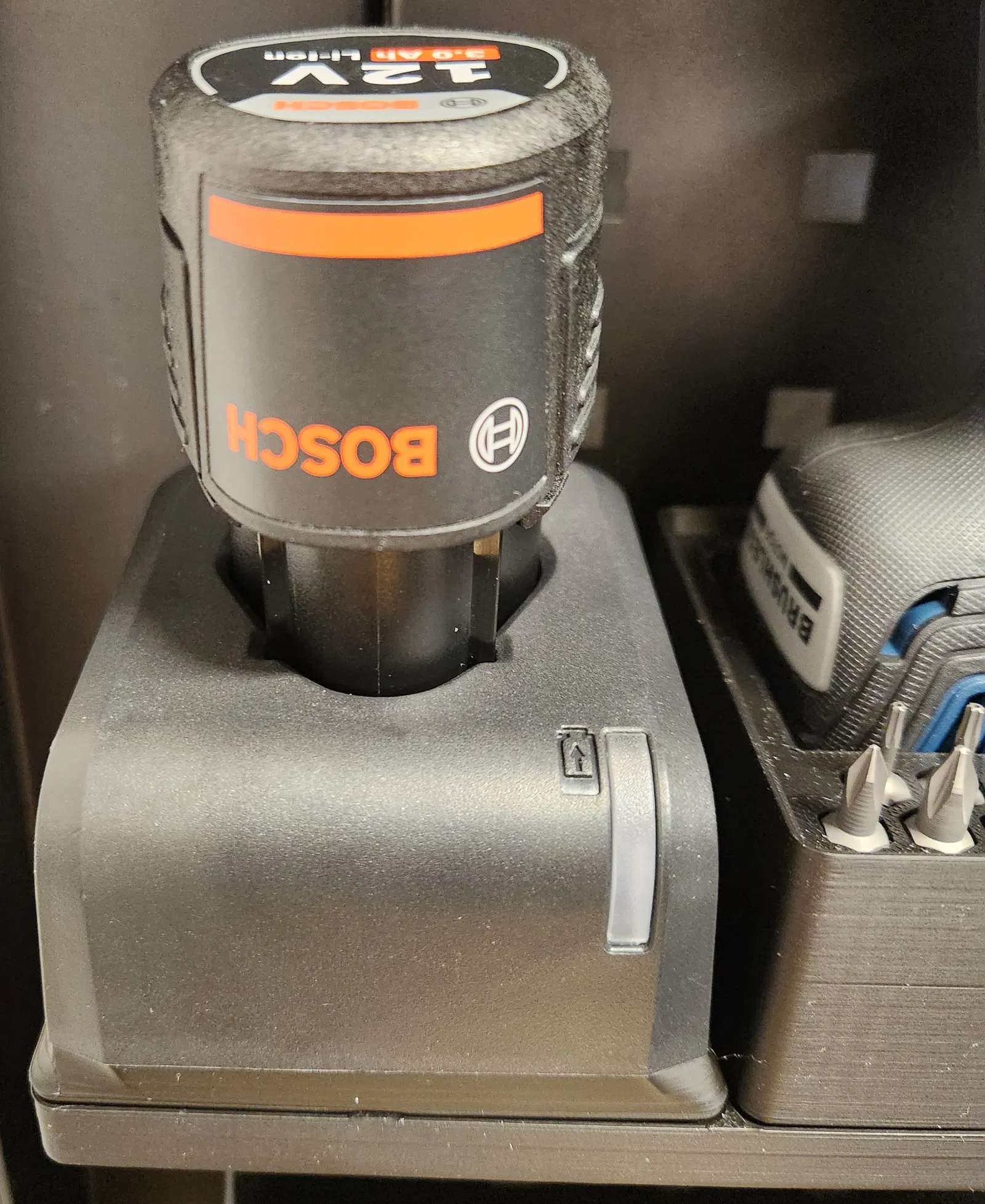 Kệ sạc pin Gridfinity 2x2 cho Bosch GAL 12V-20. Sản phẩm đi kèm file f3d, được in với chiều cao lớp 0.2mm và đầu phun 0.4mm. Yêu cầu support cho hai lỗ vít dưới đáy. Bạn chỉ cần tháo phần dưới của bộ sạc gốc và lắp bộ phận này vào bằng chính hai vít đó. Thiết kế có tính đến dây cáp phía sau và phần nhô phía trước.