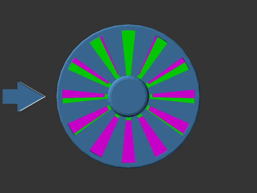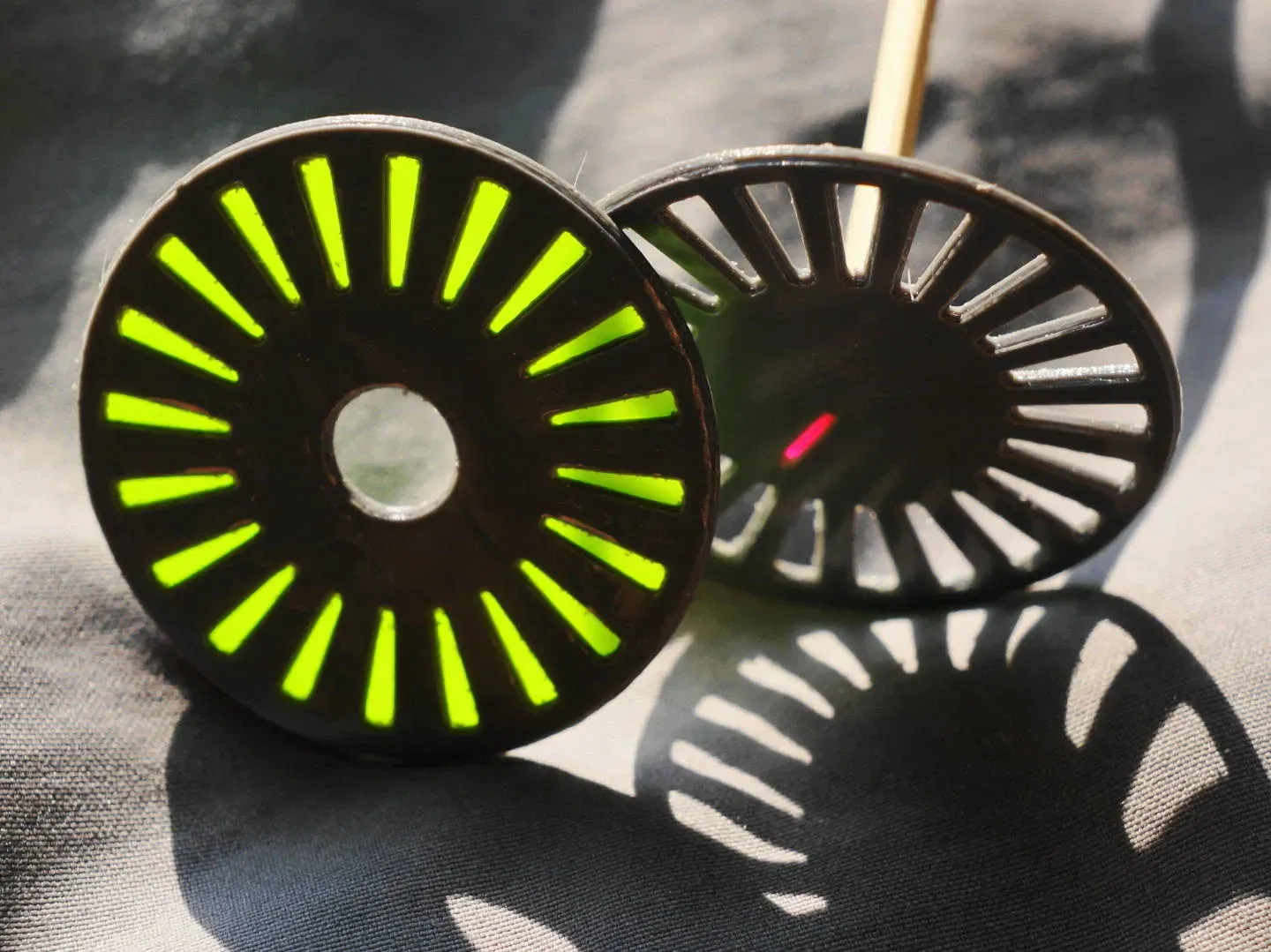 Mẫu xoáy bên ngoài sẽ tạo ảo giác xoay 378° khi núm chỉ di chuyển chỉ 1.8° (360°/200 bước). Điều này có thể xảy ra nhờ sự can thiệp của số lượng cửa sổ khác nhau và các vạch màu trên cơ sở. Góc của cửa sổ cho phép vạch mới xuất hiện như một đường thẳng nhưng từ từ biến mất trong một vòng xoáy.