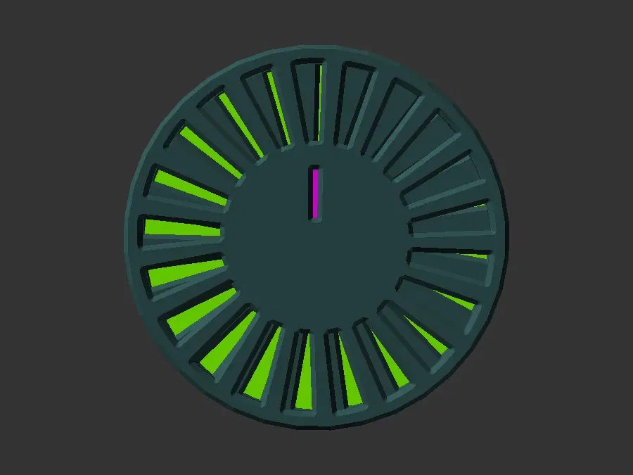 Vì vậy, chỉ báo bên trong sẽ căn chỉnh với mẫu sau mỗi 10 bước. Trong khi 20 cửa sổ được lấp đầy màu sắc (sợi thay đổi khi in hoặc sơn) từ cơ sở sẽ chỉ ra 10 bước/20 cửa sổ 0.5 bước của máy đùn của bạn.