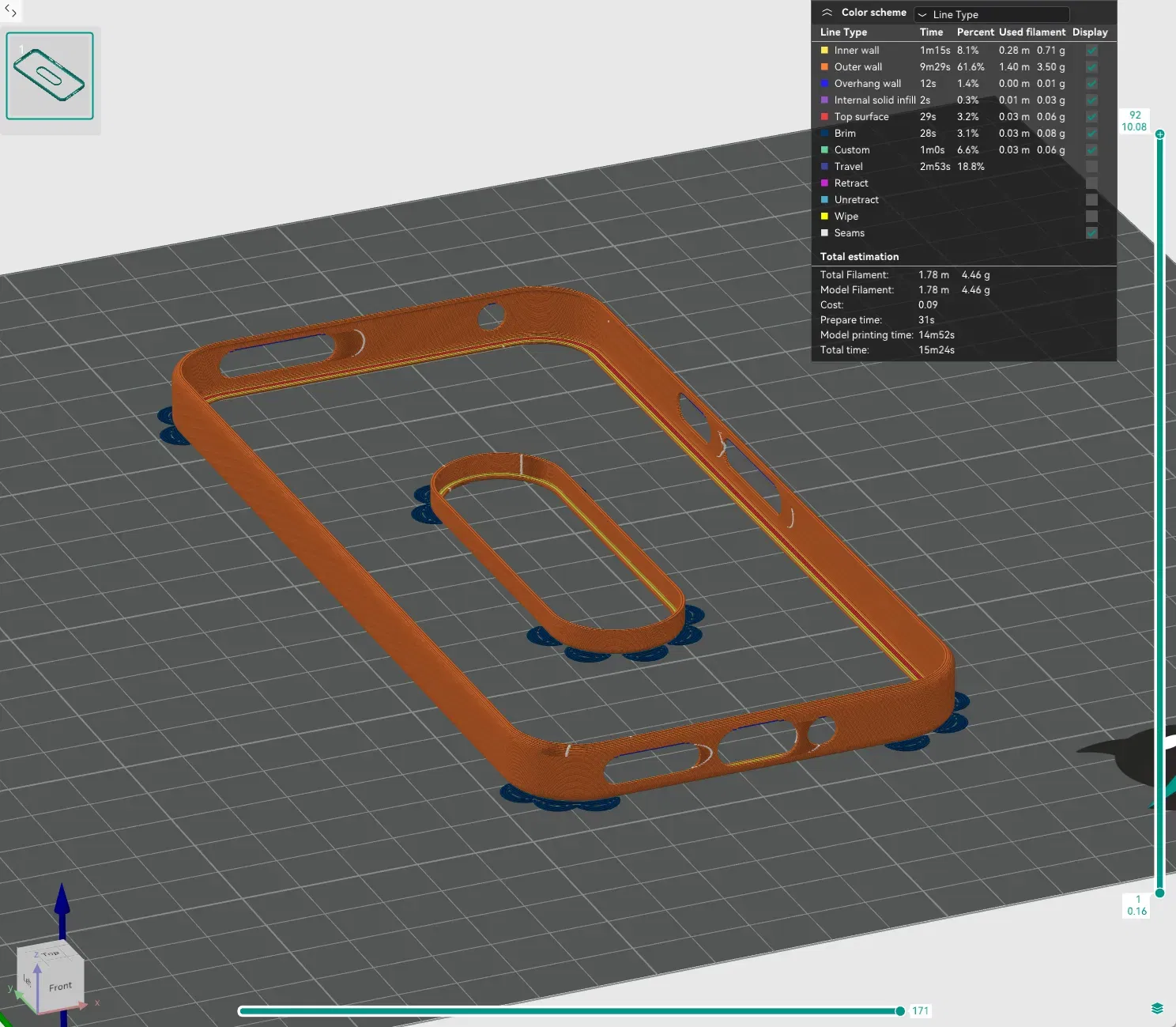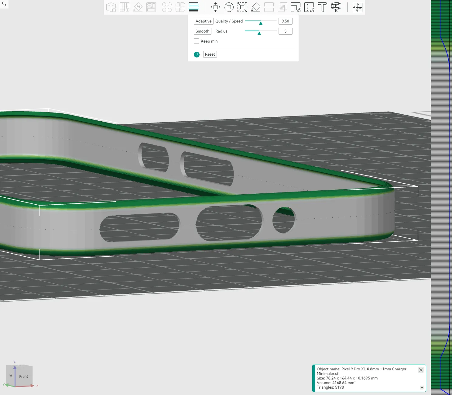 Đây là phiên bản cuối cùng của “bản nháp ban đầu” mà tôi đã làm vào ngày đầu tiên tôi nhận được điện thoại. Tôi muốn sử dụng nó trong một tuần trước khi công bố, và cho đến nay thì rất tuyệt. KHÔNG có vấn đề gì với việc cảm thấy lỏng lẻo sau một tuần hoặc không thoải mái trong tay. Các nút bấm có phần khó nhấn hơn một chút nhưng không gây vấn đề gì cho tôi. Tôi đã bao quanh tất cả các cổng và điều chỉnh khu vực cổng sạc, không còn các phần cầu lớn nữa. Tôi đã làm nhỏ hơn phần đế. Đã tạo góc cho viền camera để tránh phản quang, vì vậy bạn không cần phải mài nó xuống và/hoặc tô màu đen nếu bạn in bằng màu sáng hoặc phản chiếu. RECOMEND; =/>0.12mm chiều cao lớp ở trên cùng để có độ treo tốt nhất và +/<0.16mm cho cầu nối. *tai chuột cho độ bám giường với ABS đã hoạt động tốt với tôi. Tôi đã in nó bằng PETG với 100% và ABS+ với 100.25% @0.12mm chiều cao lớp hoặc 0.16mm chiều cao lớp để có cầu nối tốt hơn với Chiều cao Lớp Biến Đổi cho phần dưới và đặc biệt là phần treo bên trong trên cùng. Tôi giữ các phần in bằng ABS+ chủ yếu vì màu sắc, tôi thích màu trắng đục của ABS). Dự đoán của tôi là ASA sẽ hoạt động tốt nhất, nhưng tôi đã hết nó. Khít lại khá chặt để có độ vừa vặn tốt nhất, vì vậy để lắp nó vào bạn phải cuộn vào cạnh cuối cùng. Cũng tương tự với viền camera.