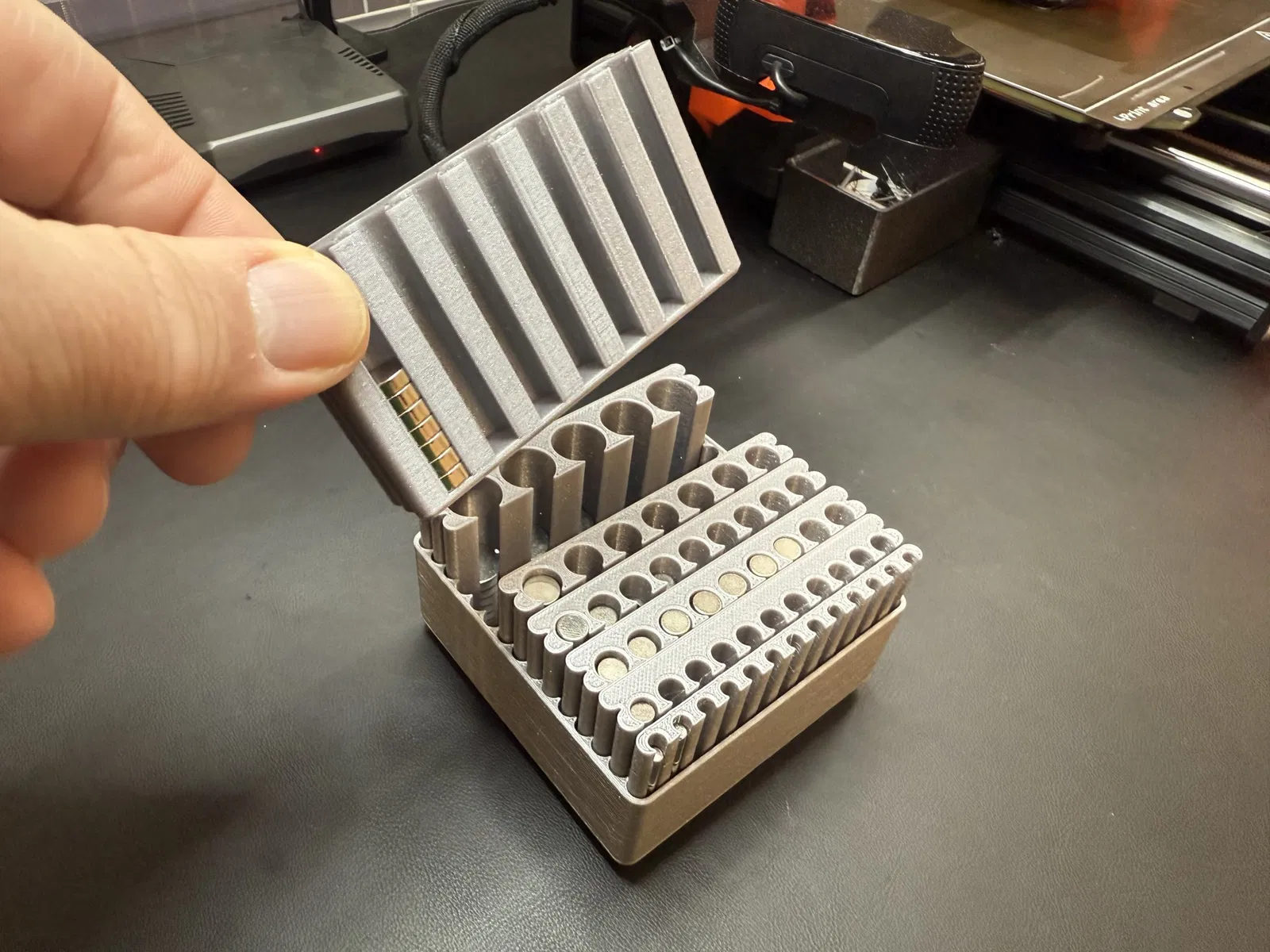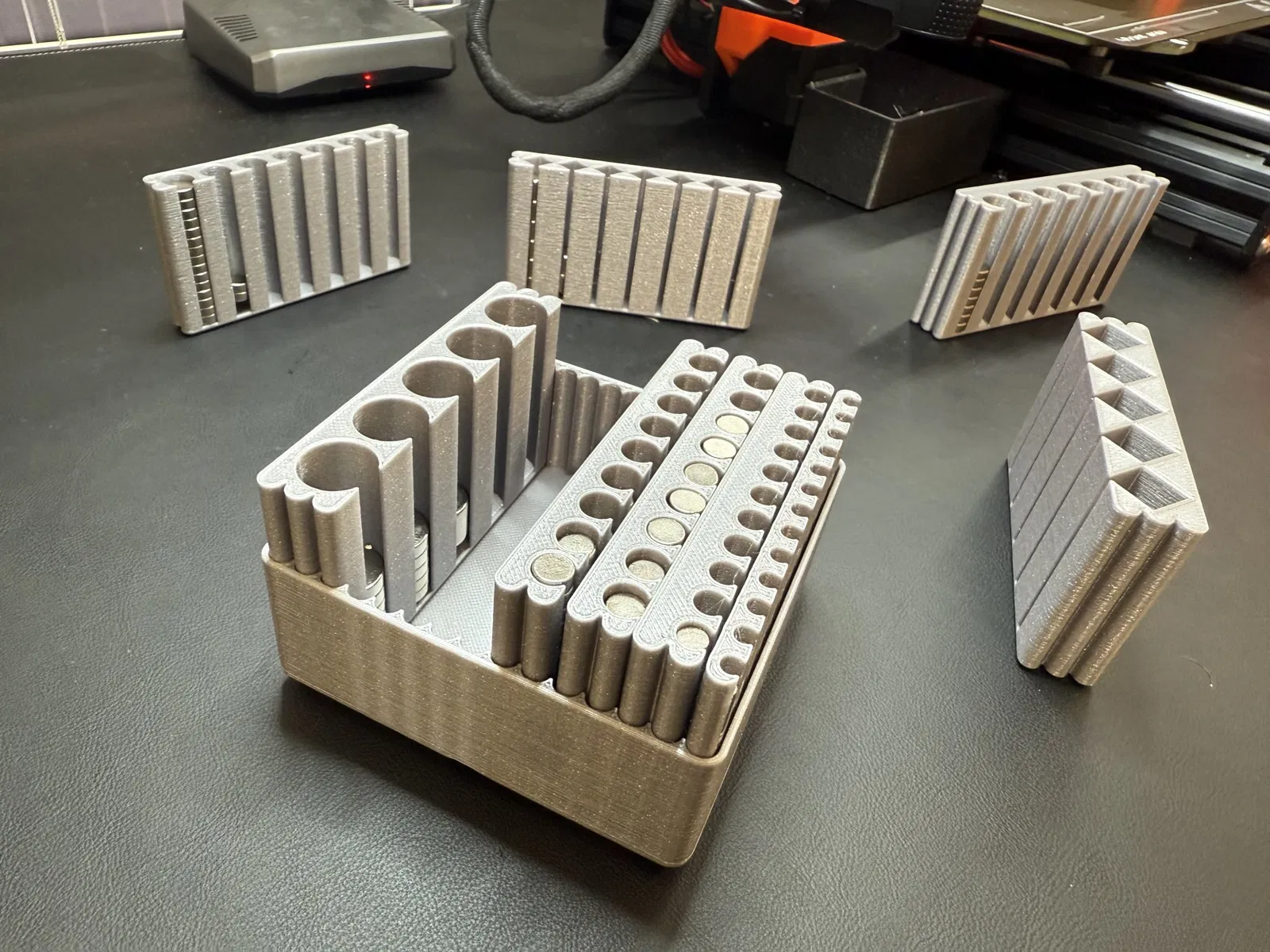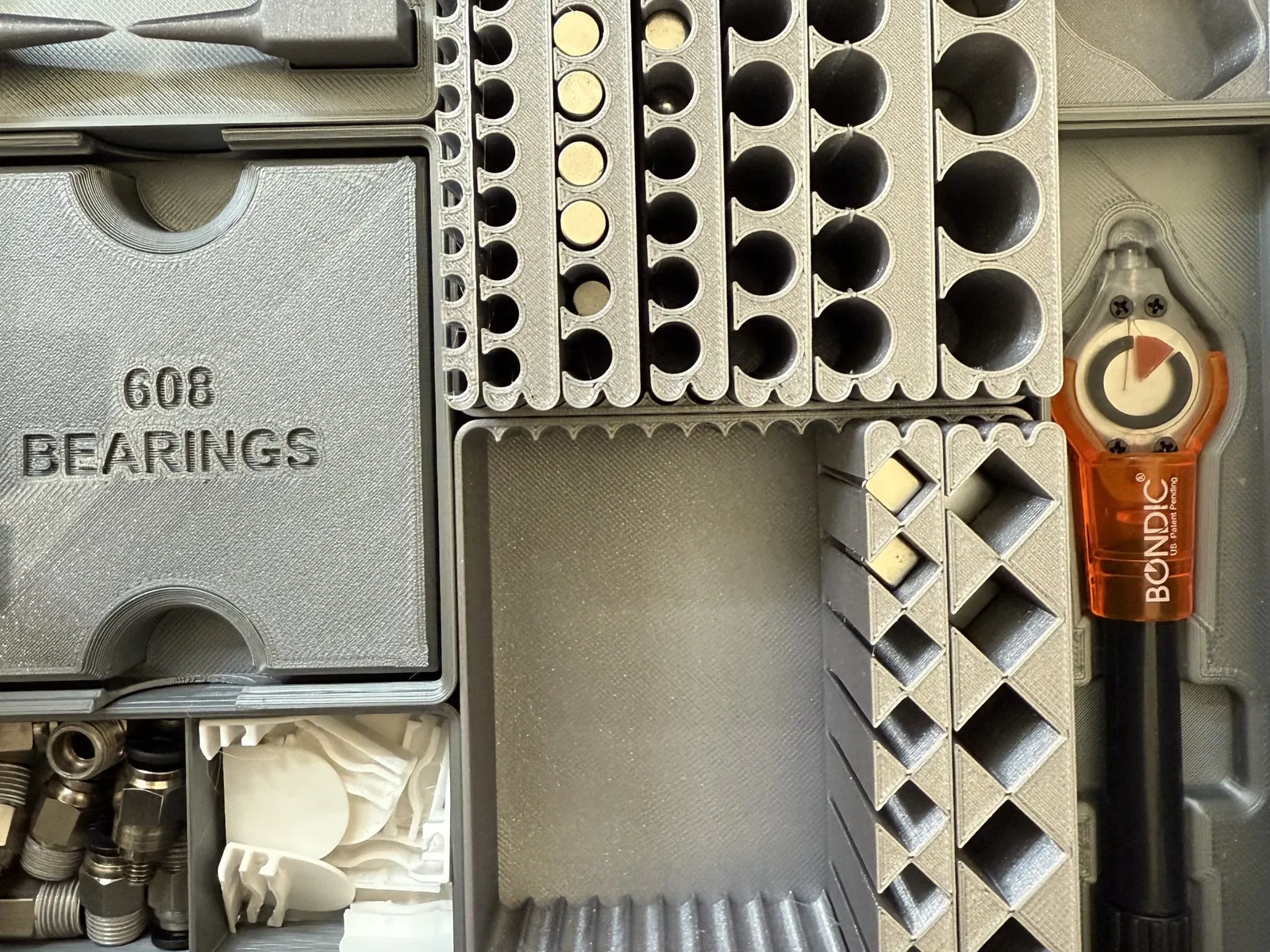 Tôi đã chán việc chỉ có một thùng gridfinity với một khối hình vô định hoặc những nam châm ngẫu nhiên dính lại với nhau, vì vậy tôi đã tạo ra hệ thống mô-đun này để giữ chúng.
