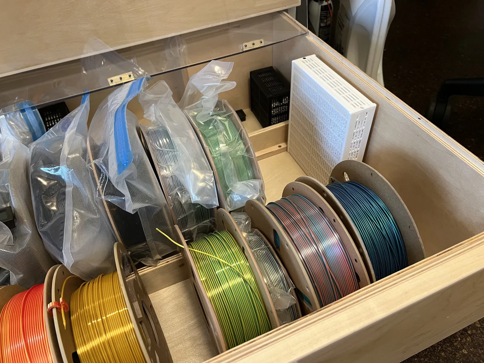 Tôi muốn một hộp hút ẩm lớn để vừa trong ngăn chứa filament của tôi, nhưng không có cái nào vừa với khu vực tôi có, vì vậy tôi đã sử dụng điều này để có thêm kinh nghiệm với CAD.