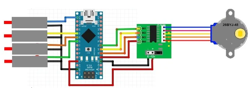 bạn chỉ cần một arduino nano, từ 1 đến 4 laser line và một bước động cơ vi mô có bánh răng (28BYJ-48)