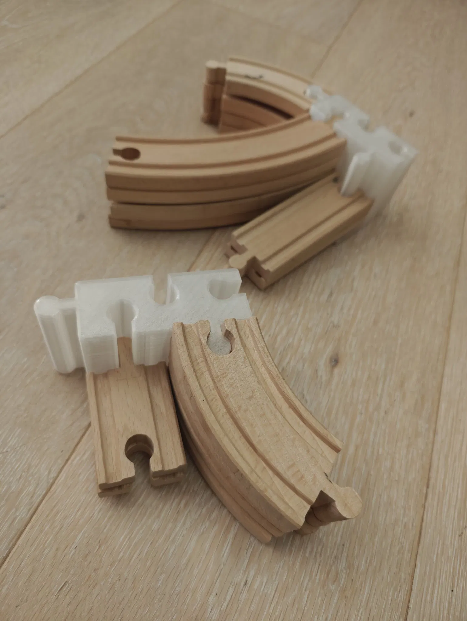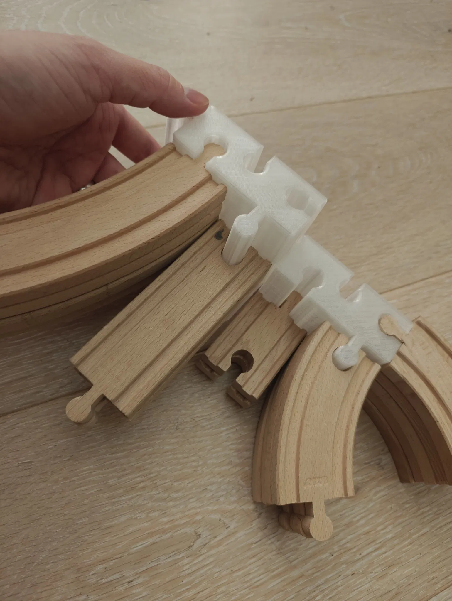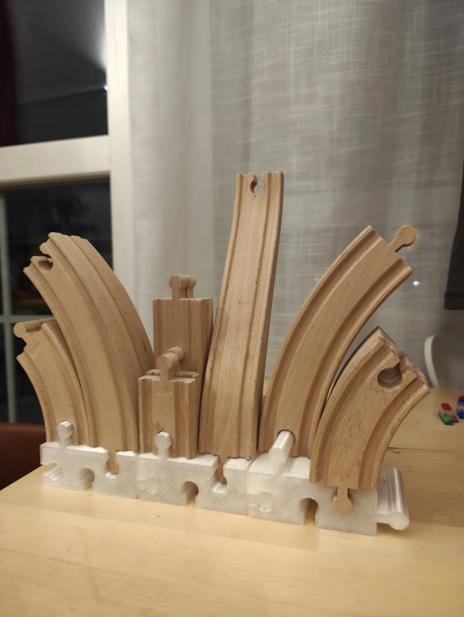 Tôi muốn sắp xếp các đường ray Brio lộn xộn. Vì vậy, tôi đã tạo ra một cái. Nếu bạn in nhiều cái này, bạn có thể kết nối chúng với nhau.