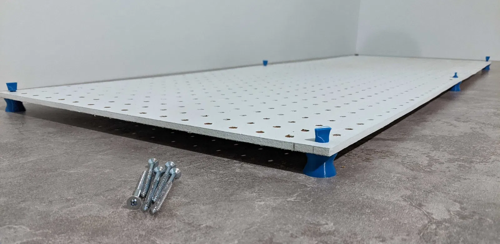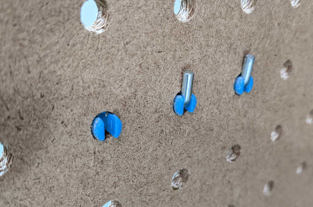 Pins giữ cho các spacer ở vị trí khi bạn gắn bảng. Bạn có thể sử dụng vít 6mm hoặc in các chốt. Những chốt này là tạm thời, bạn kéo chúng ra một lần một trong khi ấn bảng ghim vào tường và đặt một cái vít. Nếu chúng quá lỏng thì hãy đặt một chút băng dính hoặc giấy vào lỗ trung tâm của spacer khi bạn chèn chốt. Nếu chúng quá chặt, hãy khoan lỗ spacer hoặc mài một chút các chốt.