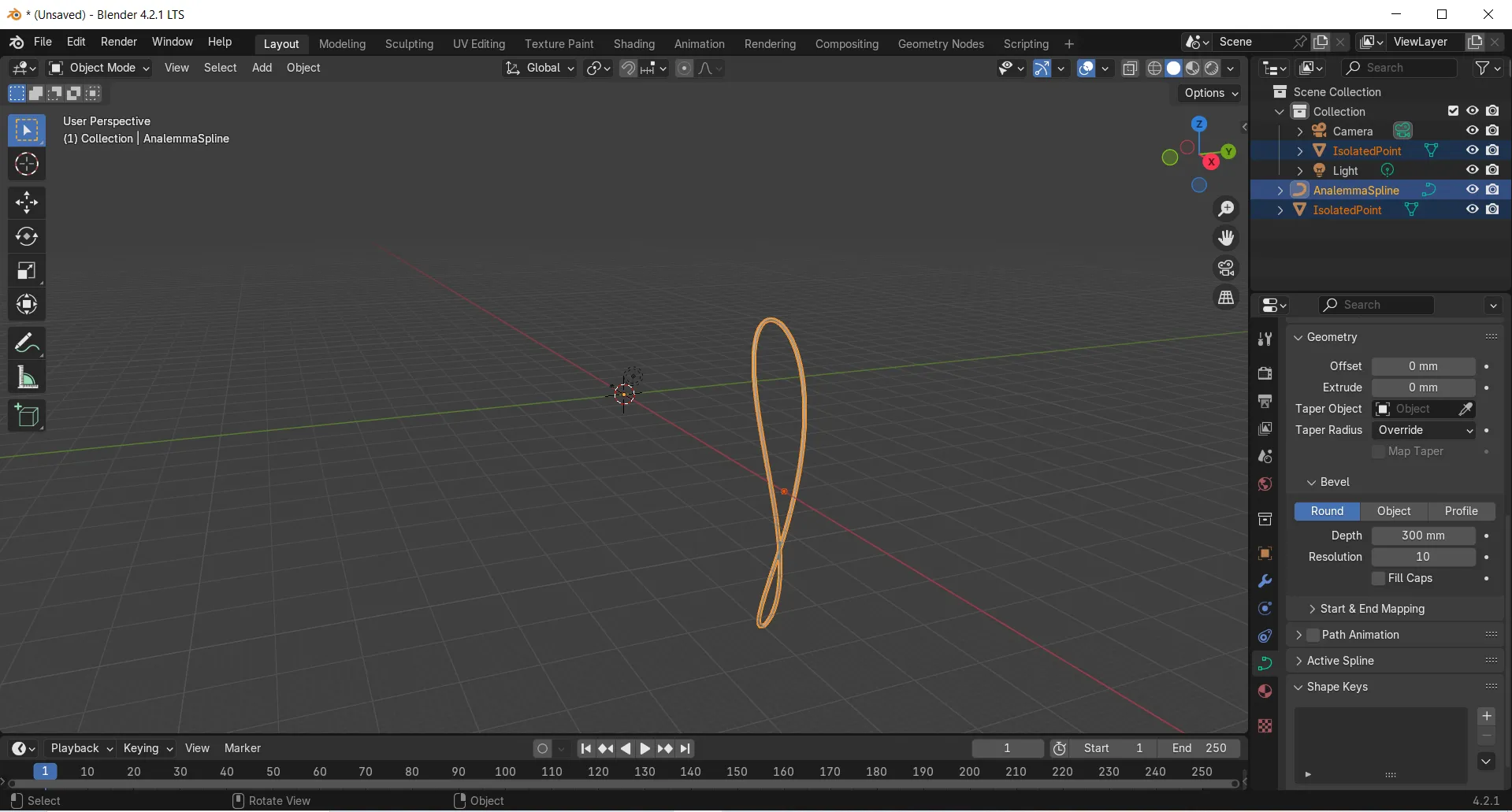 - Trong phần Hình học, bạn có thể sửa đổi Độ sâu Bevel và Độ phân giải theo nhu cầu. Một điểm khởi đầu tốt là độ sâu Bevel khoảng 300mm và độ phân giải là 10 để tạo cho đường cong một vẻ ngoài mịn màng. Đừng bị đánh lừa bởi kích thước độ sâu bevel. Blender hoạt động theo mét nên 300mm không phải là một bevel quá lớn. Khi bạn xuất đường cong, mọi thứ sẽ đến với tỷ lệ đúng. Analemma của bạn bây giờ nên trông như thế này trong Blender: