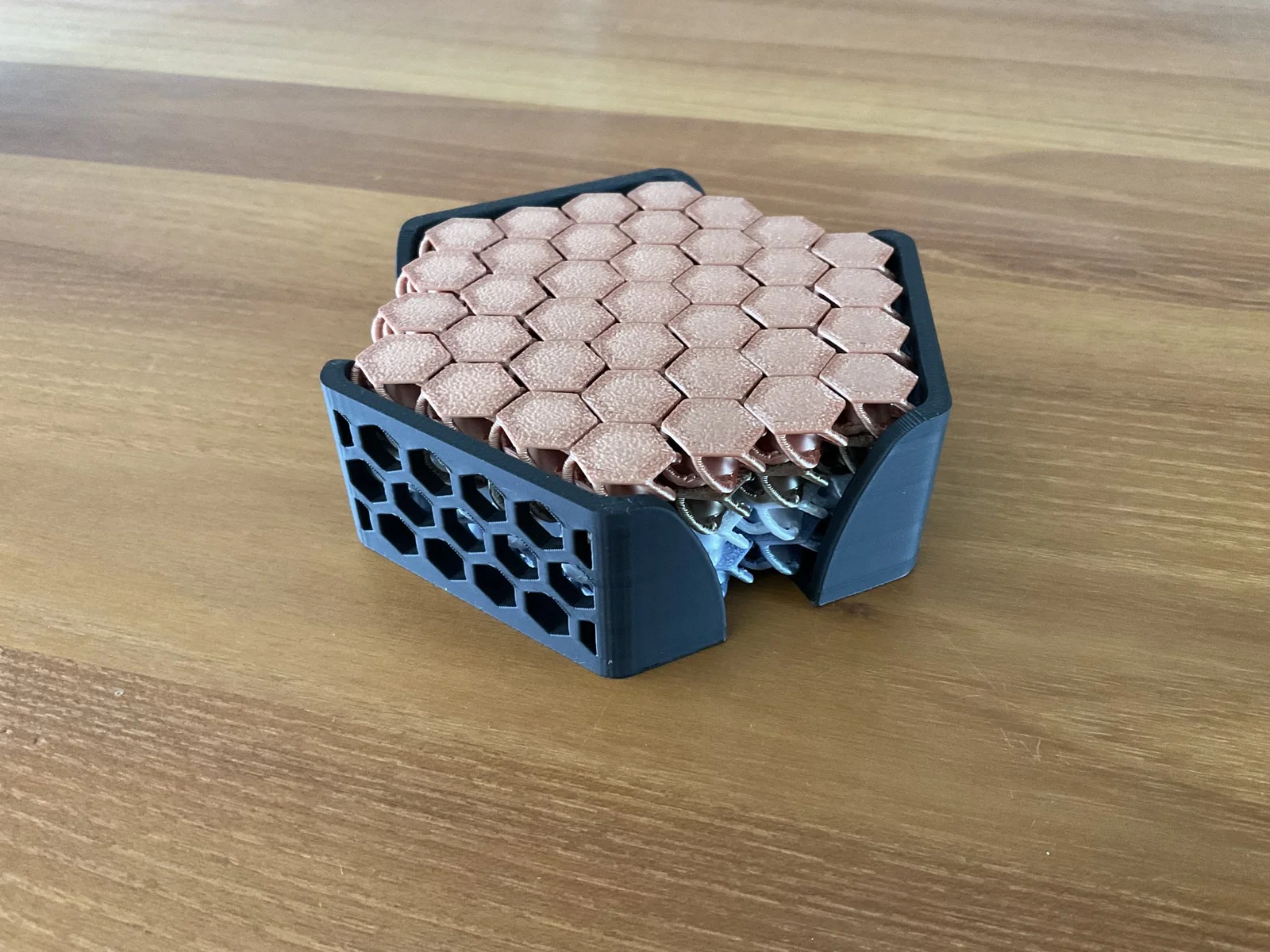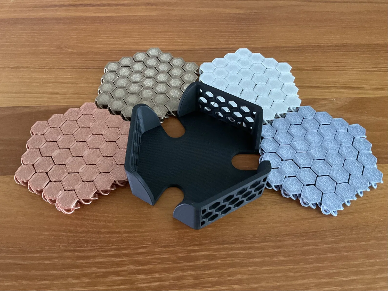 Câu chuyện Mô hình Nasa Chainmail Hex <> của https://www.f3d.vn/profile/tooclewell thật tuyệt vời, tôi đã in (quá) nhiều cái : ) Chúng không chỉ rất thỏa mãn khi nhìn và chơi với chúng mà còn tạo ra những đế lót ly tuyệt vời! Chắc chắn là một bổ sung phong cách cho bất kỳ bàn ăn hoặc khu vực tiếp khách nào! #### Thiết kế của tôi Để có thể cất chúng đi một cách gọn gàng, tôi đã thiết kế giá đỡ đế lót ly này có thể chứa tối đa bốn đế lót 4x4. Tôi đã cố gắng giữ đúng chủ đề hình lục giác của các đế lót ly và hình lục giác đang chiếm lĩnh thế giới, vì vậy hãy cùng đón nhận nó :D #### Hướng dẫn in ấn Bạn nên có thể in mô hình không cần hỗ trợ, viền hoặc bè. Đây sẽ là một bản in rất dễ dàng. Sử dụng cài đặt in thường lệ của bạn, đây là những gì tôi đã sử dụng: - Chiều cao lớp: 0.2 mm