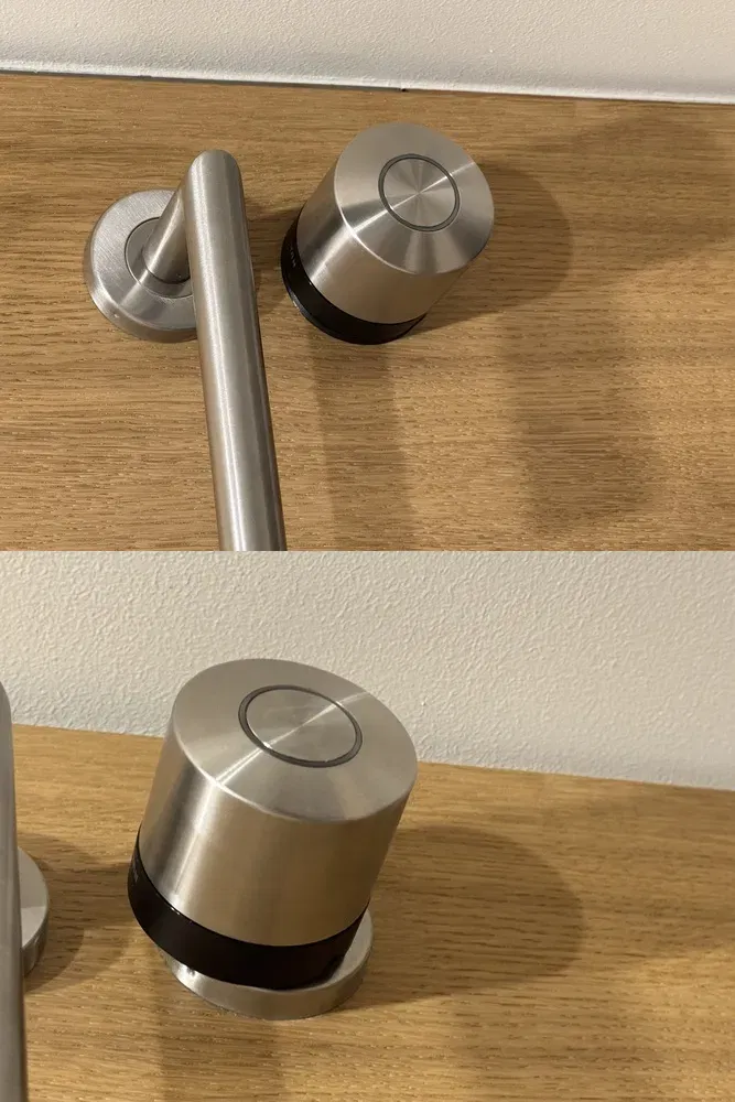 Bảng Nuki Ultra không lắp phẳng với cửa khi được lắp đặt trên một khóa eurolock. Bảng này được thiết kế để thay thế rosette gốc của khóa.