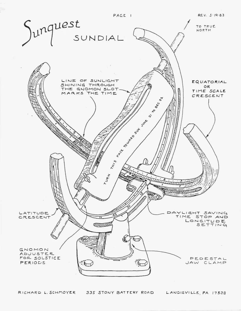 Giới thiệu Thiết kế ban đầu của đồng hồ mặt trời “Sunquest” được lấy cảm hứng từ một hình cầu armillary truyền thống, với một trục song song với trục của Trái Đất và nhiều vòng tròn lồng vào nhau đại diện cho vĩ độ, kinh độ, xích đạo thiên thể, đường hoàng đạo, và nhiều hơn nữa. Thiết kế gnomon được trình bày ở đây là một phiên bản đơn giản/hay thay thế của gnomon Schmoyer gốc, như đã mô tả trong bài viết Scientific American năm 1959; (xem tài liệu tham khảo bên dưới). Nó cũng không có điều chỉnh cho các độ lệch kinh độ từ các kinh tuyến Giờ chuẩn, hoặc Giờ tiết kiệm ánh sáng ban ngày (DST) như thiết kế ban đầu. #### Lịch sử thay đổi Cập nhật (02-08-25): Các chữ số trên vầng trăng vĩ độ đã được thay đổi để đại diện chính xác cho vĩ độ thực tế của người quan sát so với vĩ độ ngược. Tìm tệp có tên: sunquest_latitude_scale_crescent_v2 Nếu bạn muốn tiếp tục sử dụng vầng trăng vĩ độ ban đầu của mình, bạn sẽ cần trừ 90 độ từ vĩ độ thực tế của bạn & sử dụng số này để thiết lập thang đo vĩ độ của đồng hồ mặt trời. Ví dụ: 90 - vĩ độ của người quan sát (50 độ) = 40 độ ← đặt giá trị đọc vầng trăng vĩ độ về số này. Cập nhật (05-01-24): Thêm hỗ trợ cho cả bán cầu bắc & bán cầu nam. Nếu bạn sống ở bán cầu nam, hãy chắc chắn sử dụng mặt đồng hồ bán cầu nam & giá đỡ gnomon, cái mà ghi nhãn các mùa đúng cho các tháng tương ứng trên gnomon. Gnomon analemma tự nó có thiết kế giống nhau cho cả bán cầu bắc và nam. Bạn chỉ cần xoay gnomon analemma theo chiều ngược lại 180 độ để phần hẹp của đường cong hướng về phía phần trên của đồng hồ mặt trời. Tham khảo hướng dẫn lắp ráp để làm rõ. Hình 1: Đồng hồ mặt trời Sunquest gốc của Richard L. Schmoyer, 1959, như đã được giới thiệu trong Scientific American. Sunquest nguyên bản được chế tạo từ các đúc đồng hoặc nhôm & được cung cấp dưới dạng lắp ráp hoặc dạng bộ. Nó bao gồm các thành phần sau: - một gnomon, hoặc thiết bị tạo bóng;