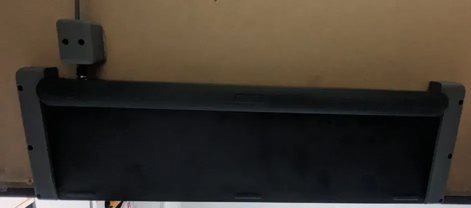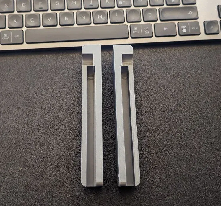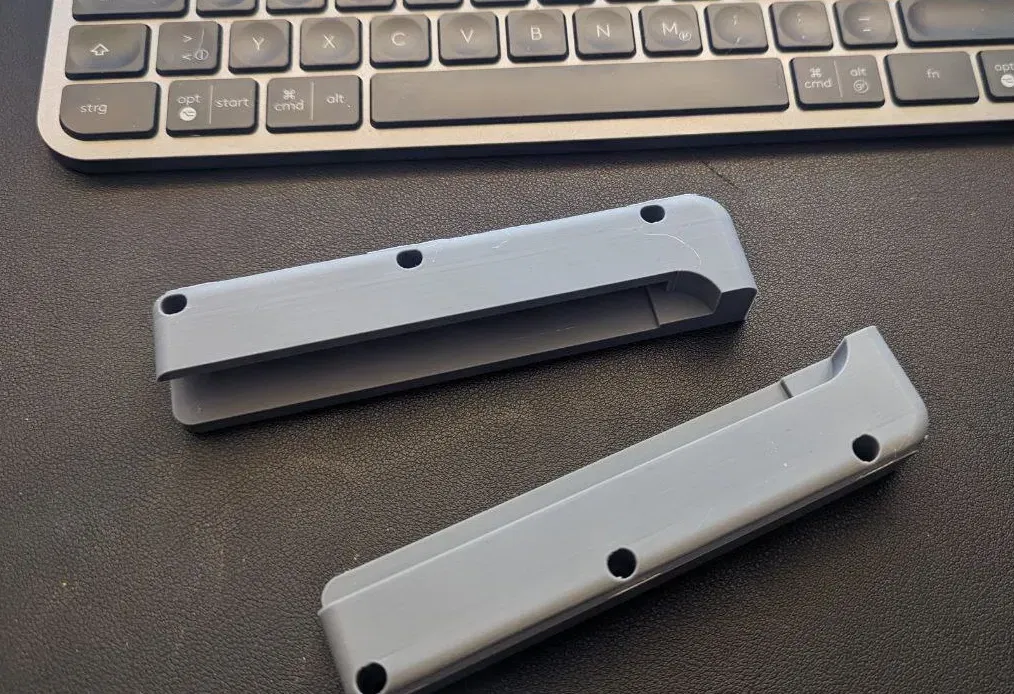 Halterung cho bàn phím Logitech MX-Keys để gắn dưới mặt bàn (có thể dùng vít hoặc keo) Ngoài ra, tôi còn đính kèm một giá đỡ cho cáp sạc USB, cái này kết hợp với một đầu nối từ tính sẽ tự động sạc bàn phím khi nó được gắn vào.