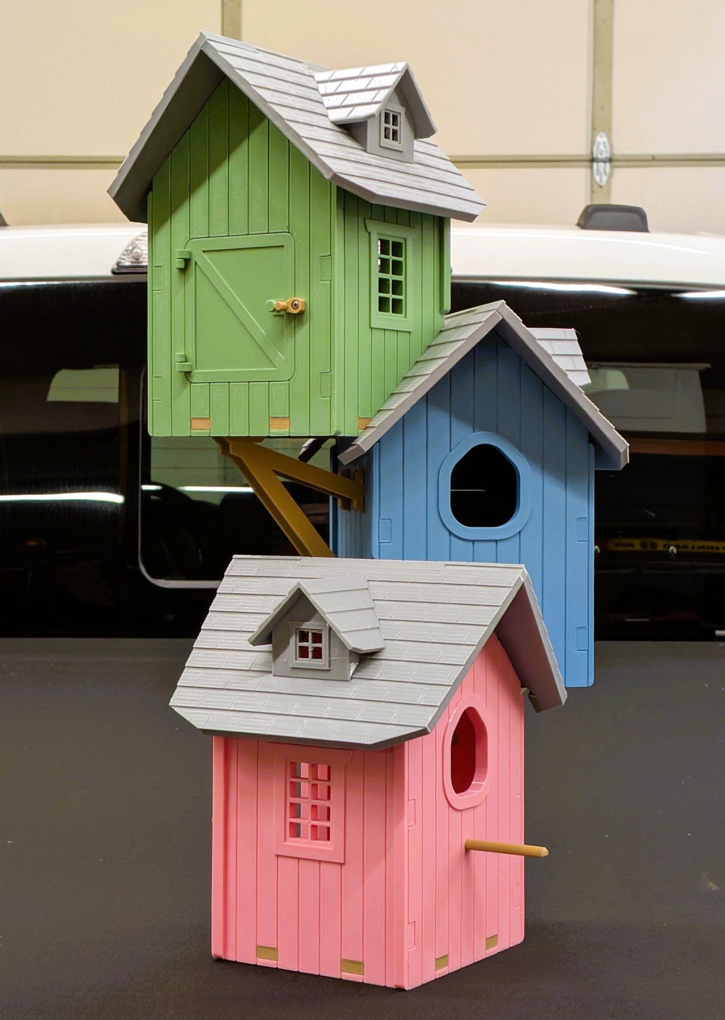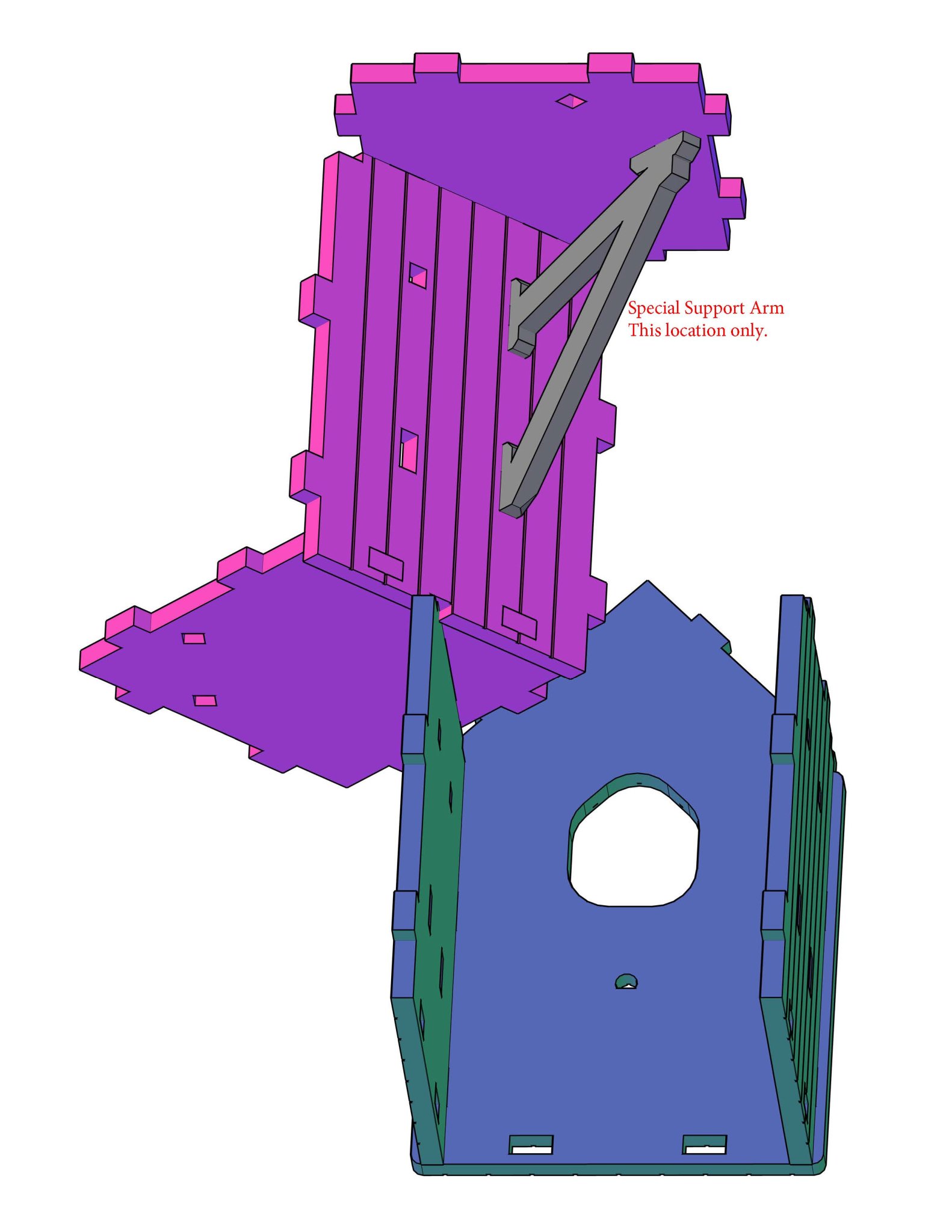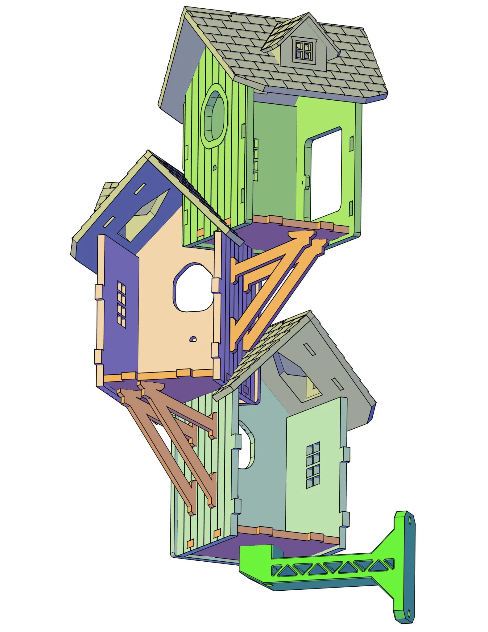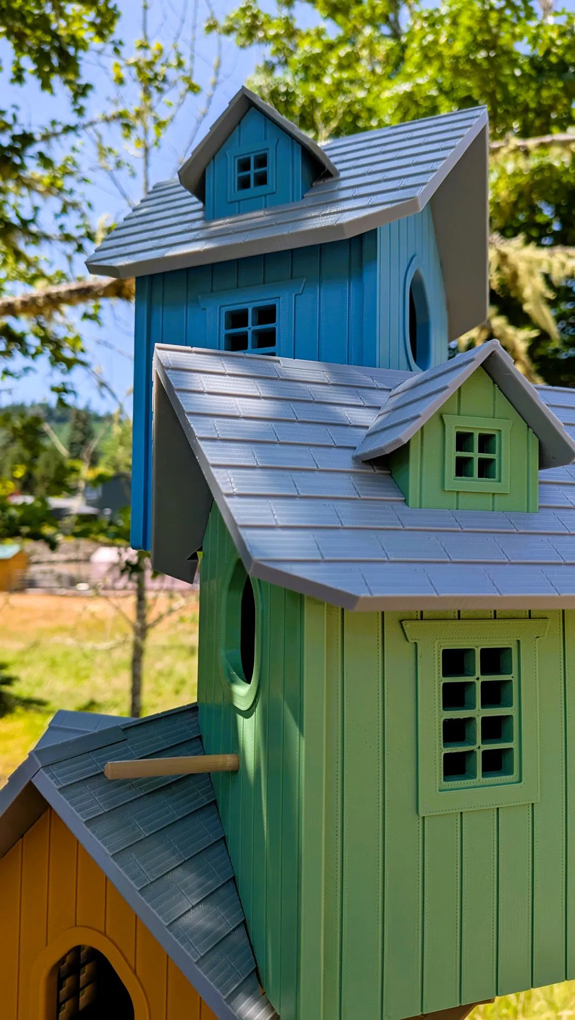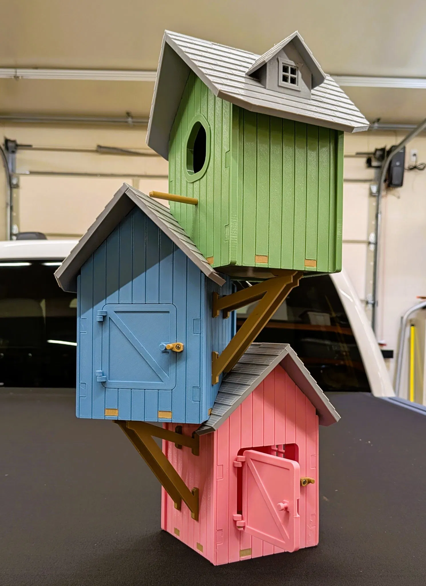Một thiết kế nhà chim thú vị mà tôi đã nghĩ ra ban đầu để làm bằng gỗ sử dụng máy cắt laser của mình. Tôi đã chuyển đổi các bản vẽ 2D của mình thành các khối 3D để in 3D. Rõ ràng, một vật liệu bền bỉ ngoài trời như PETG (cái mà tôi đã sử dụng), ASA, v.v. là được khuyến nghị. Tôi đã in với 2 viền và 15% độ đầy lưới. Tôi cũng đã sử dụng một viền cho các thành phần bên và mái để giúp tăng cường độ bám dính, ngay cả với CoreOne. Một số (trên MK4S của tôi) vẫn có một chút nâng lên. Trong các bức ảnh, ngôi nhà dưới (màu xanh hạt dẻ) là phiên bản đầu tiên của tôi, với các bên mịn màng nhưng tôi đã sử dụng một SVG gỗ có thể tích âm. Tôi đã quyết định đơn giản là mô hình hóa các bên với các thanh thay thế. Có hai tùy chọn cho các thành phần mái. Một cái là mịn, bạn có thể để mịn hoặc thêm một mẫu ngói như một thể tích âm như bạn có thể thấy tôi đã làm cho ngôi nhà dưới và trên. Tùy chọn khác là đã có ngói trong mô hình, vì vậy chỉ cần in như vậy (như trên ngôi nhà giữa). Tôi cũng đã thêm một "Mái gác" như một tùy chọn cho mái của ngôi nhà tầng trên. Bạn có thể làm chỉ một bên, hoặc cả hai bên. Tôi gợi ý lắp ráp mà không cần bất kỳ chất kết dính nào để bắt đầu. Sự vừa vặn khá chặt chẽ nên có thể không cần bất kỳ chất kết dính nào, nhưng vẫn hãy đợi keo vì bạn có thể muốn tháo rời khi tìm hiểu cách lắp ráp. Bắt đầu với ngôi nhà dưới, với các mảnh mái. Lắp ráp ngôi nhà giữa hoàn chỉnh, sau đó lắp đặt ngôi nhà giữa vào ngôi nhà dưới, thẳng xuống. Đối với các cánh tay hỗ trợ, có một cái đặc biệt và cần phải gắn vào ngôi nhà giữa, gần nhất với mái của ngôi nhà dưới (xem ảnh!). Sàn nhà của ngôi nhà dưới và cánh tay gắn đều sử dụng phần cứng #10 (tôi đã sử dụng ốc vít bằng thép không gỉ 10-24 và đai ốc nylock). Các cửa vệ sinh ở phía sau mỗi ngôi nhà được in tại chỗ. Có những 'Khóa cửa' nhỏ được lắp đặt bằng các ốc vít nhỏ để khóa cửa lại, và phải được xoay sao cho mặt phẳng của khóa cửa hướng về phía cửa để mở.