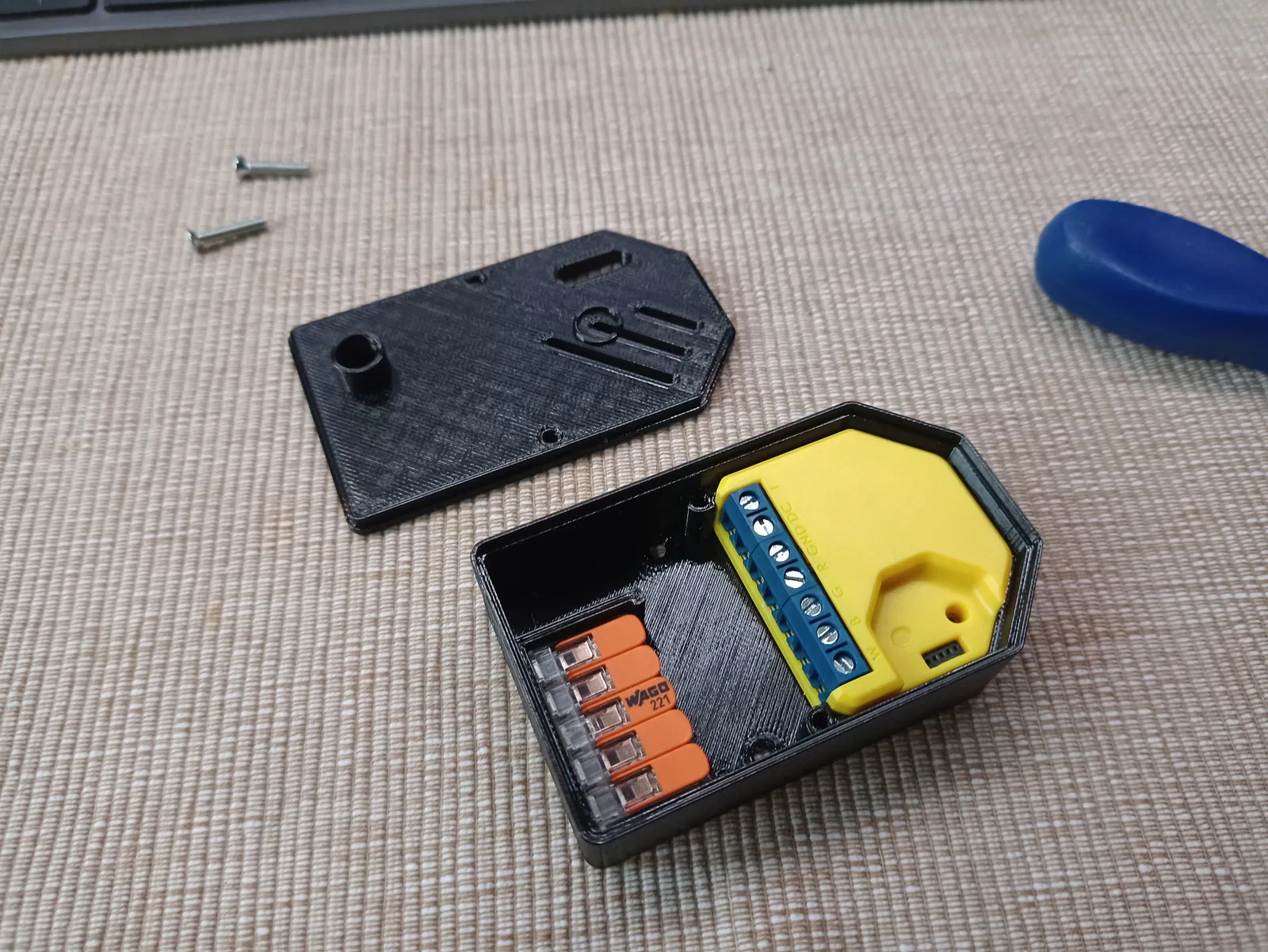 Một hộp đơn giản cho một mô-đun dimmer dải LED Shelly RGBW2 và một đầu nối chia 5 dây Wago. Các lỗ lắp bên trong cho 2 vít. Bạn cần 2 vít M3x16 đầu phẳng để lắp ráp hộp.
