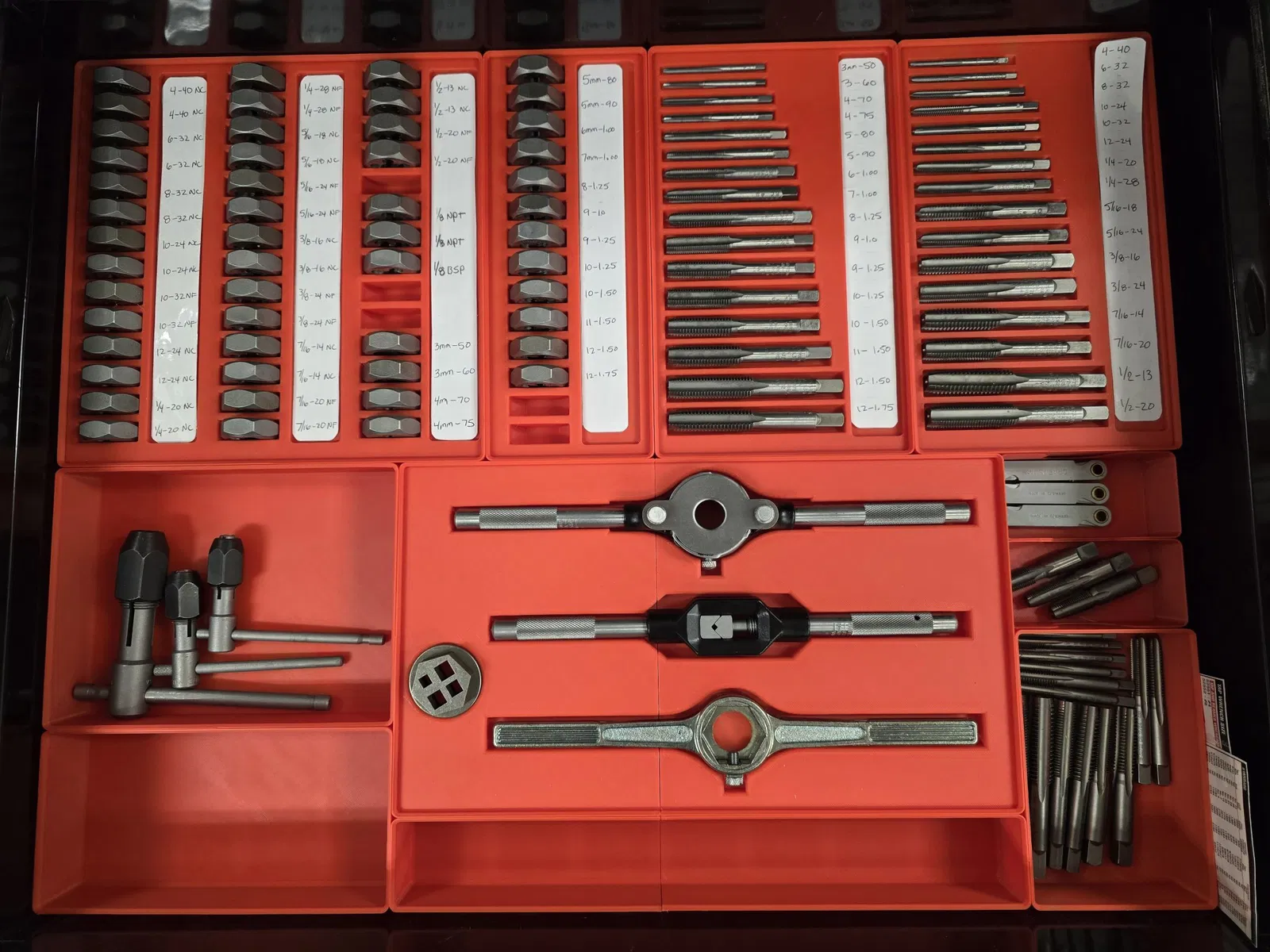 Lưu trữ Tap và Die Gridfinity. Tôi đã sử dụng plugin fusion 360 để tạo ra các thùng cơ bản và sau đó chỉnh sửa chúng để phù hợp với 2 bộ craftsman đầy đủ mà tôi có. Đây là một giải pháp tiết kiệm không gian tuyệt vời so với những hộp lớn mà chúng đi kèm. Mỗi bộ có một không gian nhãn có sẵn để bạn in một tờ hoặc chỉnh sửa để thêm kích thước. Các tệp bước được bao gồm.