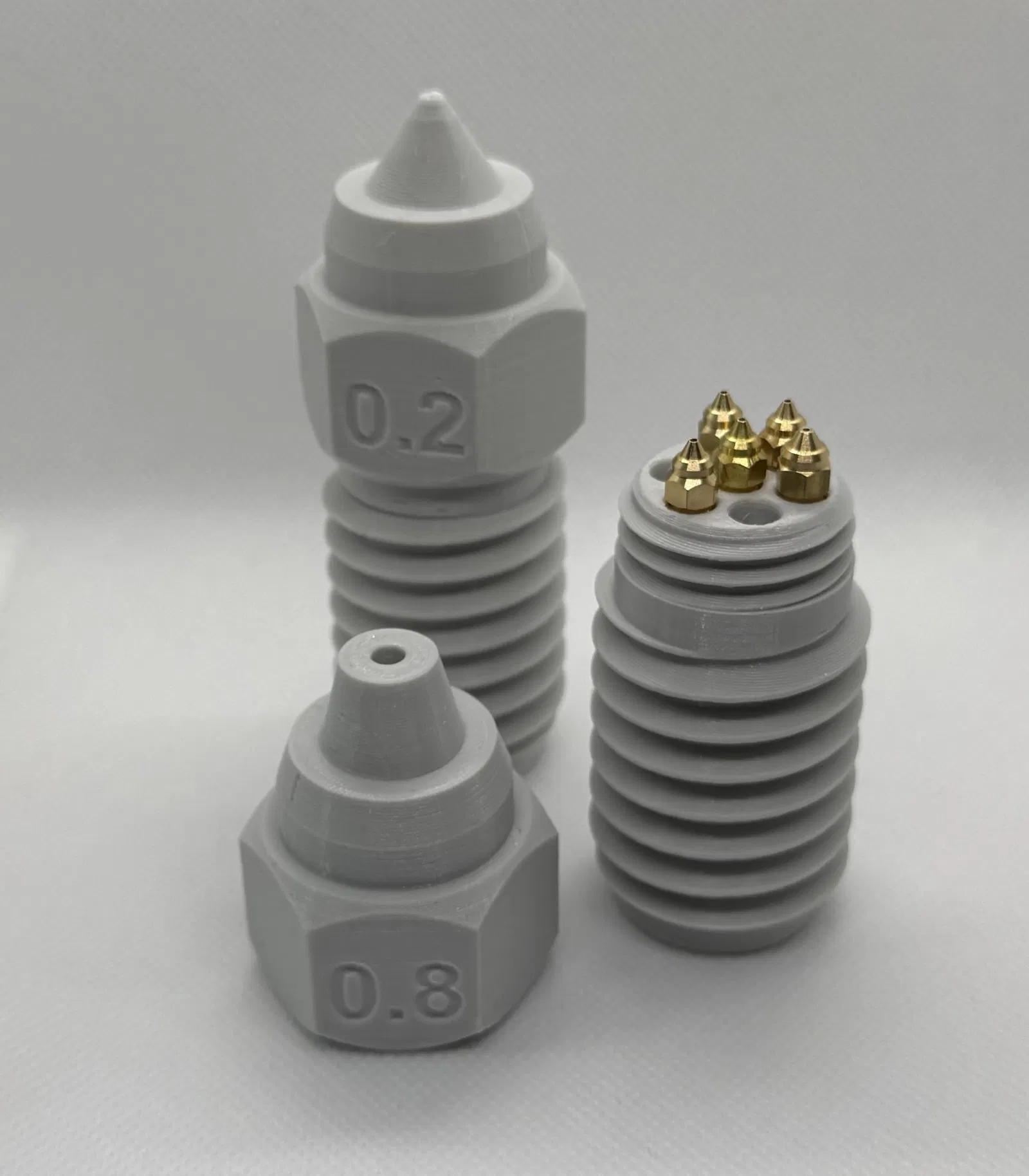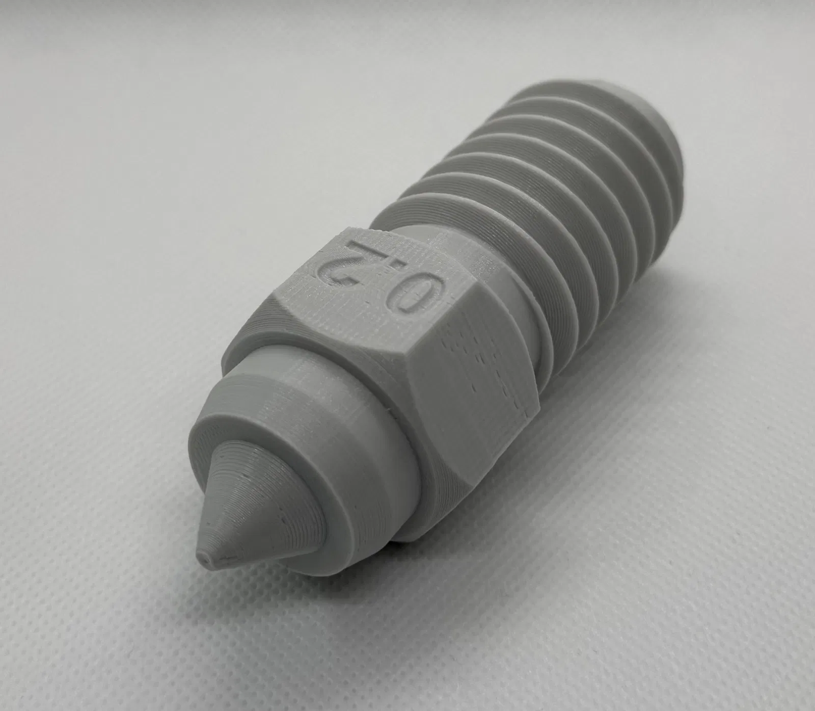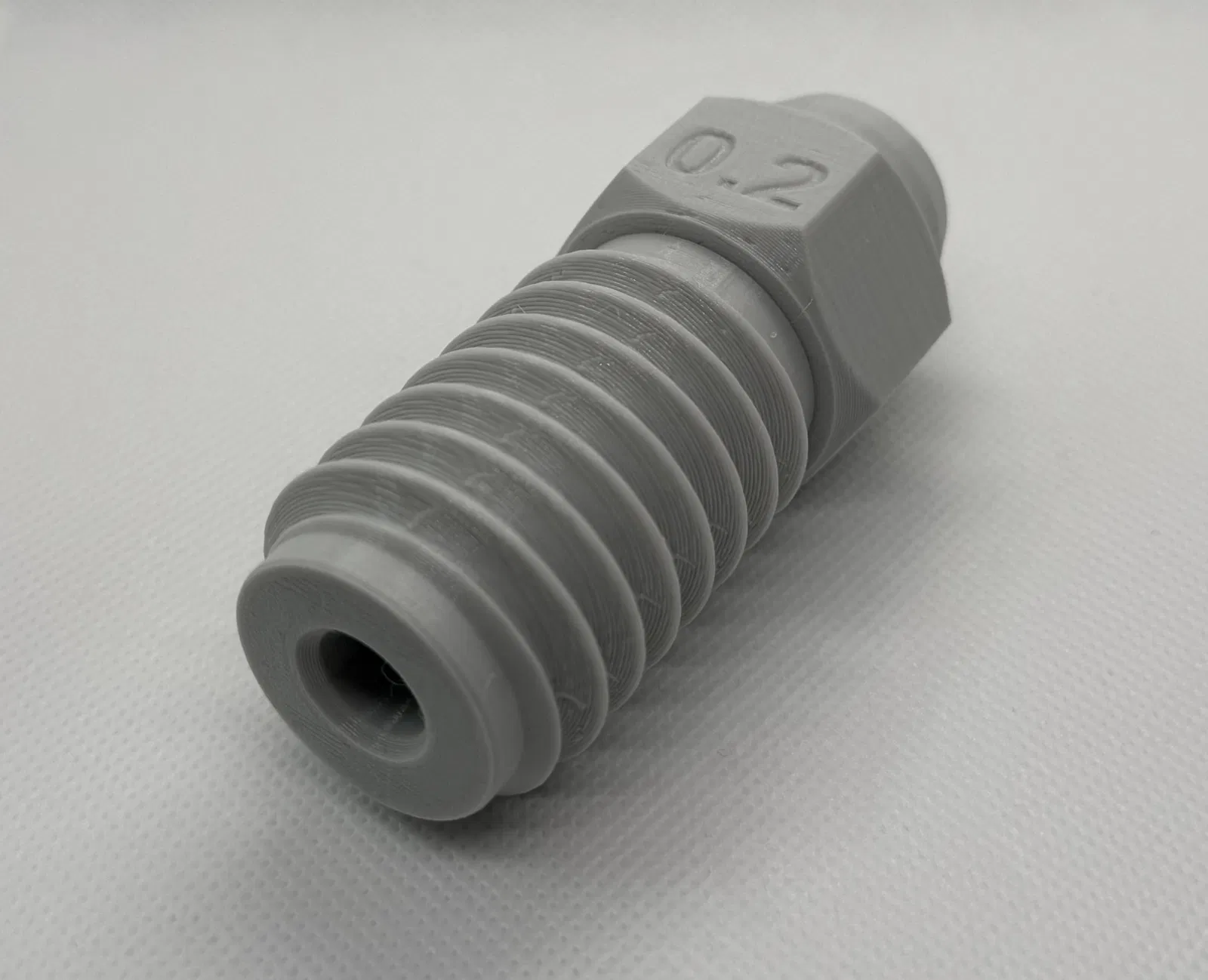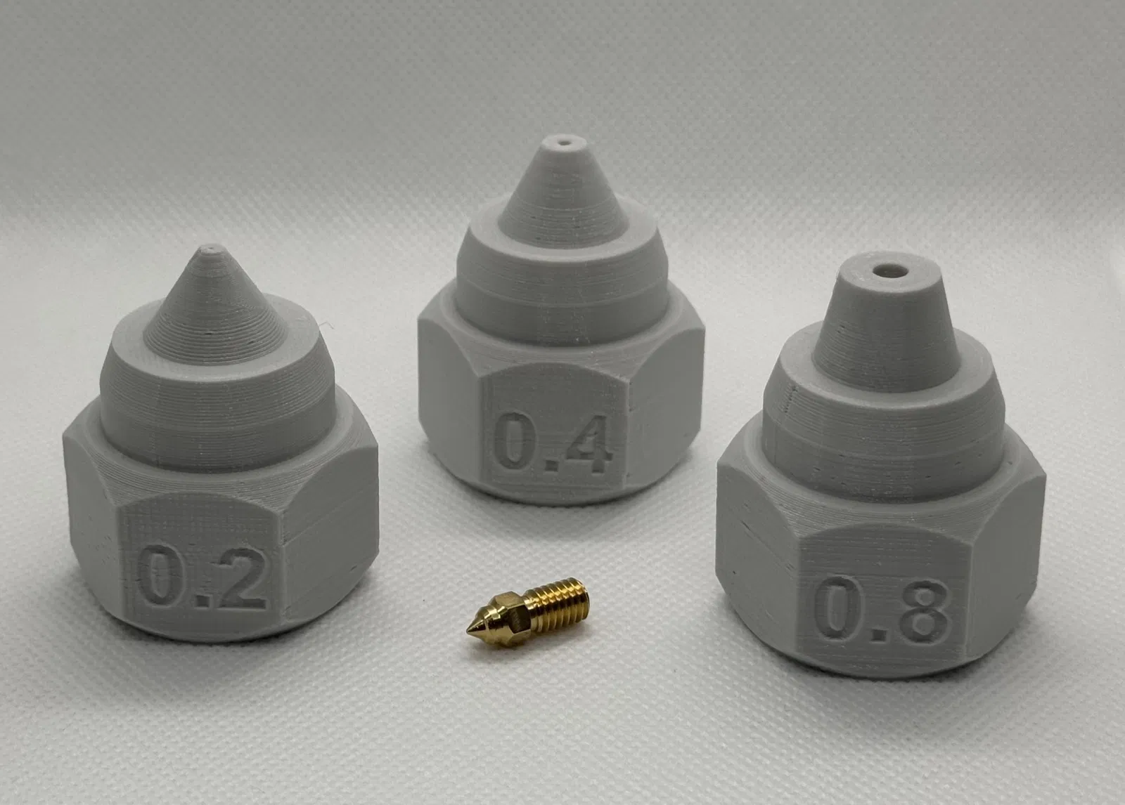 Phần trên có kích thước vòi phun được khắc chìm trên ba mặt của đai ốc lục giác, lỗ mở trong vòi phun cũng được thay đổi theo kích thước. Chọn .stl phù hợp cho kích thước cụ thể của bạn, hoặc xem ở trên để biết cách tùy chỉnh nó.