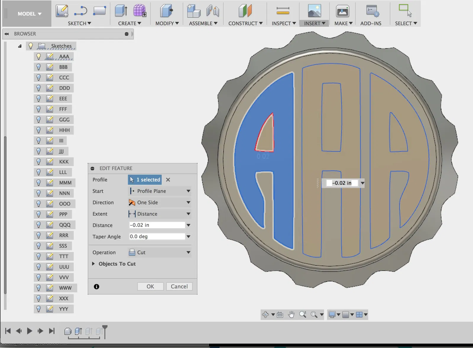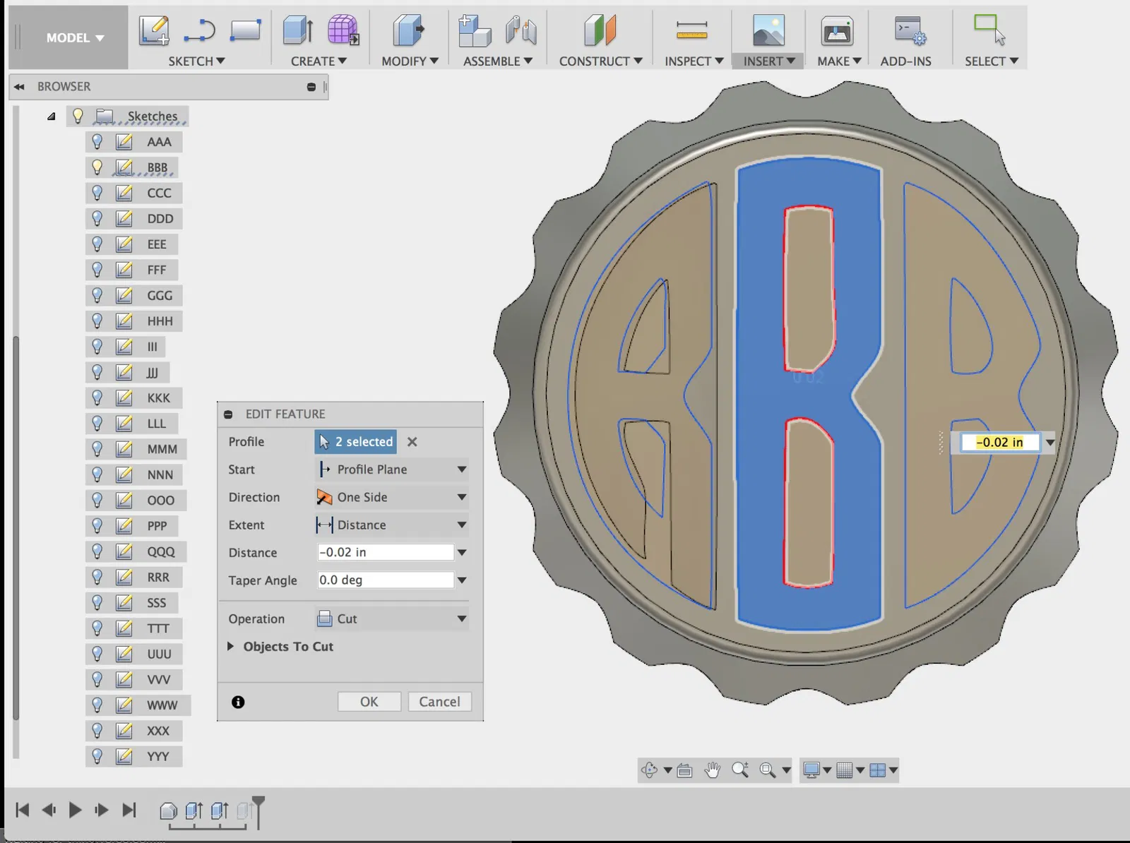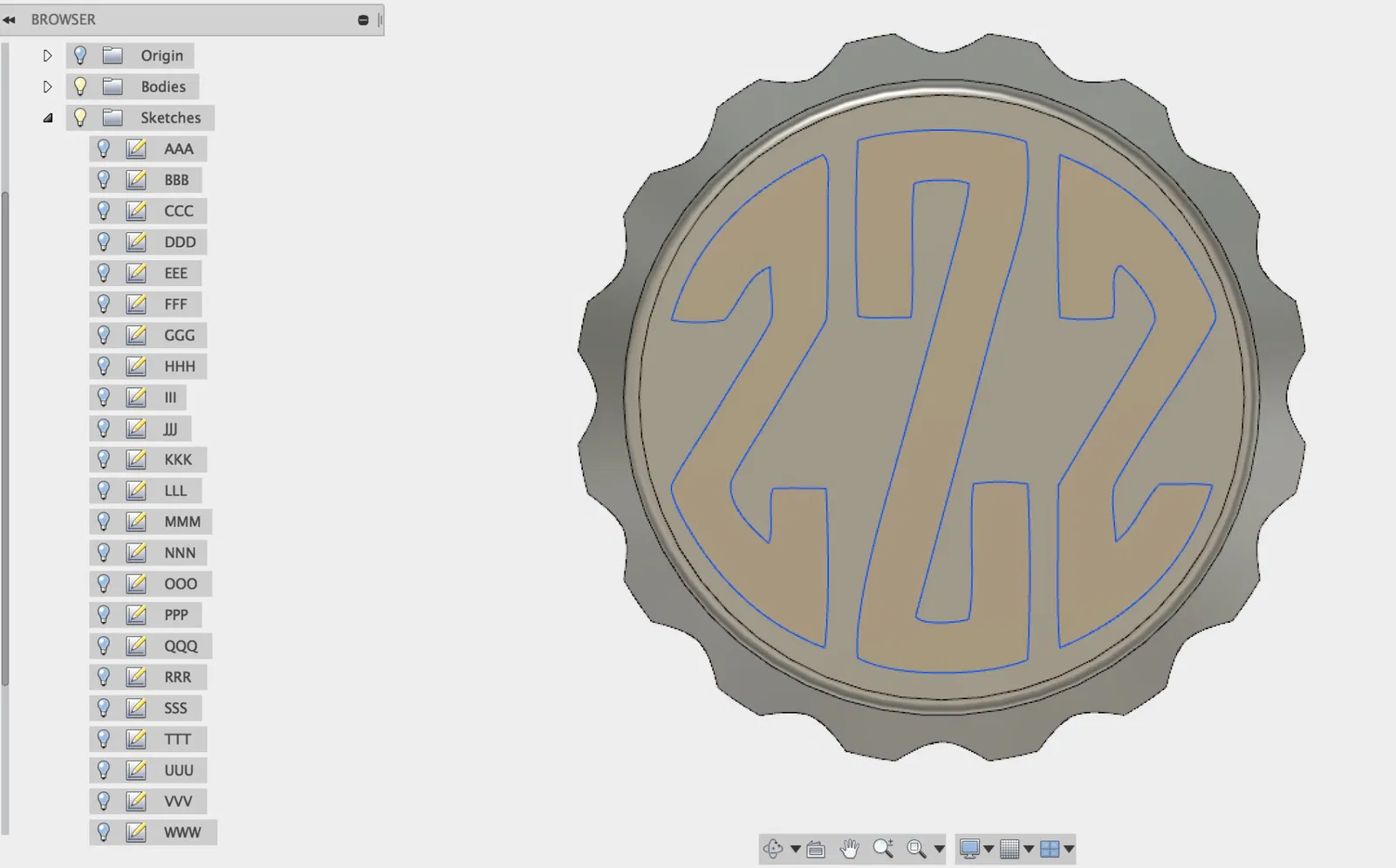 Để cá nhân hóa hộp của bạn, tải xuống tệp .f3d hoặc .step cho ốc vít. Mỗi chữ cái được lưu trữ trong một bản phác thảo riêng biệt và có thể được sử dụng để cập nhật tính năng đùn để thêm chữ cái viết tắt của riêng bạn. Chỉ cần bật bản phác thảo cho chữ cái mong muốn, sau đó nhấp đúp vào chức năng đùn và chọn lại các đường cong bản phác thảo.