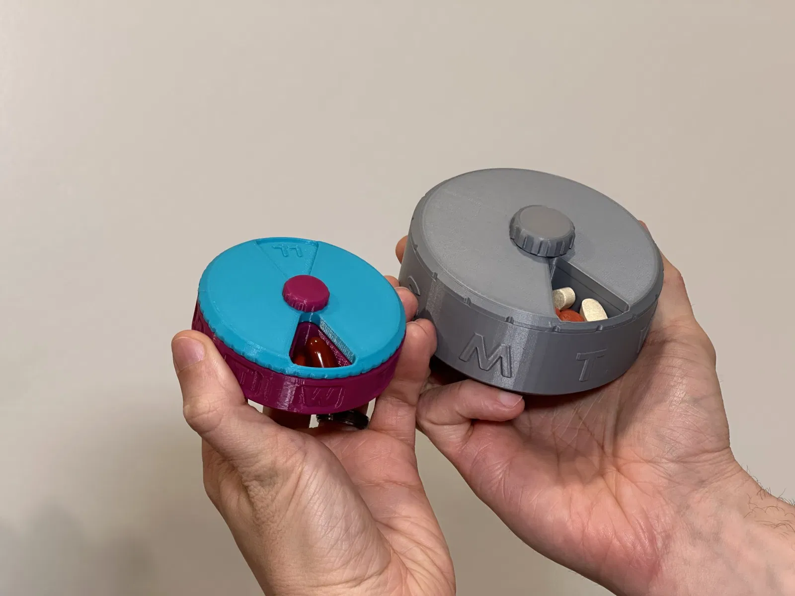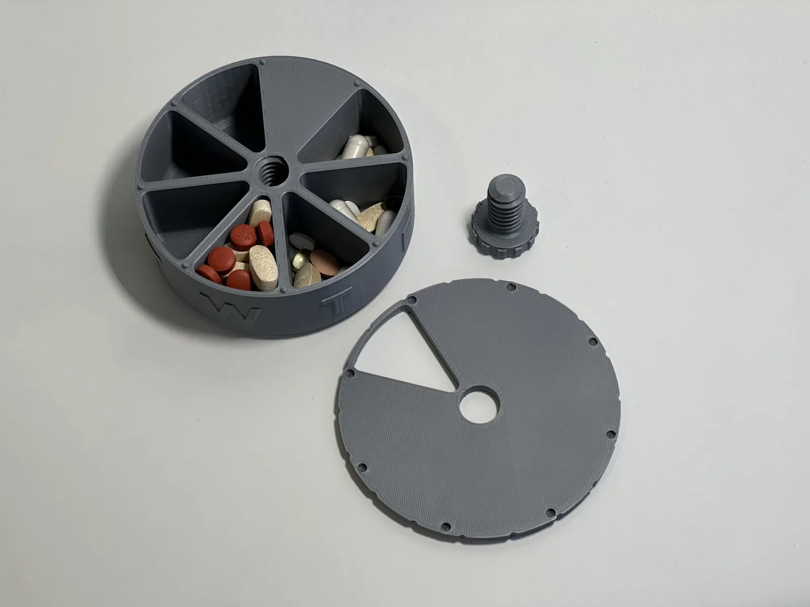 Remix của Hộp thuốc hàng tuần/Bộ tổ chức với ốc vít có chữ lót cá nhân hóa bởi printfutura, thiết kế được lấy cảm hứng từ Bộ phân phát thuốc/viên nang/viên nén 7 ngày của Jambeetle và Hộp thuốc tham số của pmoews. Tôi uống nhiều viên thuốc lớn và vitamin, vì vậy tôi đã làm hộp thuốc lớn hơn này. Tôi cũng đã sử dụng dự án này để học FreeCAD. Bức ảnh về viên thuốc trong tay tôi là số lượng vừa đủ cho một ngăn trong một ngày. Khuyến nghị sử dụng vòi phun 0.4mm hoặc nhỏ hơn để giữ cho các đầu nhô lên trên đế không bị giòn quá mức. Cập nhật ngày 25 tháng 6 năm 2023 - Đã chỉnh sửa tệp ốc vít để giảm thiểu sự tách rời của các ren khỏi đầu ốc vít.