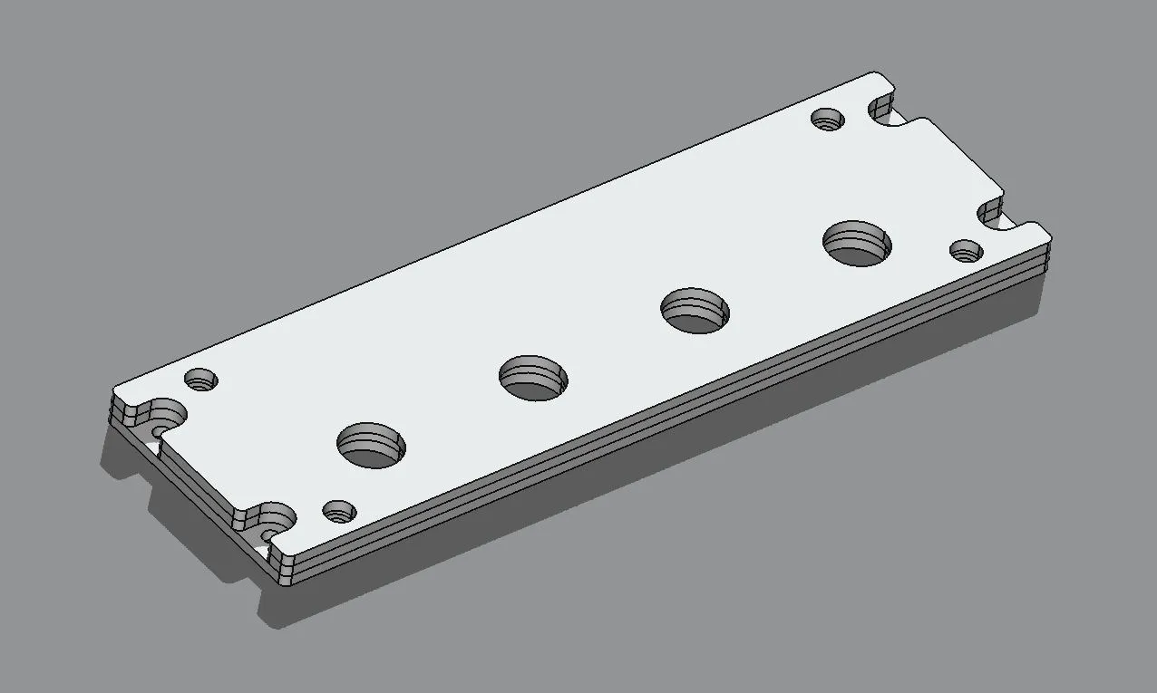 Bảng ba lớp và giá đỡ công tắc xoay. Các bảng được thiết kế để cắt CNC hoặc laser từ acrylic đúc 3mm, nhưng có thể được in 3D nếu không yêu cầu ánh sáng nền. Bảng trên 3mm Opal. Bảng giữa 3mm trong mờ. Bảng dưới 3mm trong suốt. Được thiết kế để dán lại với nhau sẵn sàng cho việc sơn và khắc. Hoặc có thể được kẹp bằng vít đầu lục giác 4mm chìm. Việc gắn vào chân đế được thực hiện bằng vít đầu lục giác 4mm. Tệp DXF và STL đều được bao gồm.