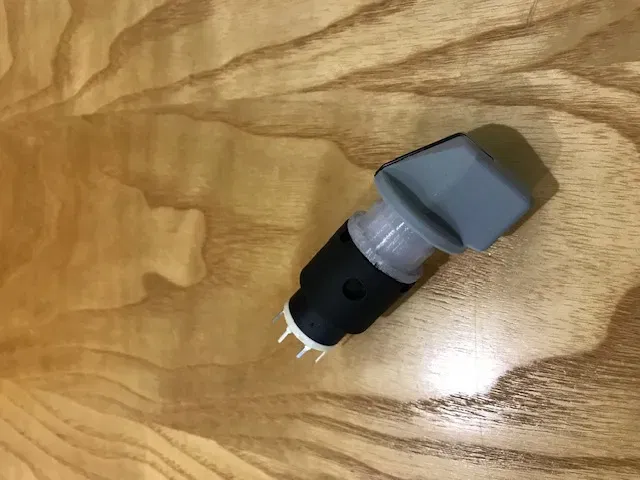 Bao gồm giá đỡ và mở rộng trục cho công tắc xoay. Đế được in bằng PLA đen. Ống ánh sáng trên và mở rộng trục bằng PETG trong suốt. Tất cả đều được in với 100% độ đầy để đảm bảo độ bền. Đế và phần trên được dán lại với nhau và sau đó được dán vào các lỗ trên Bảng dưới. Công tắc xoay được vặn vào Đế. Mở rộng trục được giữ trên trục công tắc xoay bằng vít grub 3mm. Ba đèn LED trắng 3mm có thể được chèn vào để chiếu sáng đường đánh dấu trên núm công tắc.