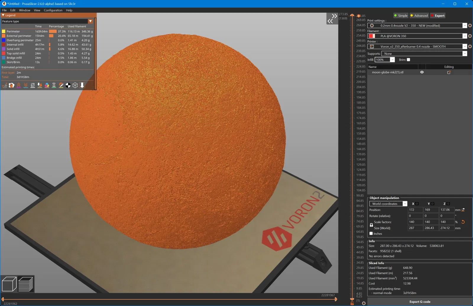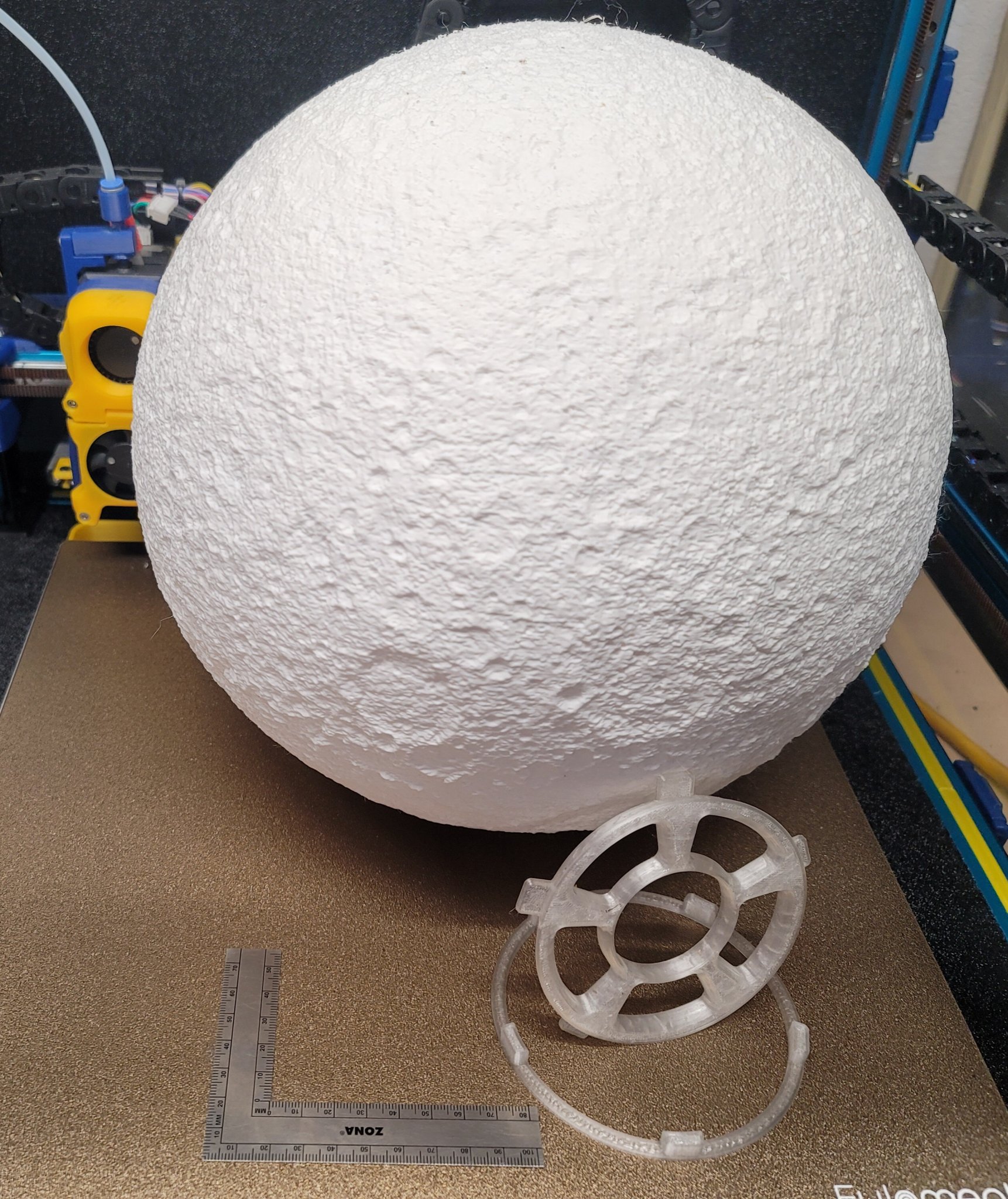 Sử dụng máy in FDM Voron 2.4r2 350x350x350 của tôi, tôi đã in một mặt trăng kích thước 287x287x274 mm mà không cần hỗ trợ bằng PLA.